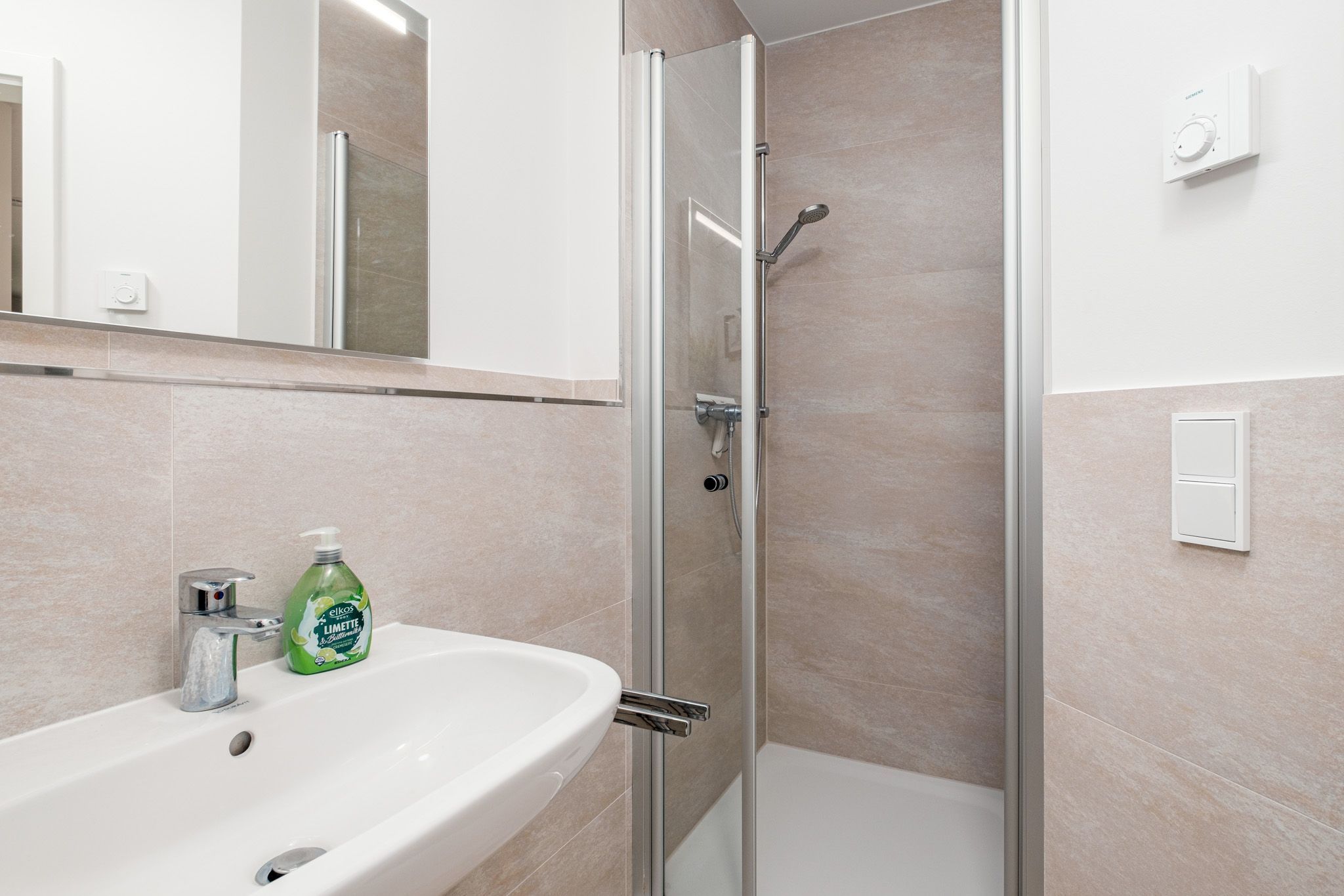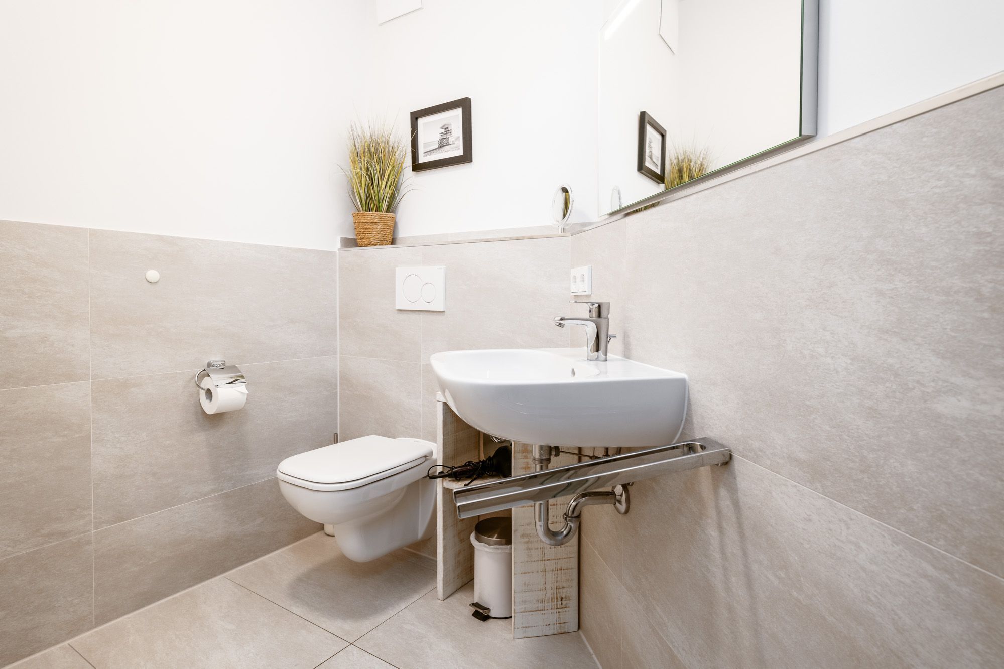 Im Badezimmer mit Dusche, WC und Waschtrockner erfrischen Sie sich nach einem erholsamen Tag am Strand.