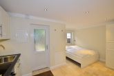 Durch die Eingangstür gelangt man in das neue kombinierte Wohn-Schlafzimmer mit offener Küchenzeile mit Backofen, Induktionskochfeld, Kühlschrank mit 3-Sterne-Gefrierfach, Geschirrspüler, Wasserkocher, Toaster und kleinem Essplatz.