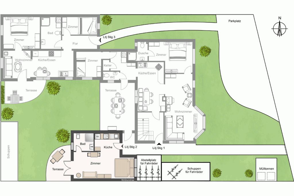 Des Weiteren gehören ein PKW-Stellplatz für EIN PKW und ein gemeinschaftlicher Fahrradabstellplatz zu dieser Ferienwohnung.