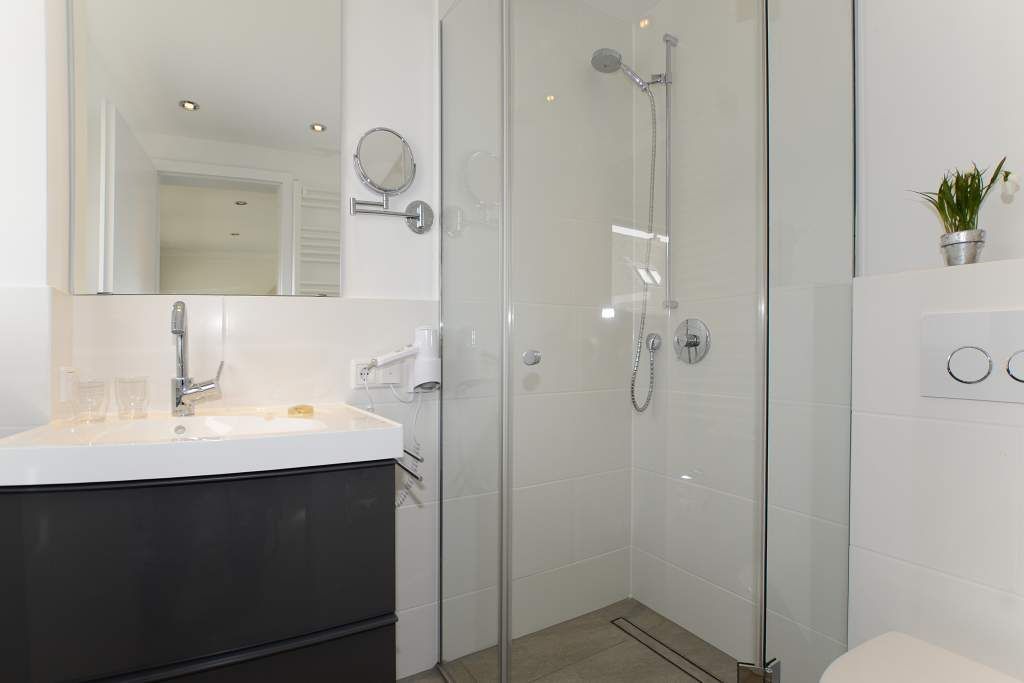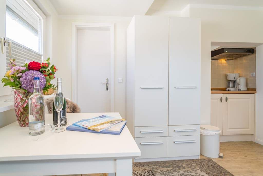 Die kleine, funktionale Küchenzeile bietet ein Ceranfeld mit zwei Kochfeldern, einen Kühlschrank sowie Kaffeemaschine, Wasserkocher und Toaster. Das modern gestaltete Badezimmer verfügt über eine Dusche, einen Waschtisch, ein WC, einen Föhn sowie einen Kosmetikspiegel.