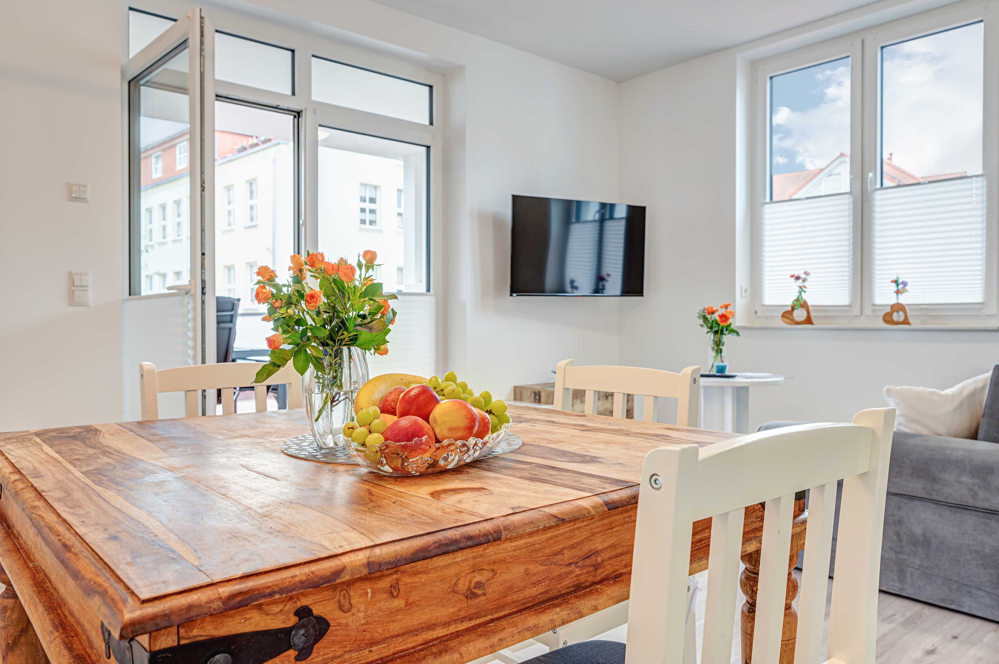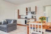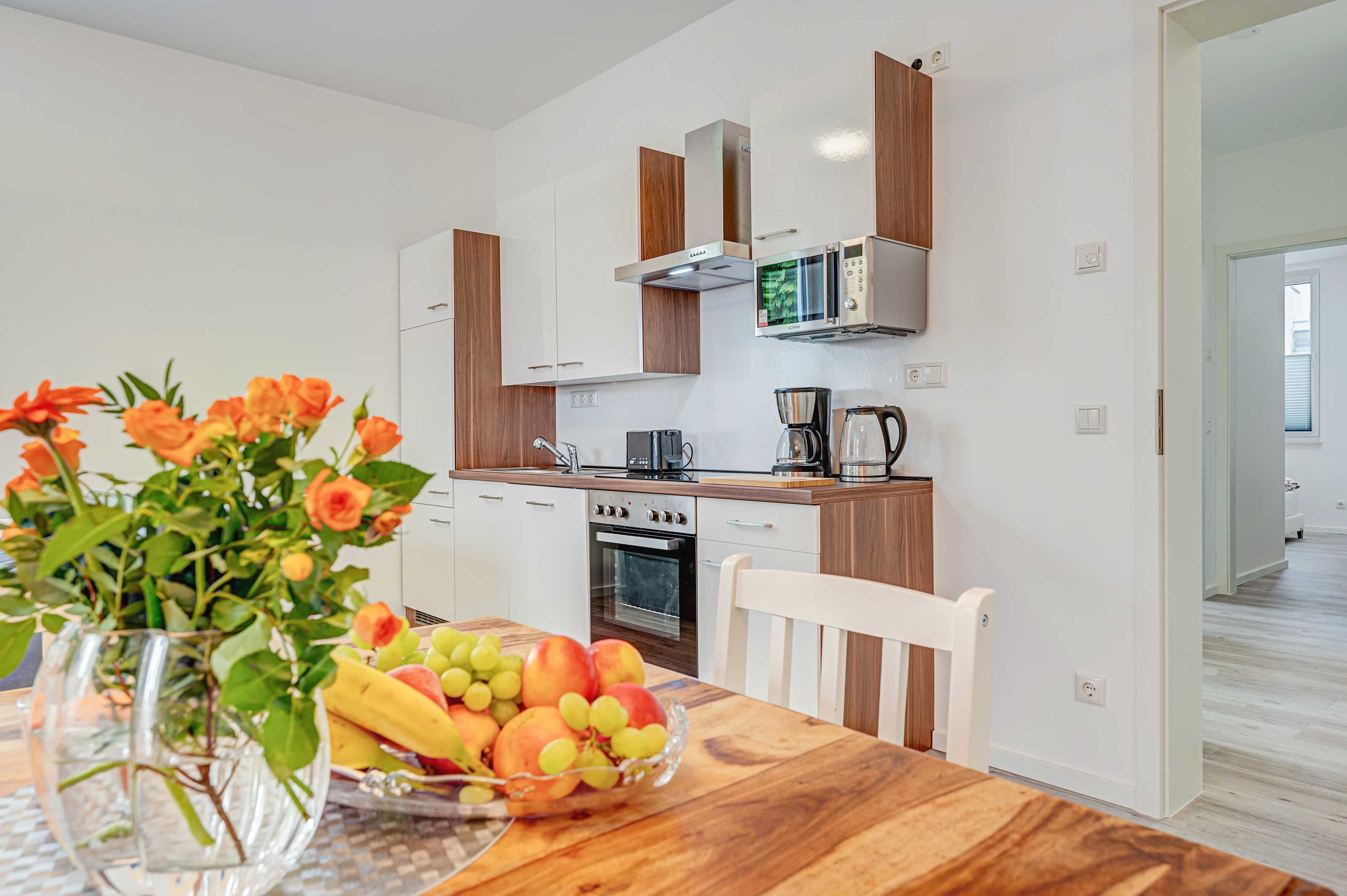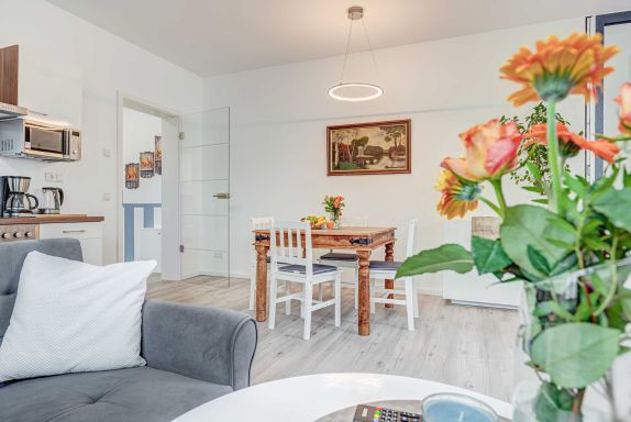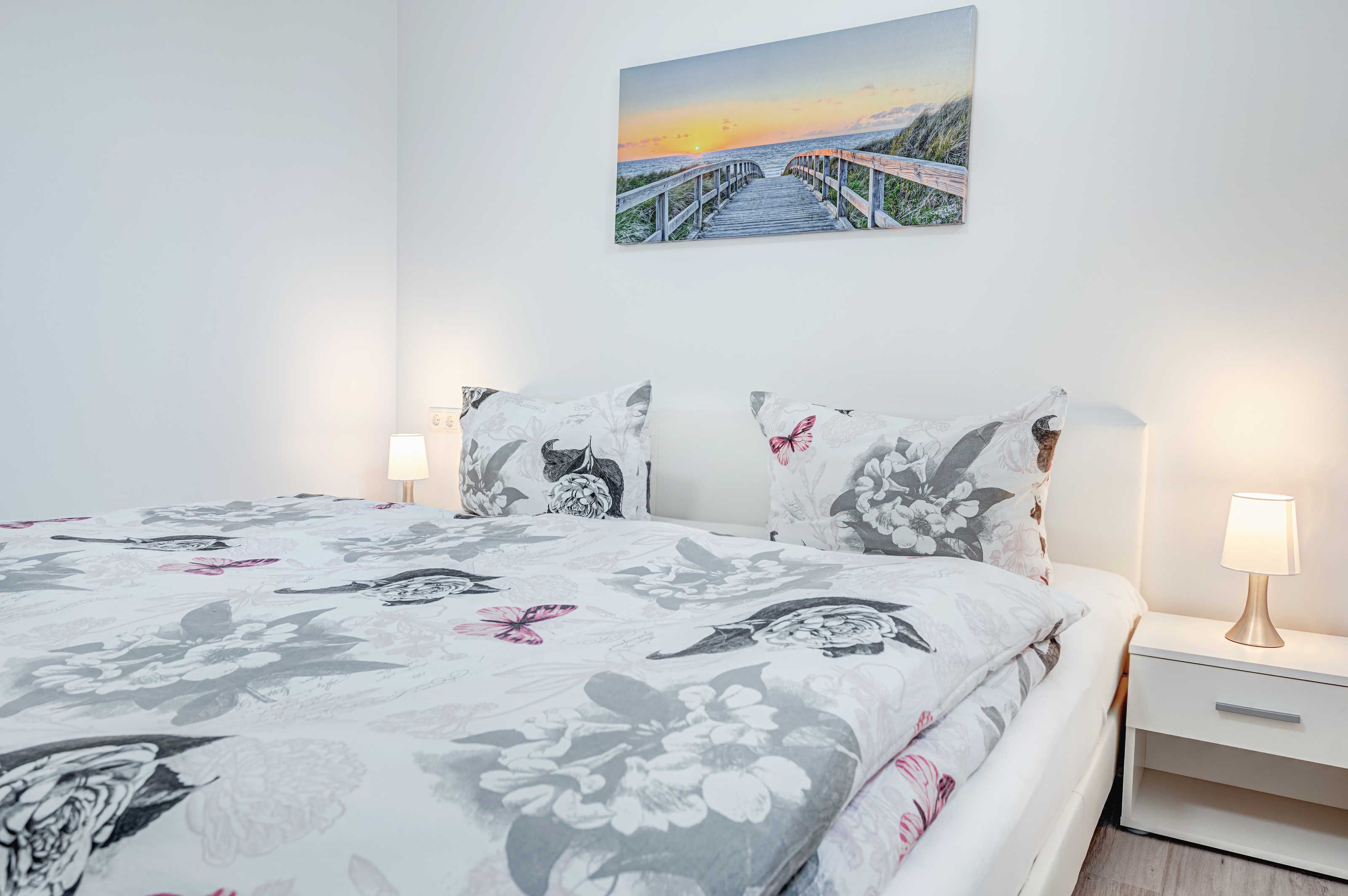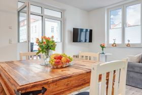 Moderne 3-Zimmerwohnung mit 75 qm Wohnfläche, Parterre. Hochwertige Ausstattung. Großer Wohn-/Essbereich mit Sofa , Esstisch mit 4 Stühlen, Flachbild-TV mit Internetradio, hochwertiger Küchenzeile Ceranplatten E-Herd, Backofen, Mikrowelle, Spülmaschine , Toaster, Wasserkocher, Kaffeemaschine. Zugang zum großzügigen Süd-West-Balkon (ca.20qm) mit Sitzgarnitur. 1xElternschlafzimmer mit Doppelbett(1,8x2,0m) 2x Nachttischen und Schwebetürenschrank. 1x kleines Kinderzimmer mit Etagenbett ( Max. 2 Kinder v.4-16J.)Kleiderschrank und Sitzgelegenheit. Bad mit WB mit Unterschrank, WC und ebenerdige Dusche und Handtuchbadheizkörper.