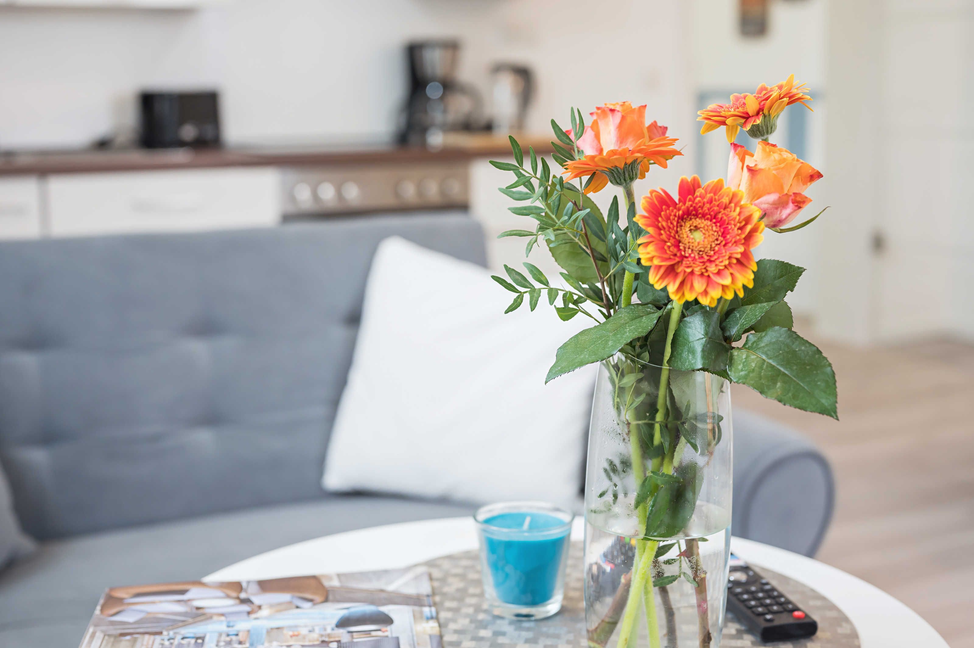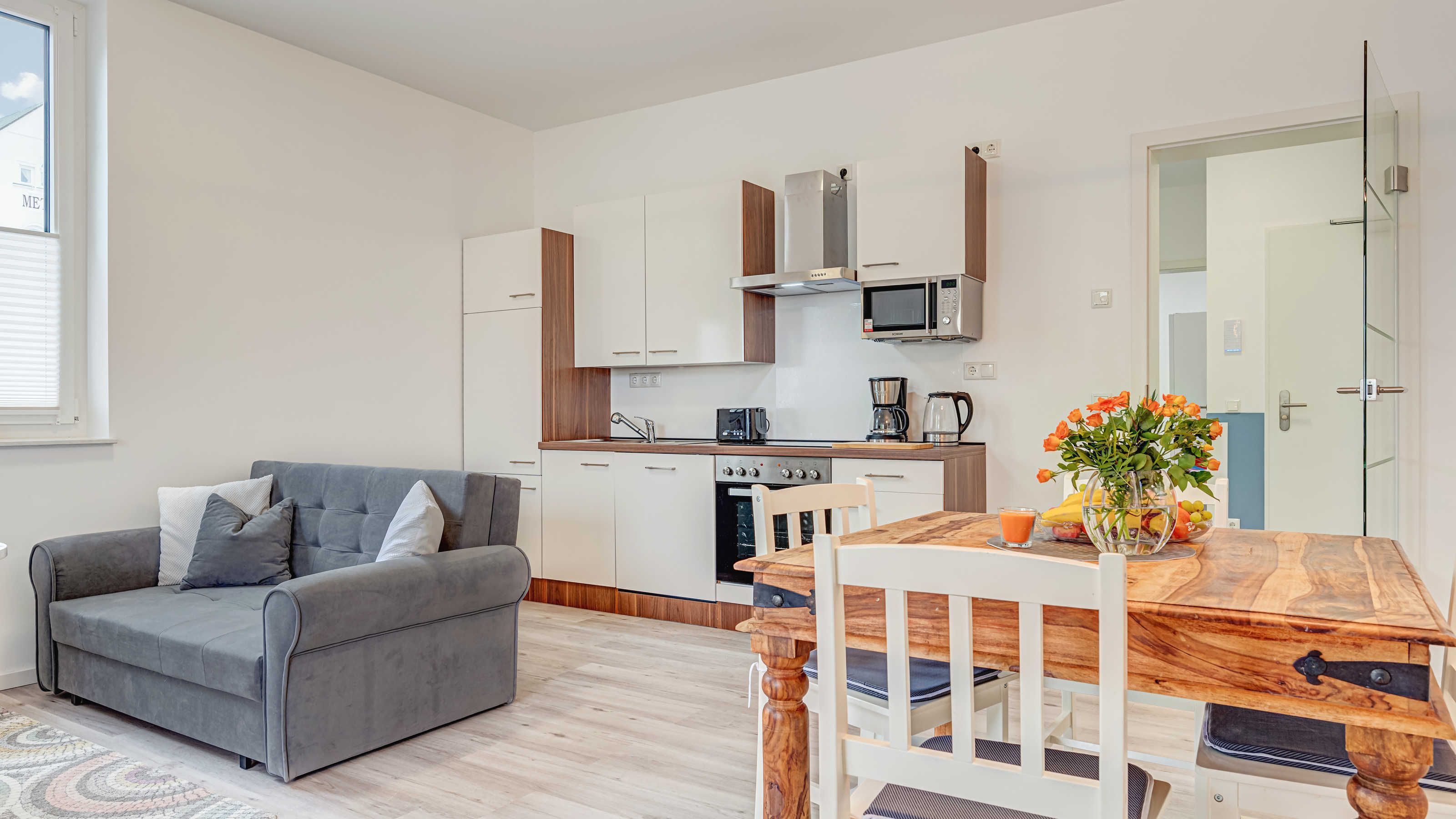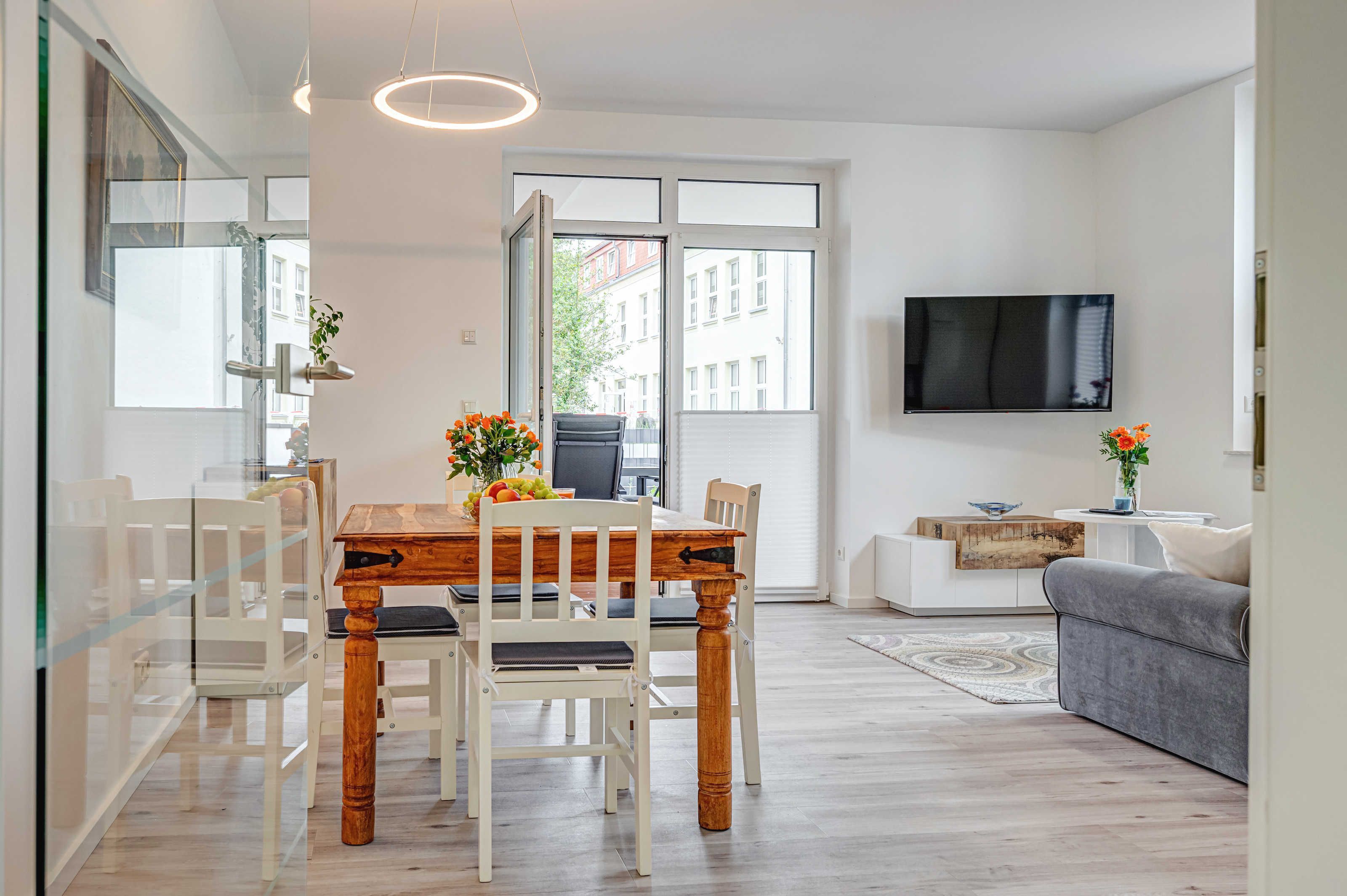 Moderne 3-Zimmerwohnung mit 75 qm Wohnfläche, Parterre. Hochwertige Ausstattung. Großer Wohn-/Essbereich mit Sofa , Esstisch mit 4 Stühlen, Flachbild-TV mit Internetradio, hochwertiger Küchenzeile Ceranplatten E-Herd, Backofen, Mikrowelle, Spülmaschine , Toaster, Wasserkocher, Kaffeemaschine. Zugang zum großzügigen Süd-West-Balkon (ca.20qm) mit Sitzgarnitur. 1xElternschlafzimmer mit Doppelbett(1,8x2,0m) 2x Nachttischen und Schwebetürenschrank. 1x kleines Kinderzimmer mit Etagenbett ( Max. 2 Kinder v.4-16J.)Kleiderschrank und Sitzgelegenheit. Bad mit WB mit Unterschrank, WC und ebenerdige Dusche und Handtuchbadheizkörper.