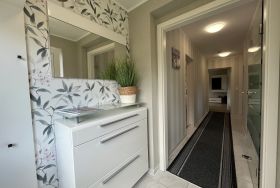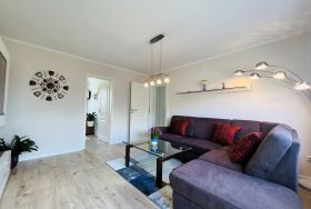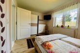 Unterkunft: Das 3-Raum-Ferienhaus mit Gartenterrasse ist ca. 63 m² gross und verfügt über ein Wohnzimmer mit Eckcouch, 1 Schlafzimmer mit Doppelbett (1,40x2m) und 1 Schlafzimmer mit Schlafcouch (1,40x2m) und bietet Platz für 3 Erwachsene.