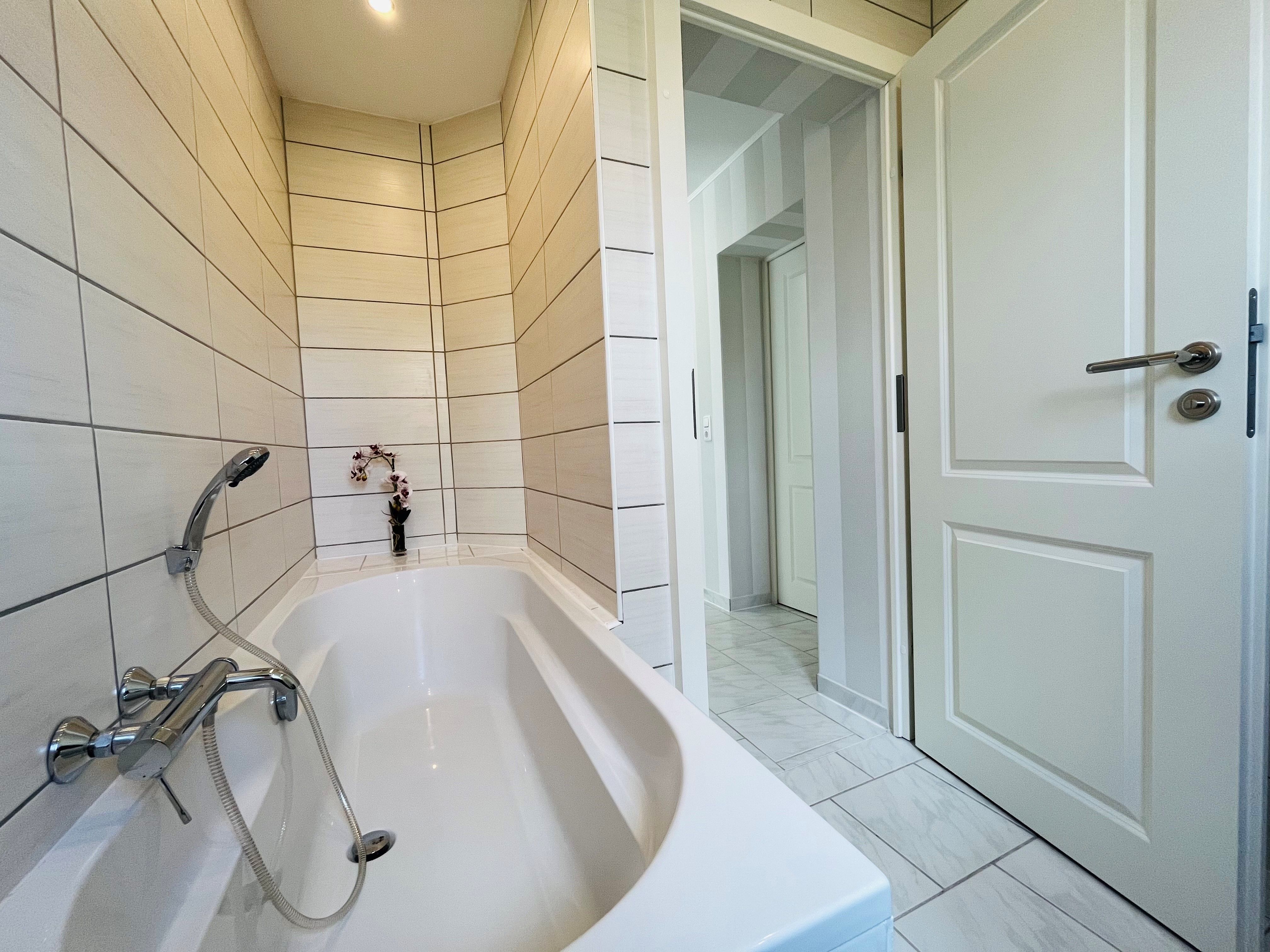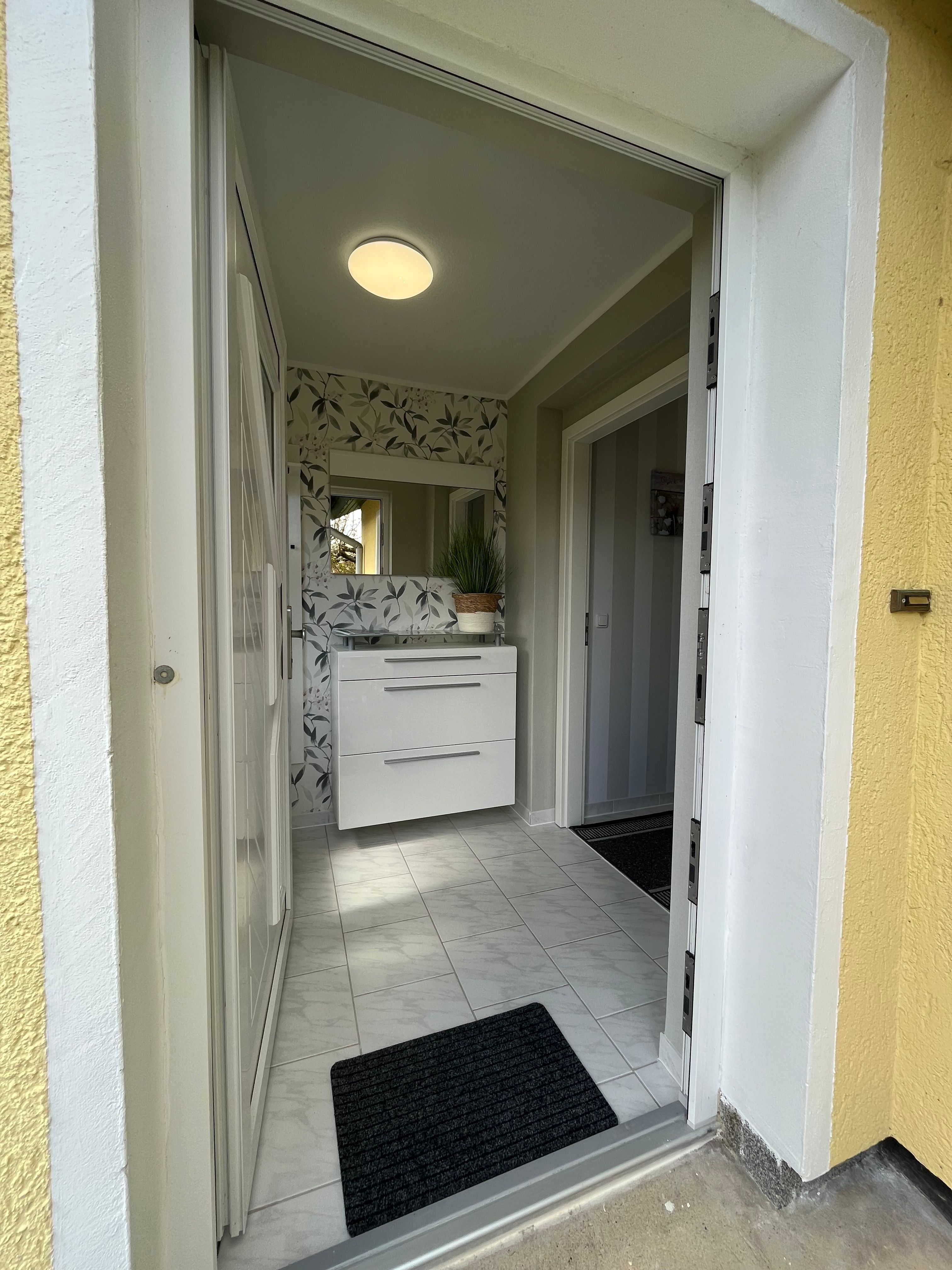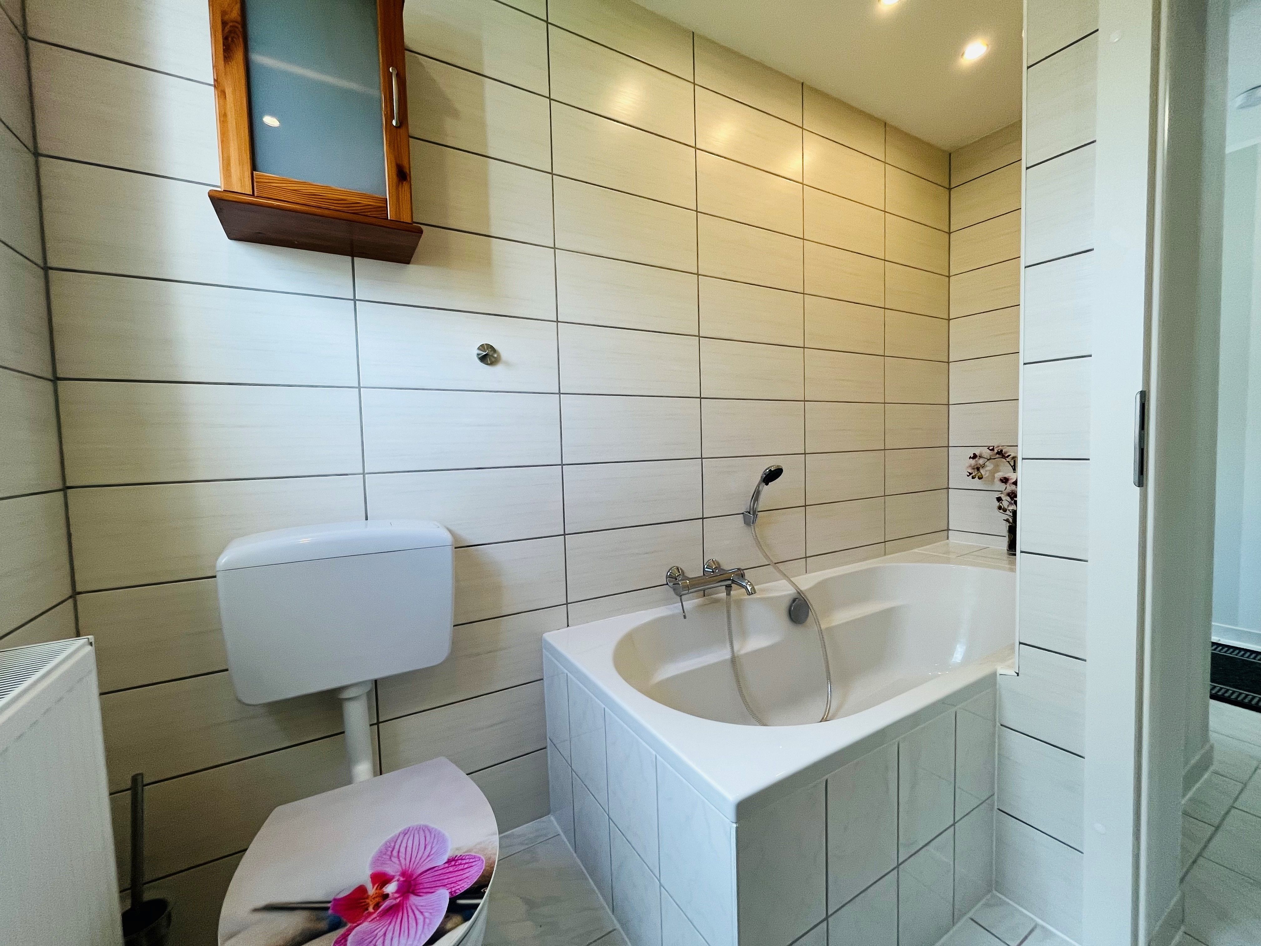 Barrierefrei: Ebenerdig außer 1 Eingangsstufe ins Haus und Badewanne. Durchgangsbreite Küchentür 70cm. Laminat- und Fliesenböden.