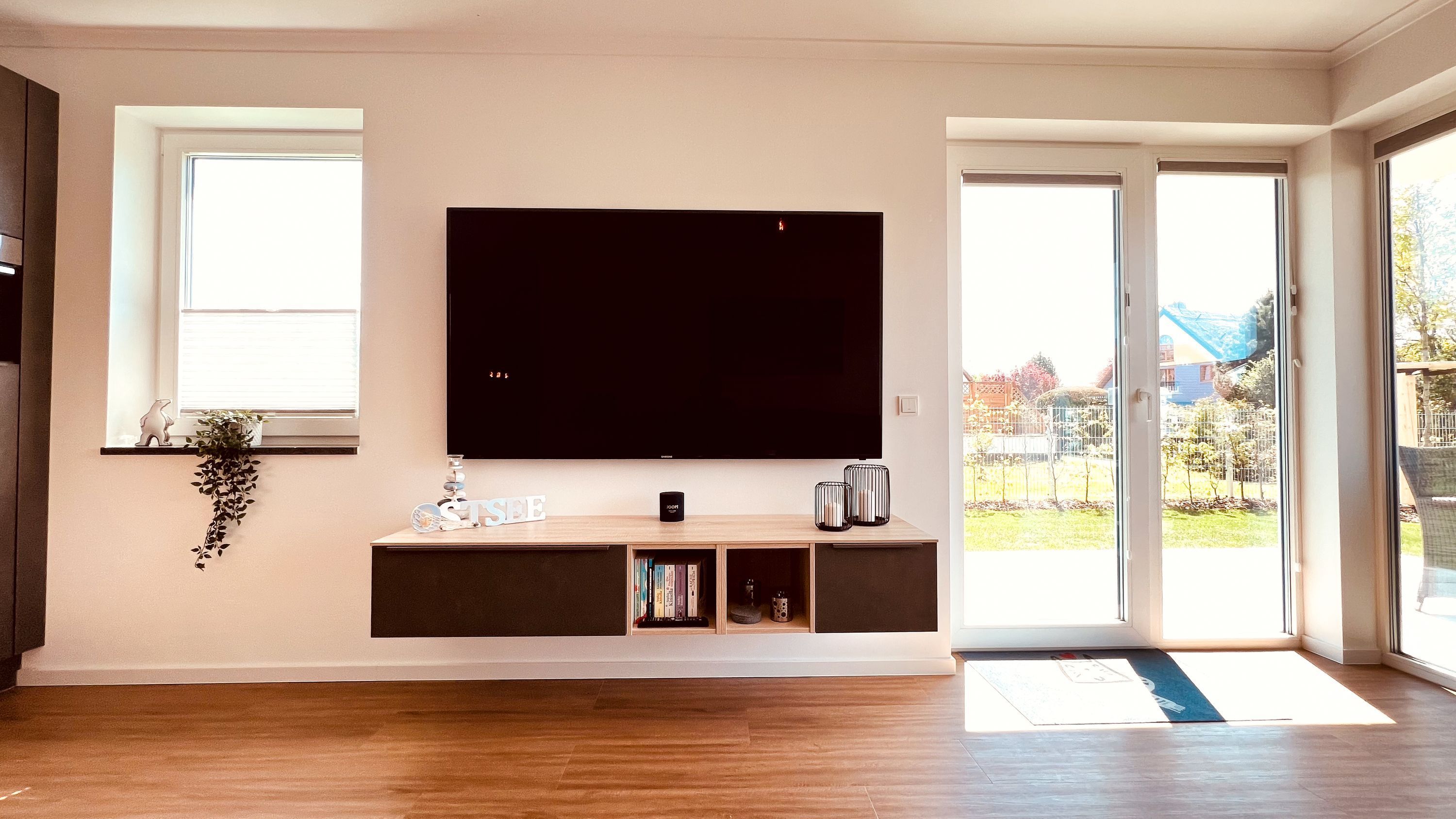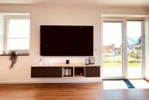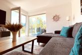 Der Essbereich bietet bequem Platz für 5 Personen und lädt zu gemeinsamen Mahlzeiten ein. Das Wohnzimmer besticht mit bodentiefen Fenstern, die für eine angenehme Atmosphäre sorgen. Hier können Sie es sich vor dem 75-Zoll-Fernseher gemütlich machen. Die Couch (134 cm x 230 cm) bietet außerdem eine Schlaffunktion für einen weiteren Gast.