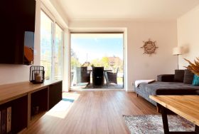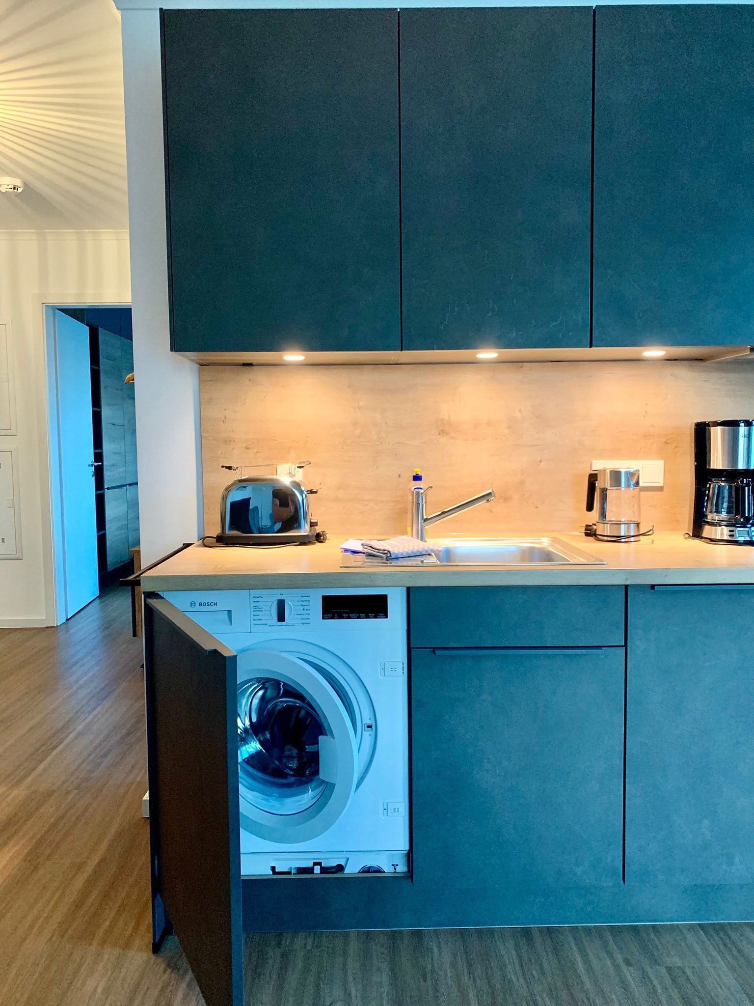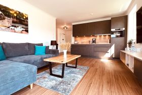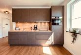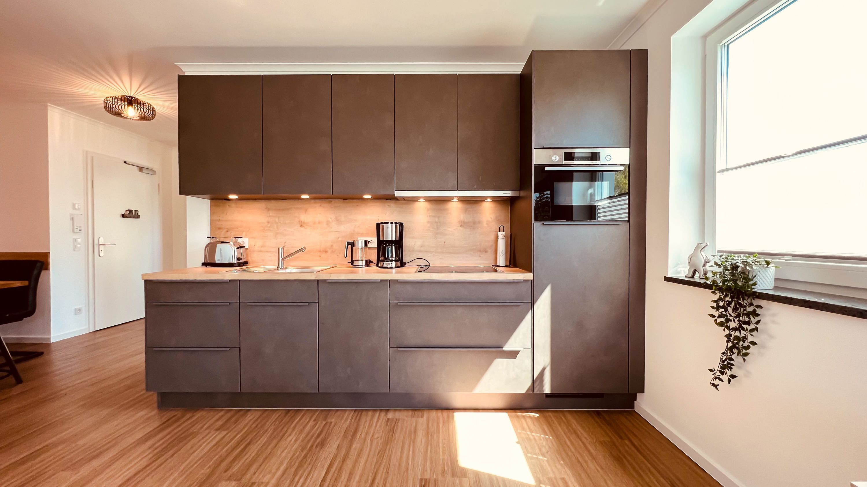 Die geräumige und lichtdurchflutete 3-Zimmer-Ferienwohnung verfügt über eine moderne Einbauküche mit allen Annehmlichkeiten. Neben einem Backofen mit integrierter Mikrowelle und einem Induktionskochfeld befinden sich in der Küche auch ein Geschirrspüler, eine Kühlschrank inklusive Gefrierfach, ein Toaster, eine Kaffeemaschine und ein Wasserkocher. Außerdem ist sie komplett mit Kochzubehör und Geschirr ausgestattet.