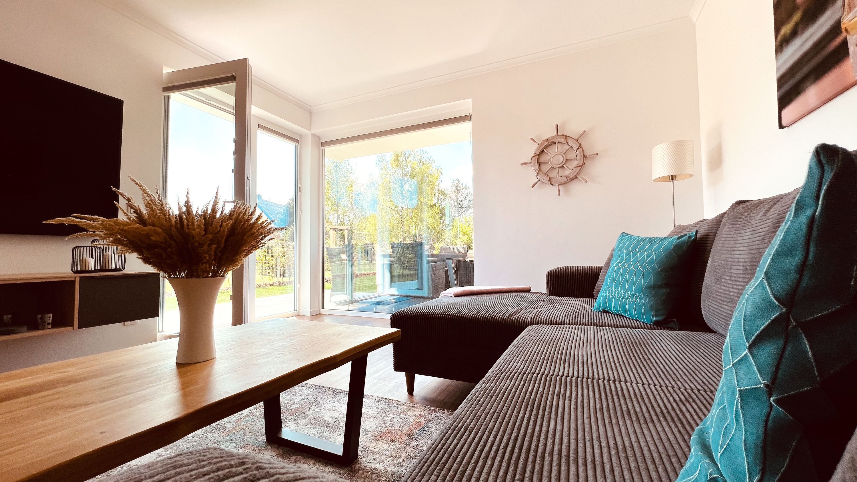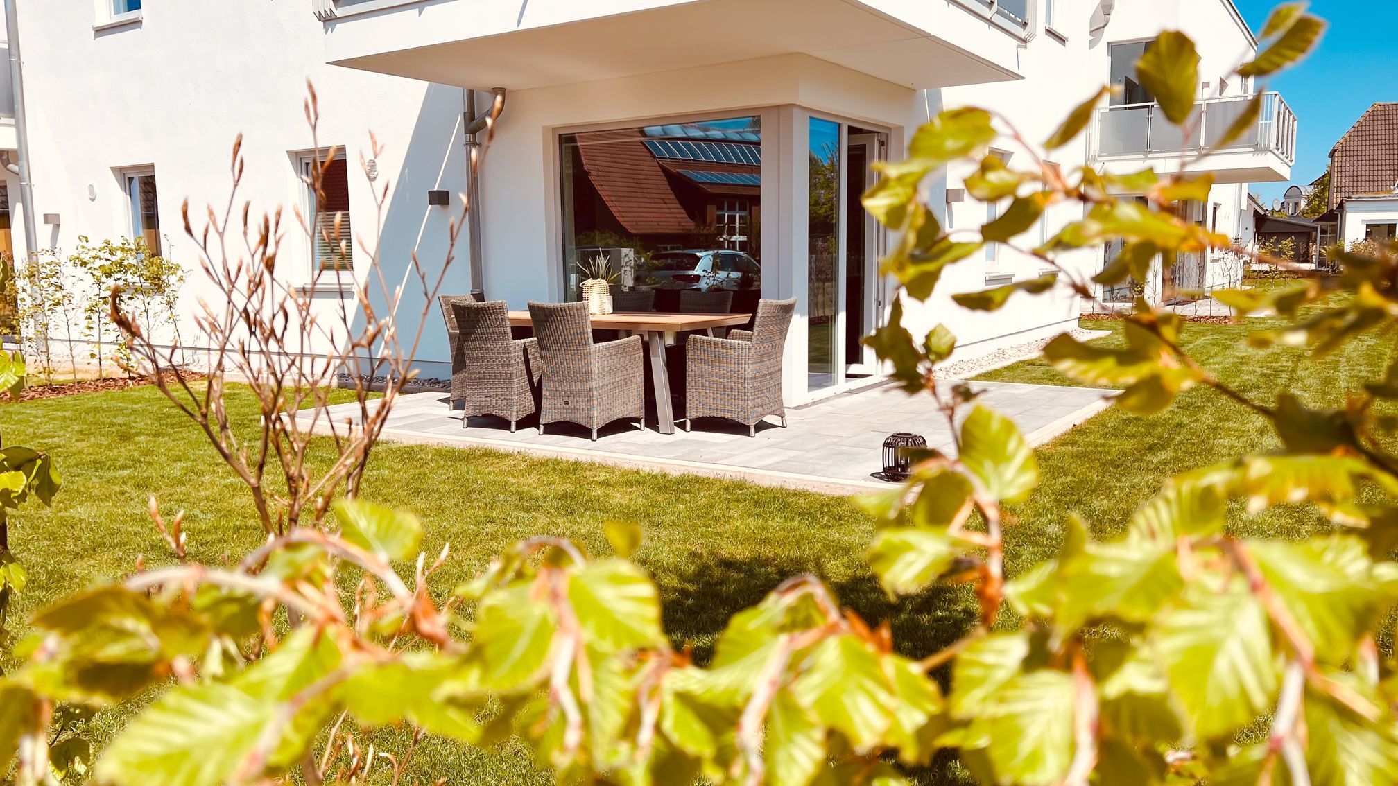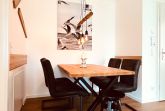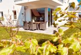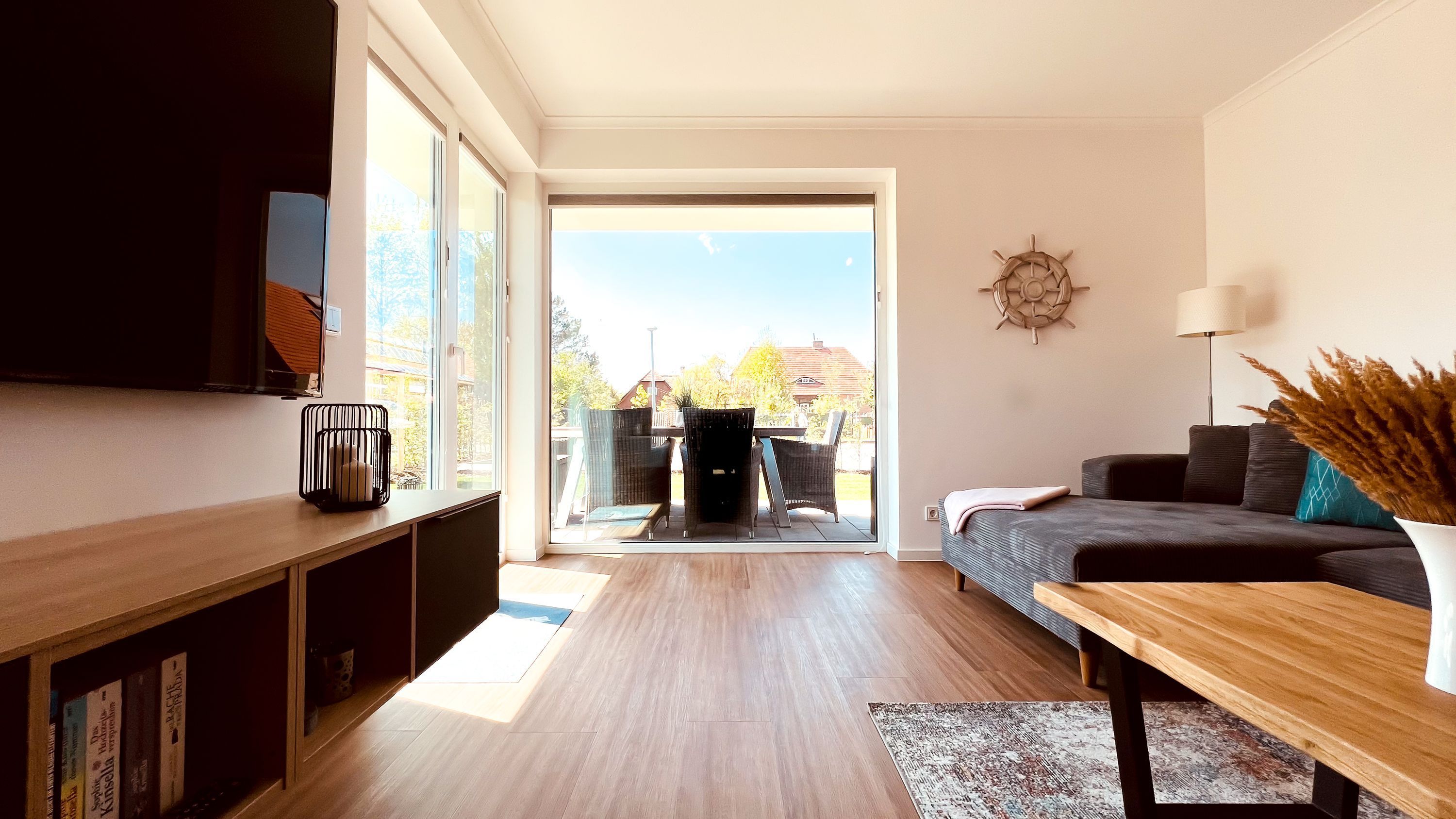 Von hier aus gelangen Sie auf die sonnige Terrasse mit Südausrichtung, die mit einem Esstisch und sechs Stühlen ausgestattet ist. Hier können Sie bei sonnigem Wetter entspannte Stunden verbringen.