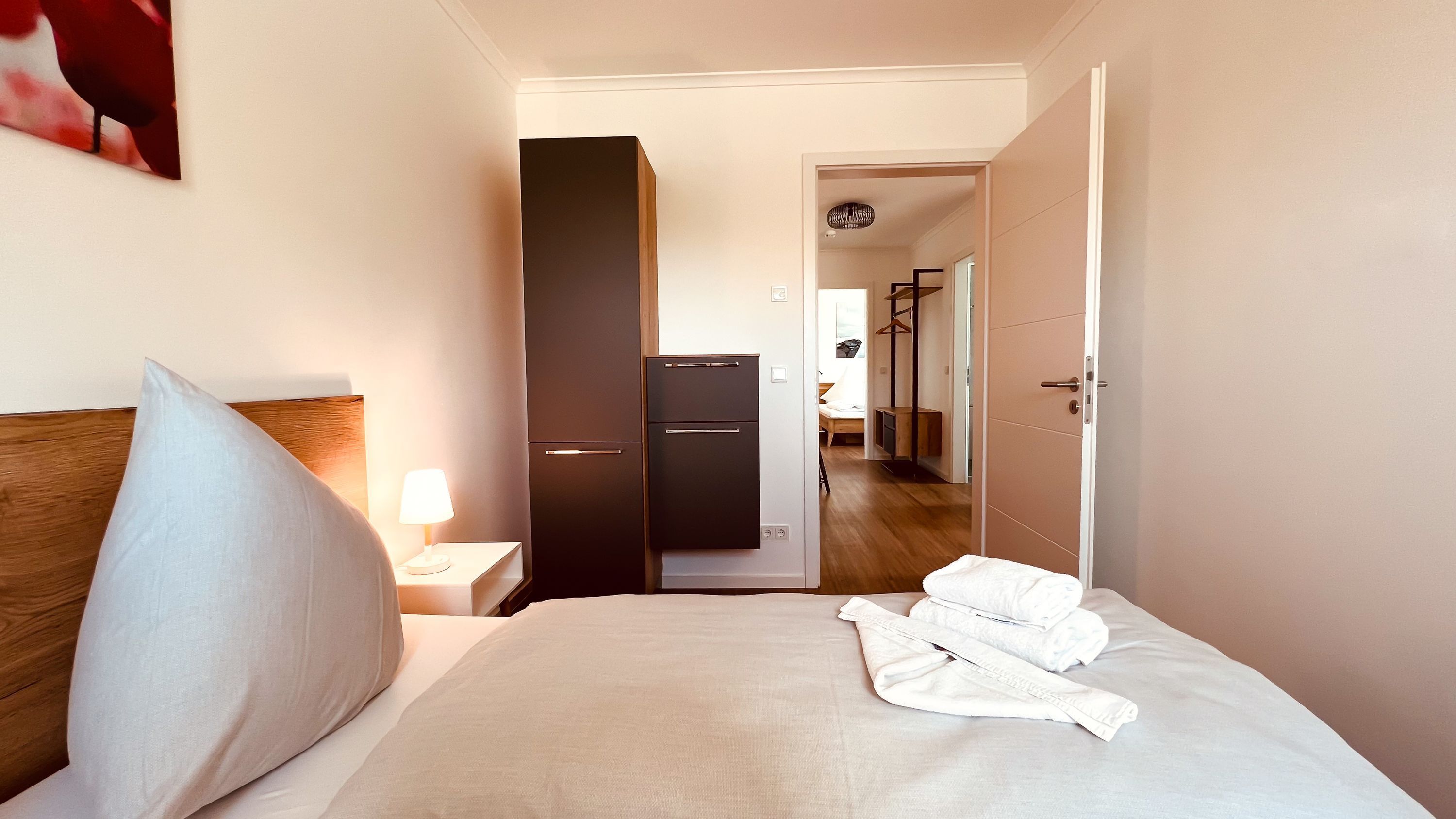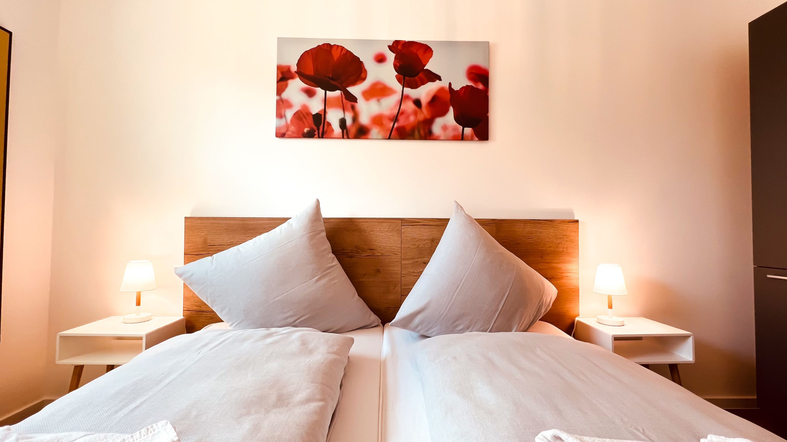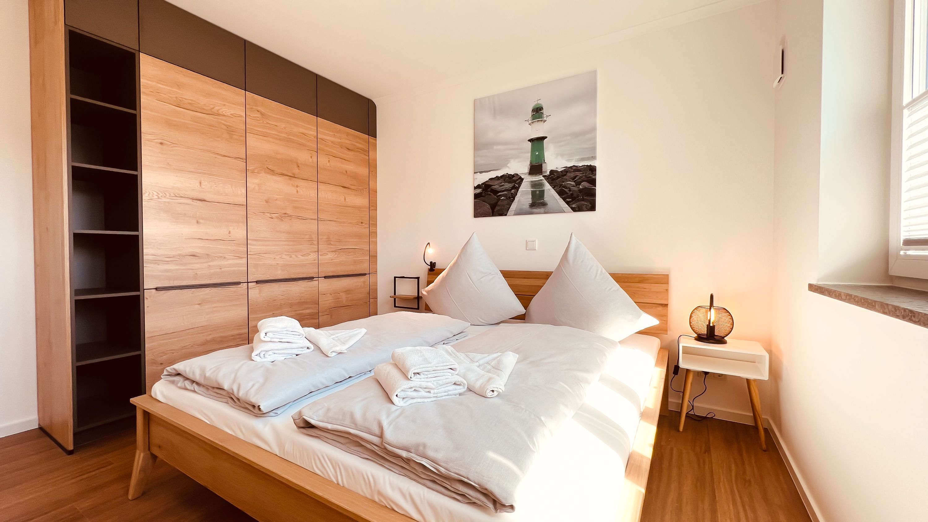 Die Wohnung verfügt insgesamt über zwei Schlafzimmer. Das erste ist mit einem gemütlichen Doppelbett (180 x 200 cm / getrennten Matratzen), einem großen Kleiderschrank und einem Fernseher ausgestattet. Im zweiten befinden sich ein Doppelbett (180 x 200 cm / getrennten Matratzen) und ein kleinerer Schrank für zusätzlichen Stauraum.