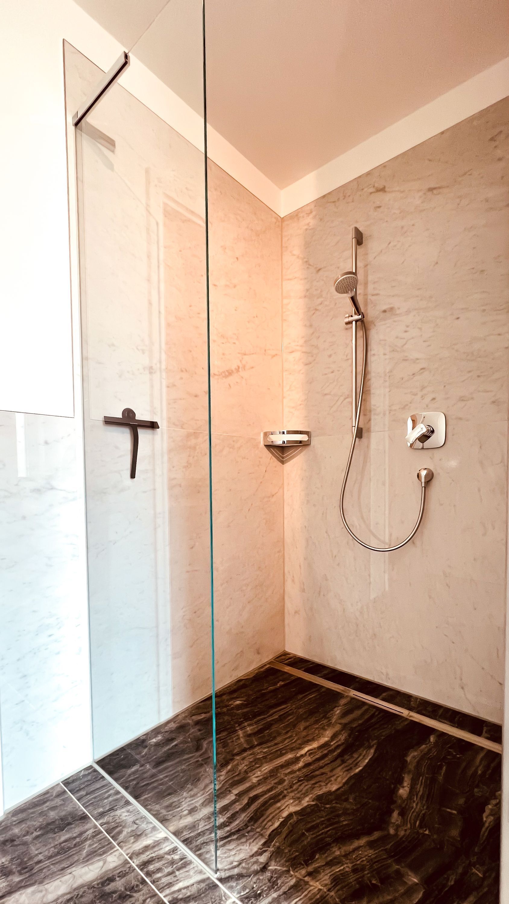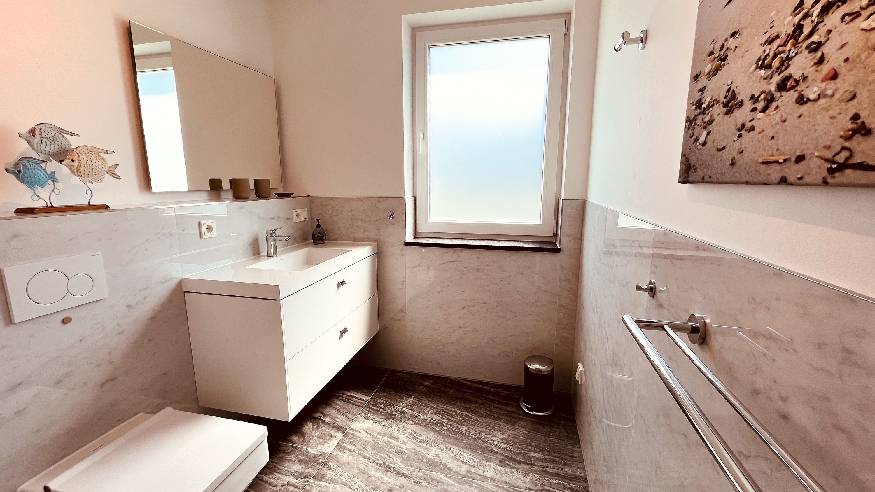 Das helle Badezimmer ist mit einem Waschtisch mit großem Spiegel und einem Haartrockner ausgestattet. Zusätzlich stehen ein Staubsauger und ein Wäscheständer zur Verfügung. Besonderheit der Wohnung ist zudem, die in der Küchenzeile integrierte Waschmaschine, welche besonders bei längeren Aufenthalten ein willkommener Helfer ist.