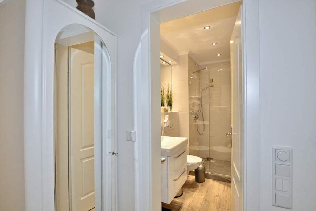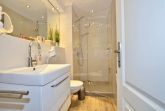 Im Bad befinden sich eine Dusche, ein WC, ein Waschtisch und ein Handtuchtrockner.