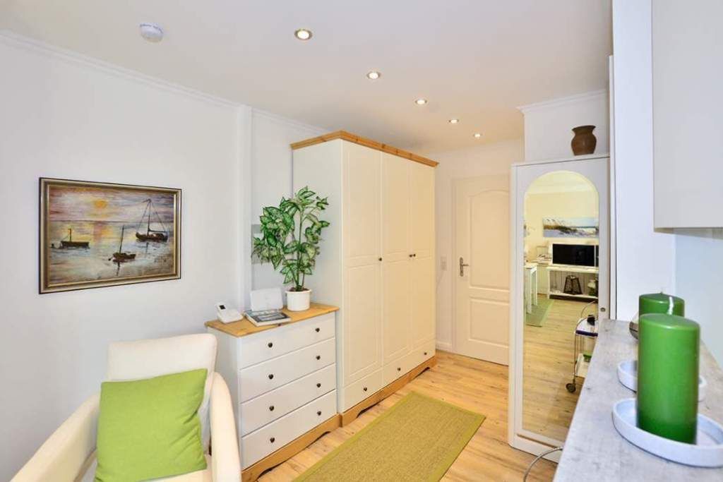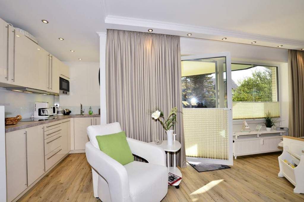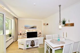 Der Wohn-/Schlafraum besteht aus einer gemütlichen Sitzecke mit zwei Sesseln, einer Essecke und einem feststehenden Doppelbett (Einzelmatratzen 0,95 x 2,00 m), Kabel-Flachbild-TV, Radio/CD-Player, Telefon, W-Lan und offener, neuer Küchenzeile.