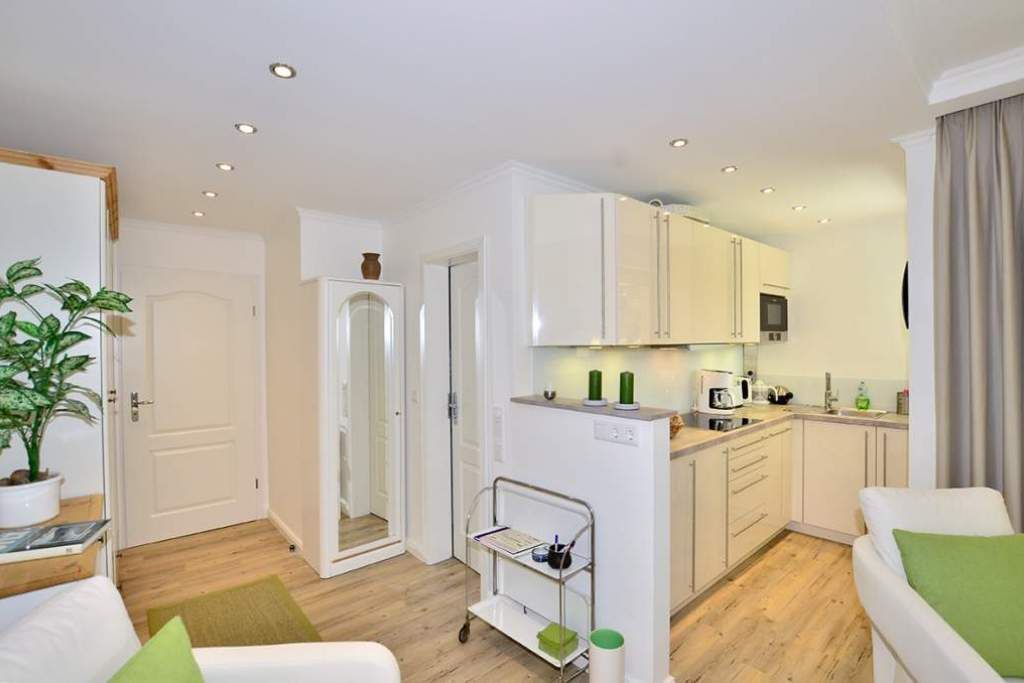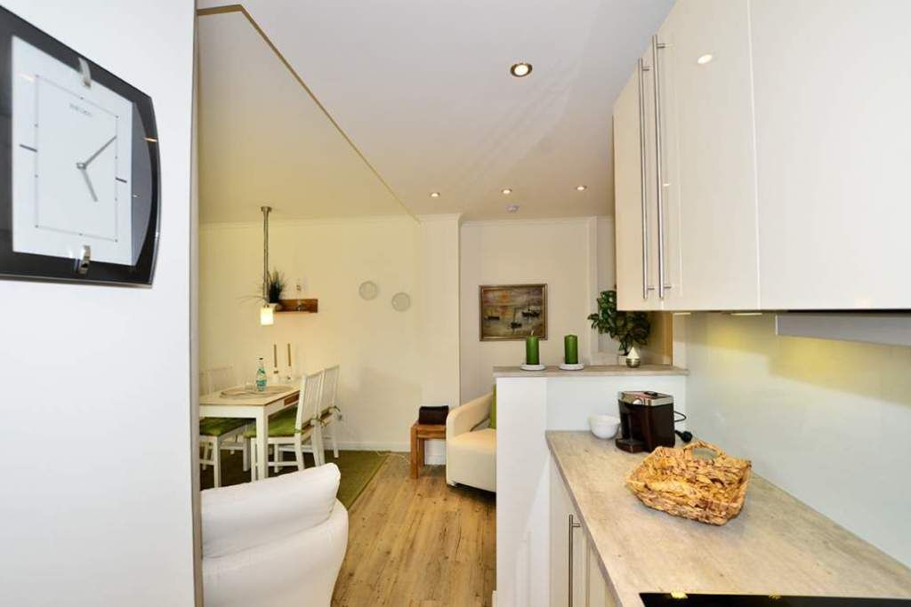 Die vollausgestattete Küchenzeile hat einen Geschirrspüler, ein Cerankochfeld mit 4 Feldern, eine Mikrowelle mit Backfunktion und einen Kühlschrank mit 3-Sterne-Gefrierfach. Kaffeemaschine, Wasserkocher und Toaster gehören zur Grundausstattung.