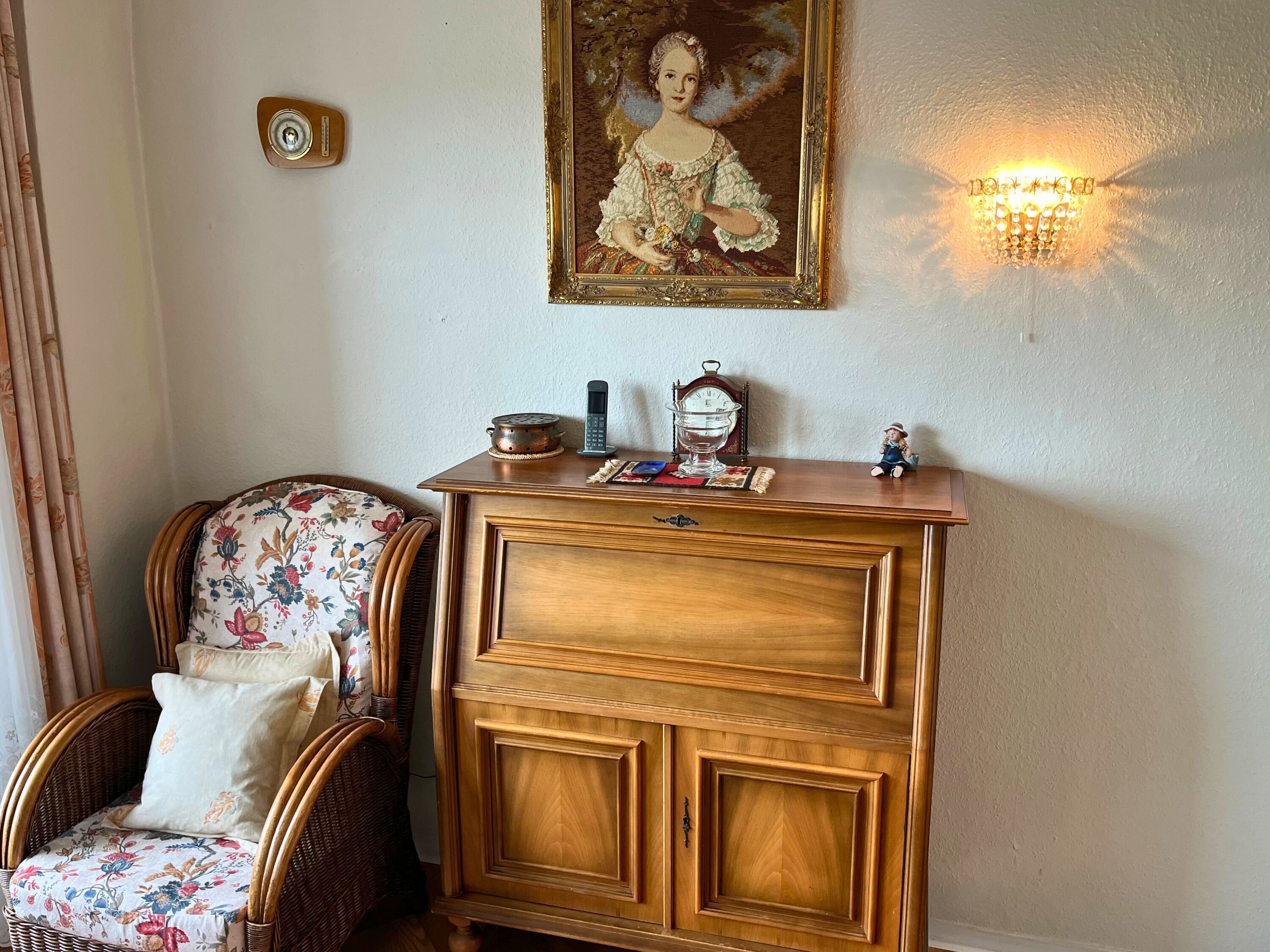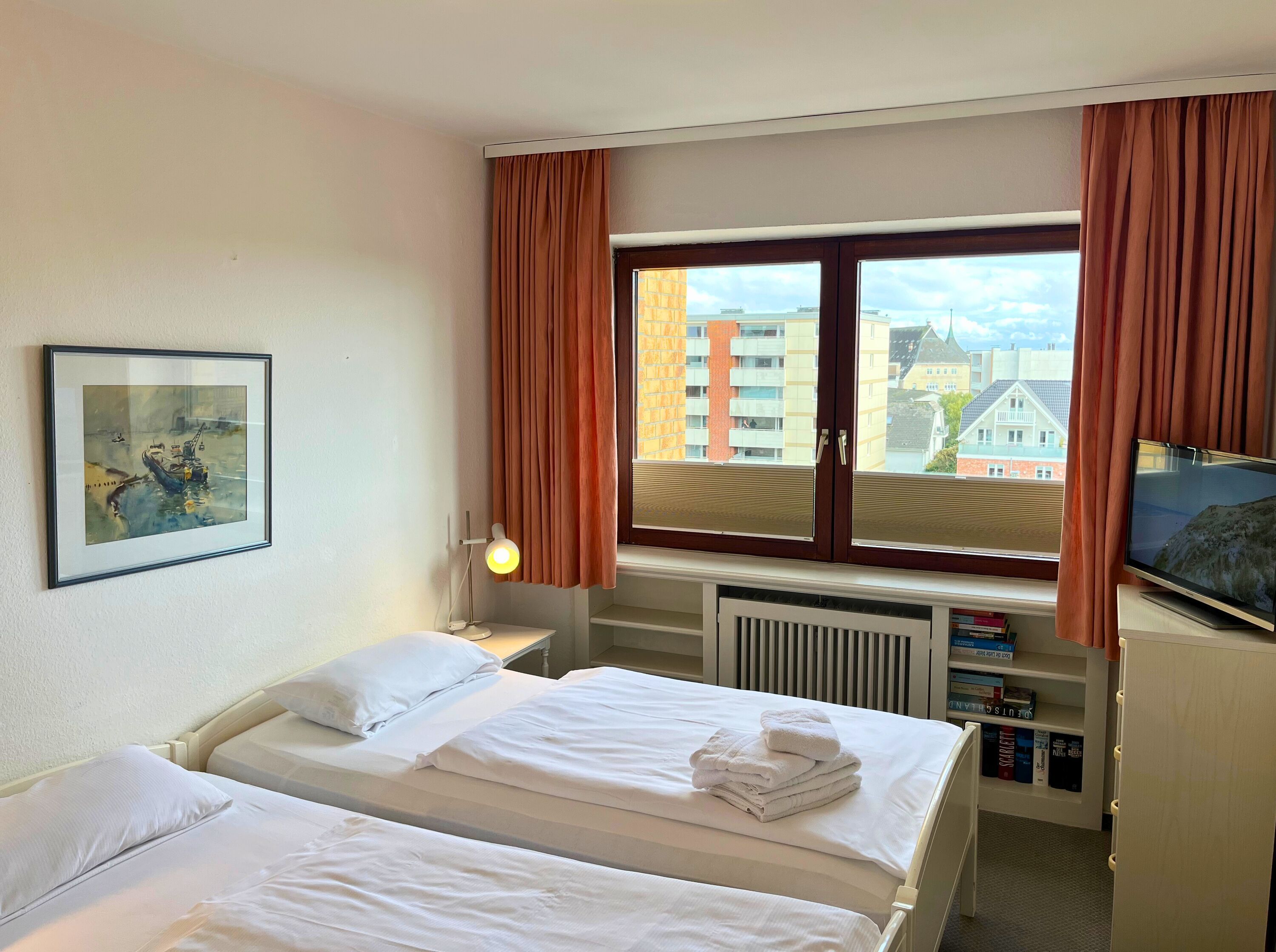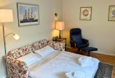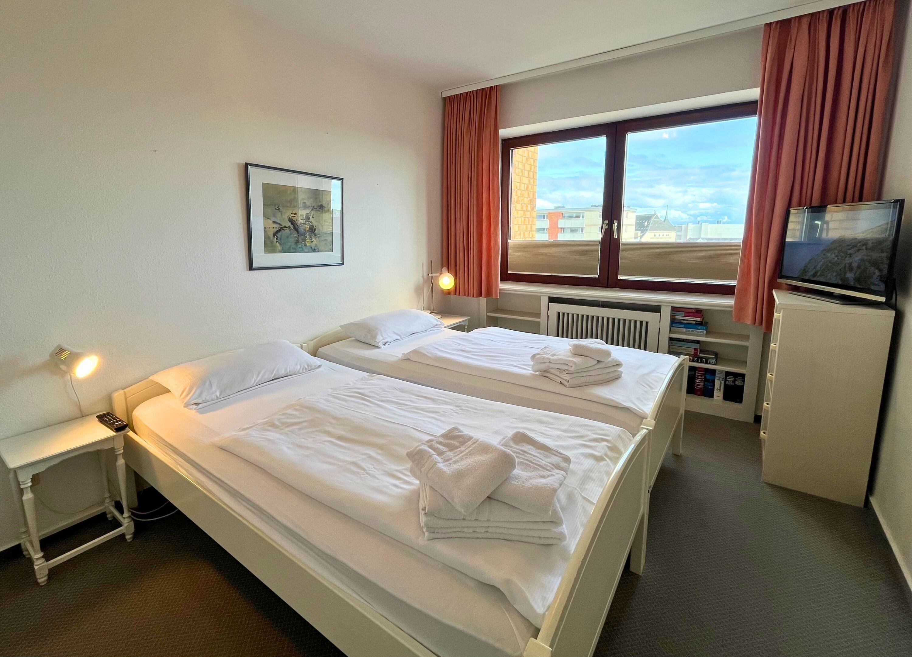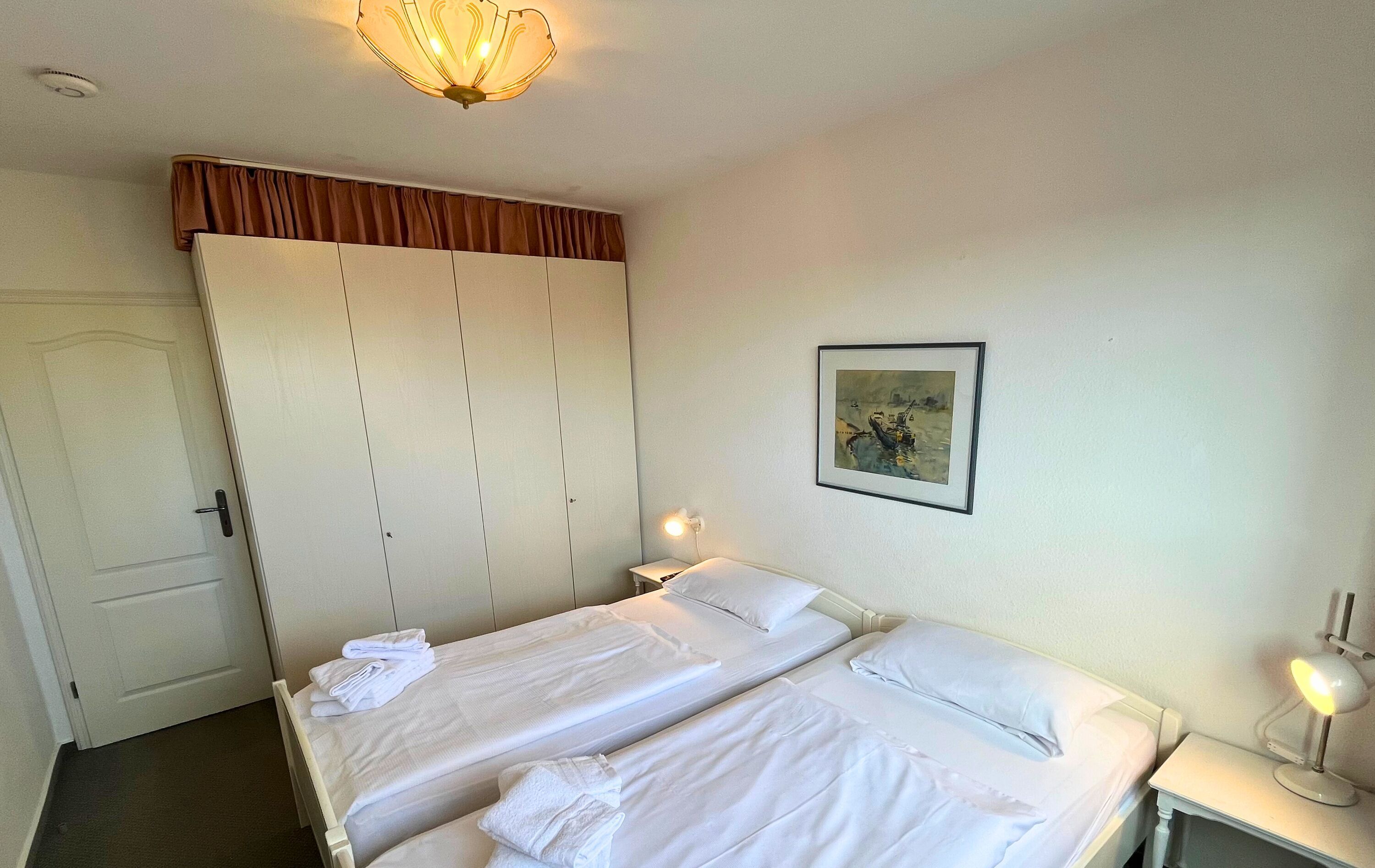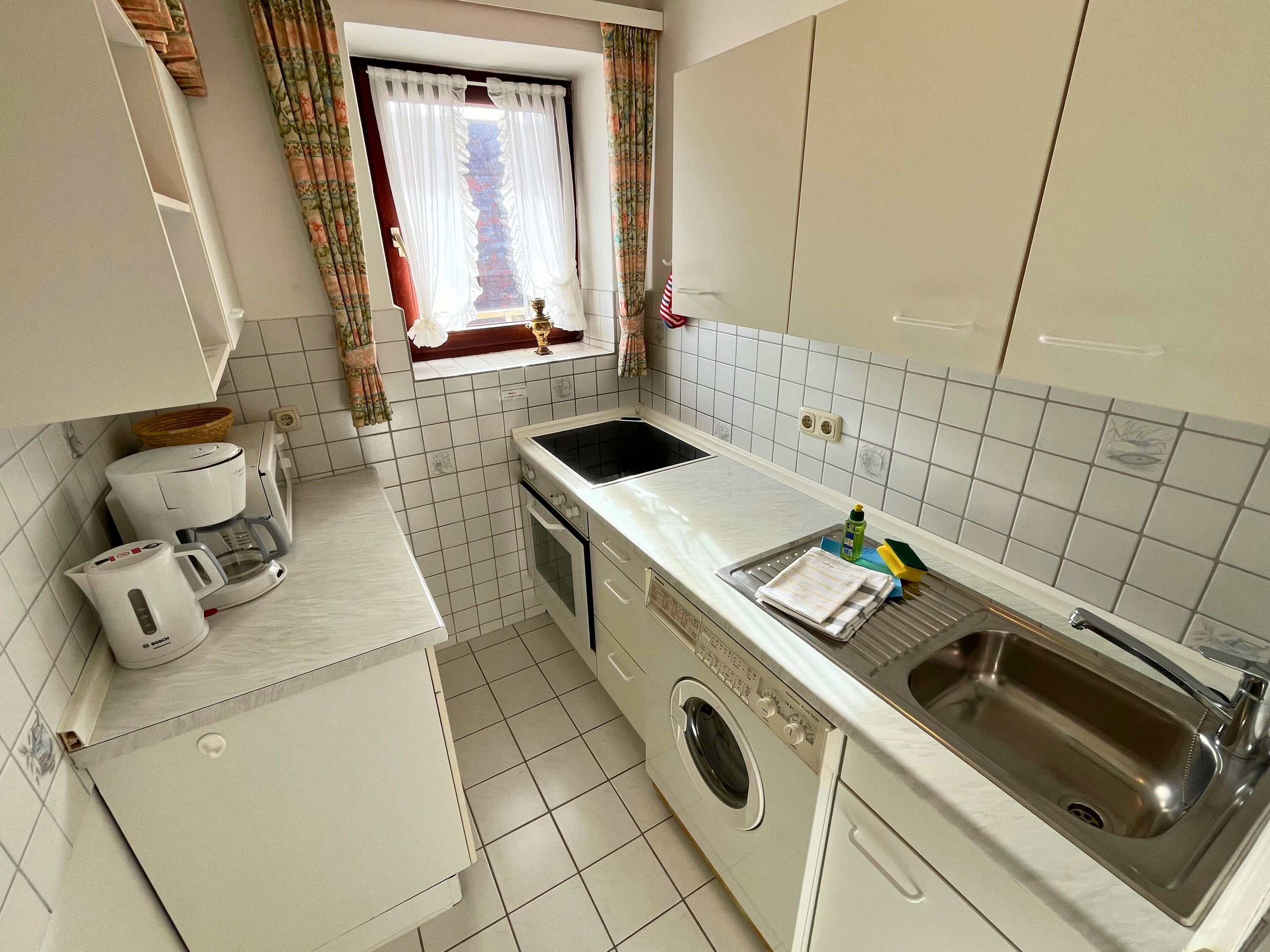 Das separate Schlafzimmer liegt zur Ostseite hin und verfügt über ein Doppelbett mit zwei Einzelmatratzen ideal für erholsamen Schlaf. Die Küche ist voll ausgestattet und bietet neben einem Backofen und einer Mikrowelle auch eine Waschmaschine mit integriertem Trockner. Ein großer Kühlschrank mit separatem Gefrierfach sorgt für ausreichend Stauraum. Zur Grundausstattung gehören außerdem eine Kaffeemaschine, ein Wasserkocher und ein Toaster.