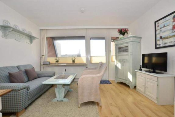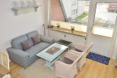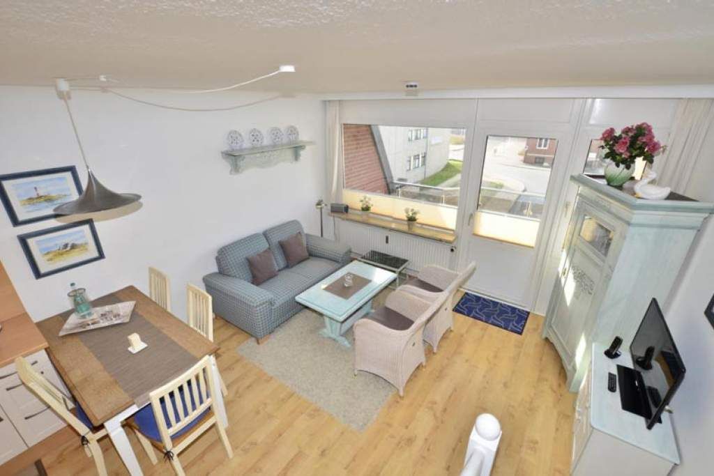 Der Wohnraum besteht aus gemütlicher Sitzgarnitur (2-Sitzer-Couch und zwei Sesseln), einem Essplatz, Flachbildfernseher, HiFi-Anlage, Telefon und einer neuen, offenen Küchenzeile.