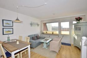 Die hier angebotene Ferienwohnung mit einer Wohnfläche von ca. 63 m² ist für bis zu 4 Personen geeignet. Es handelt sich um eine Nichtraucher-Wohnung, die über eine Westloggia mit Balkonmöbeln und Auflagen verfügt. Das Appartement liegt in der 2. Etage (oberste) des Gebäudes.