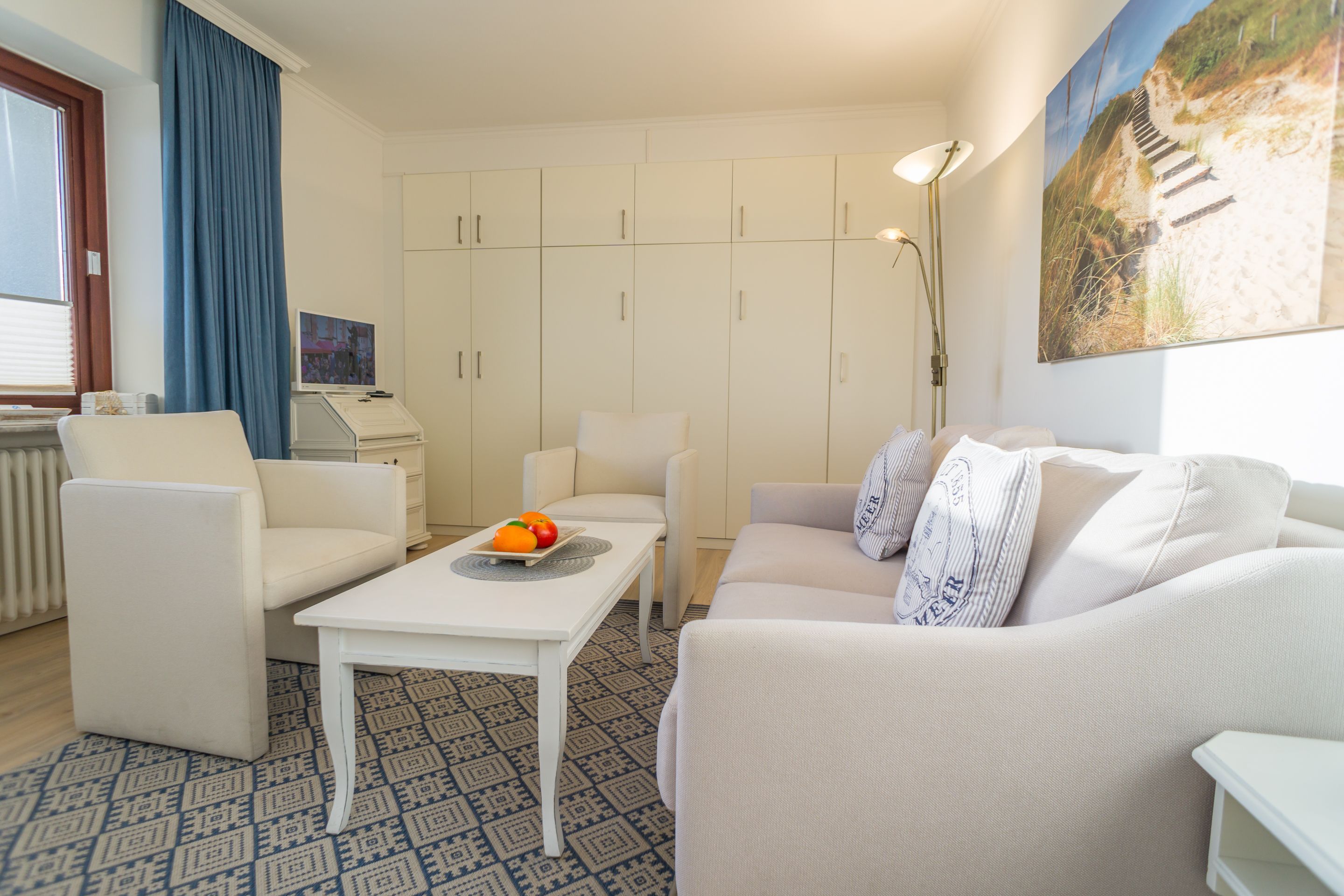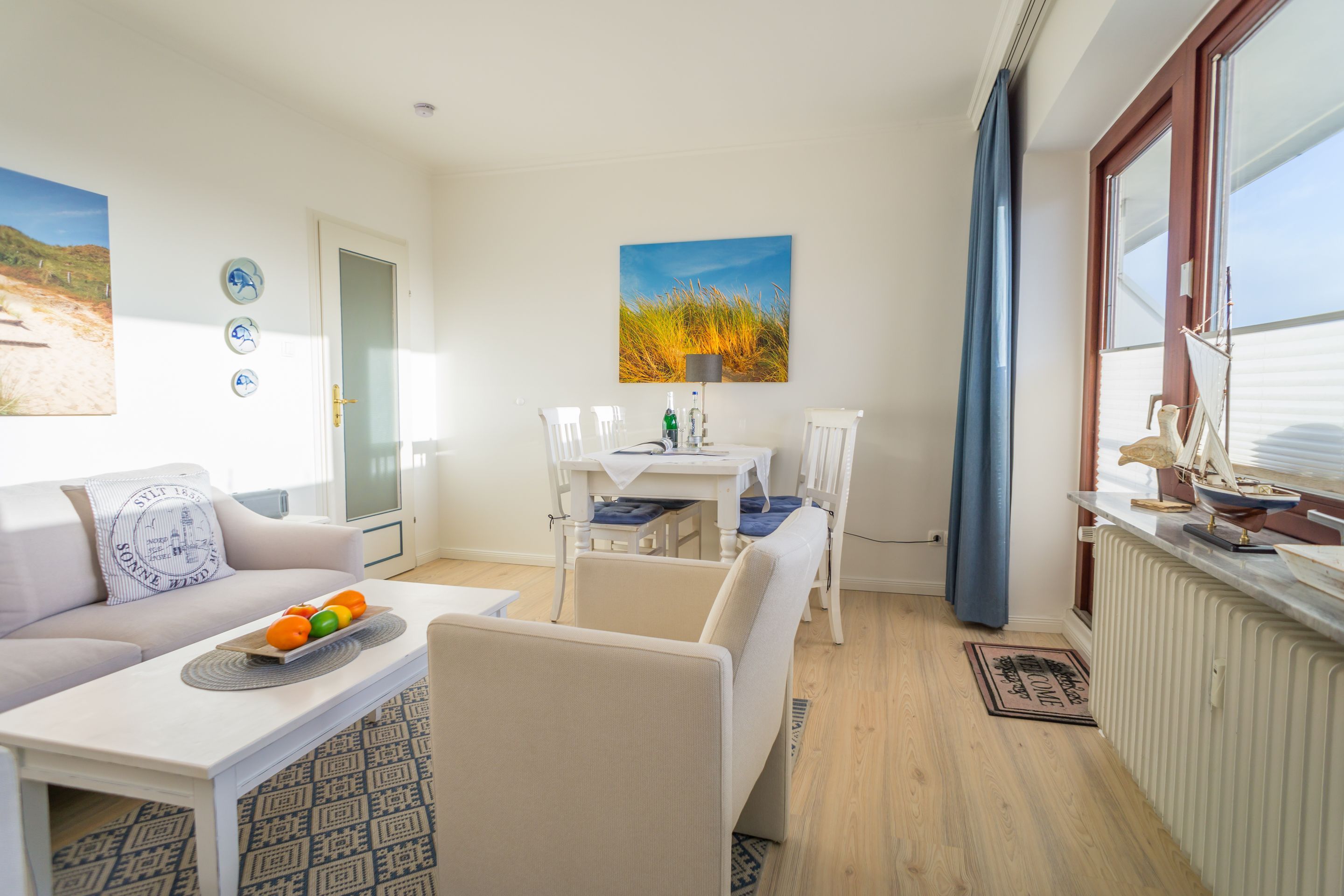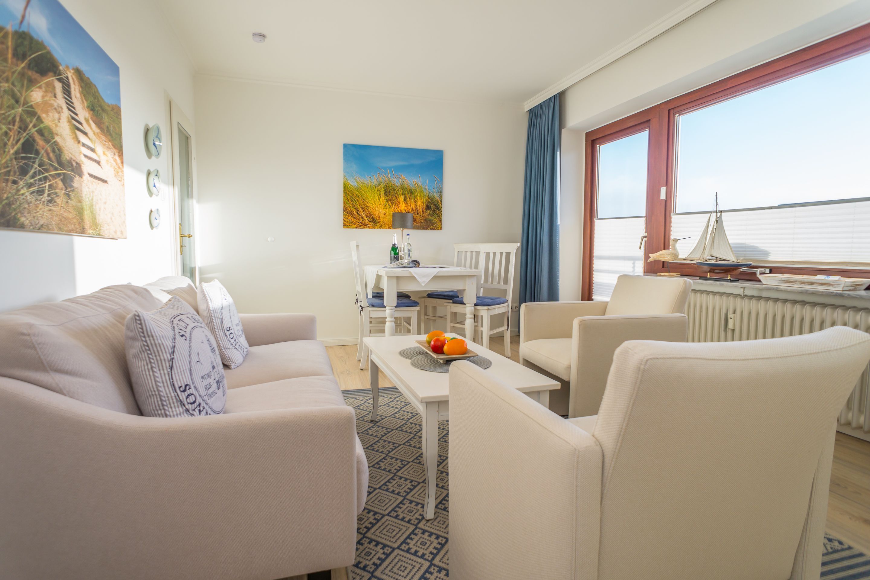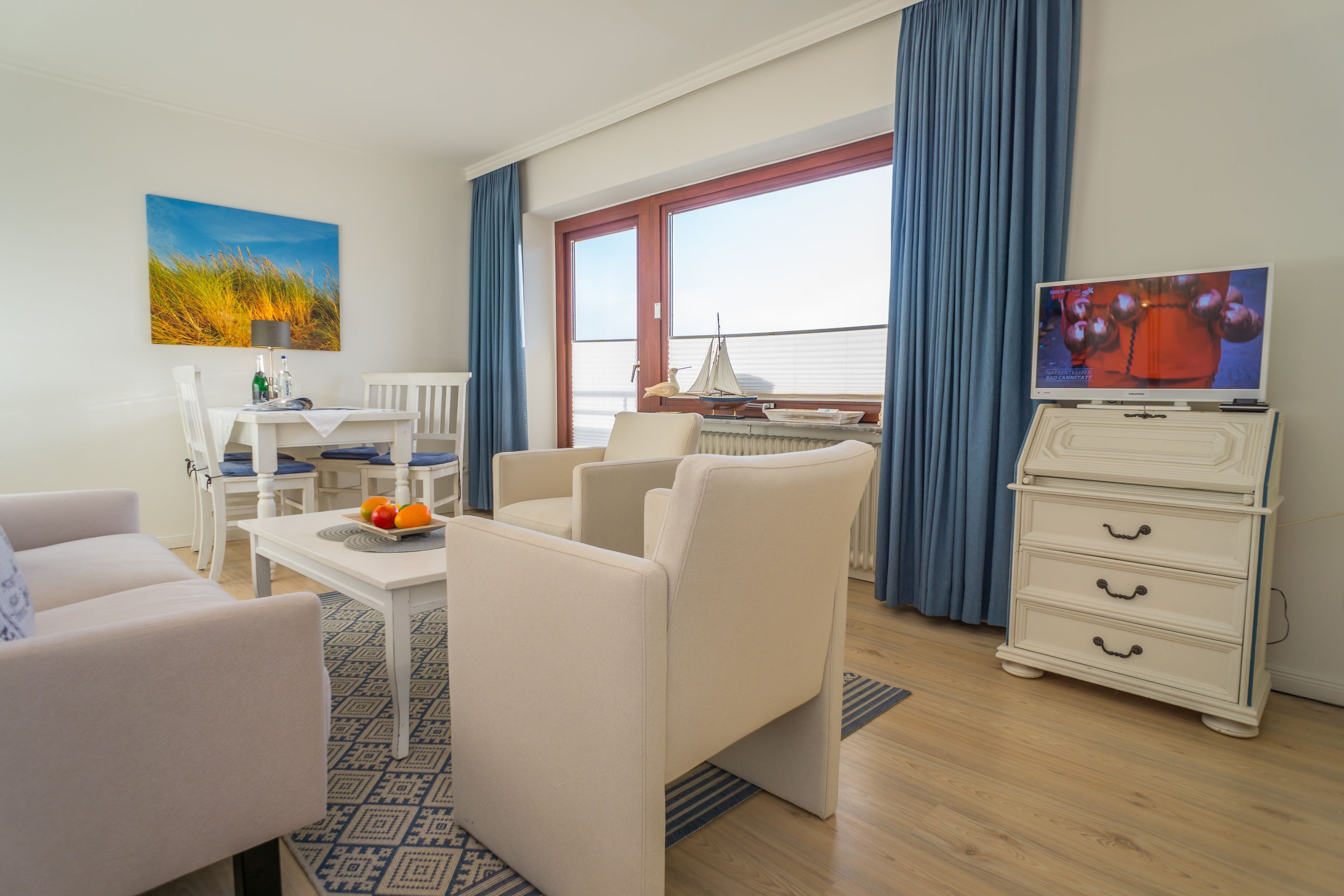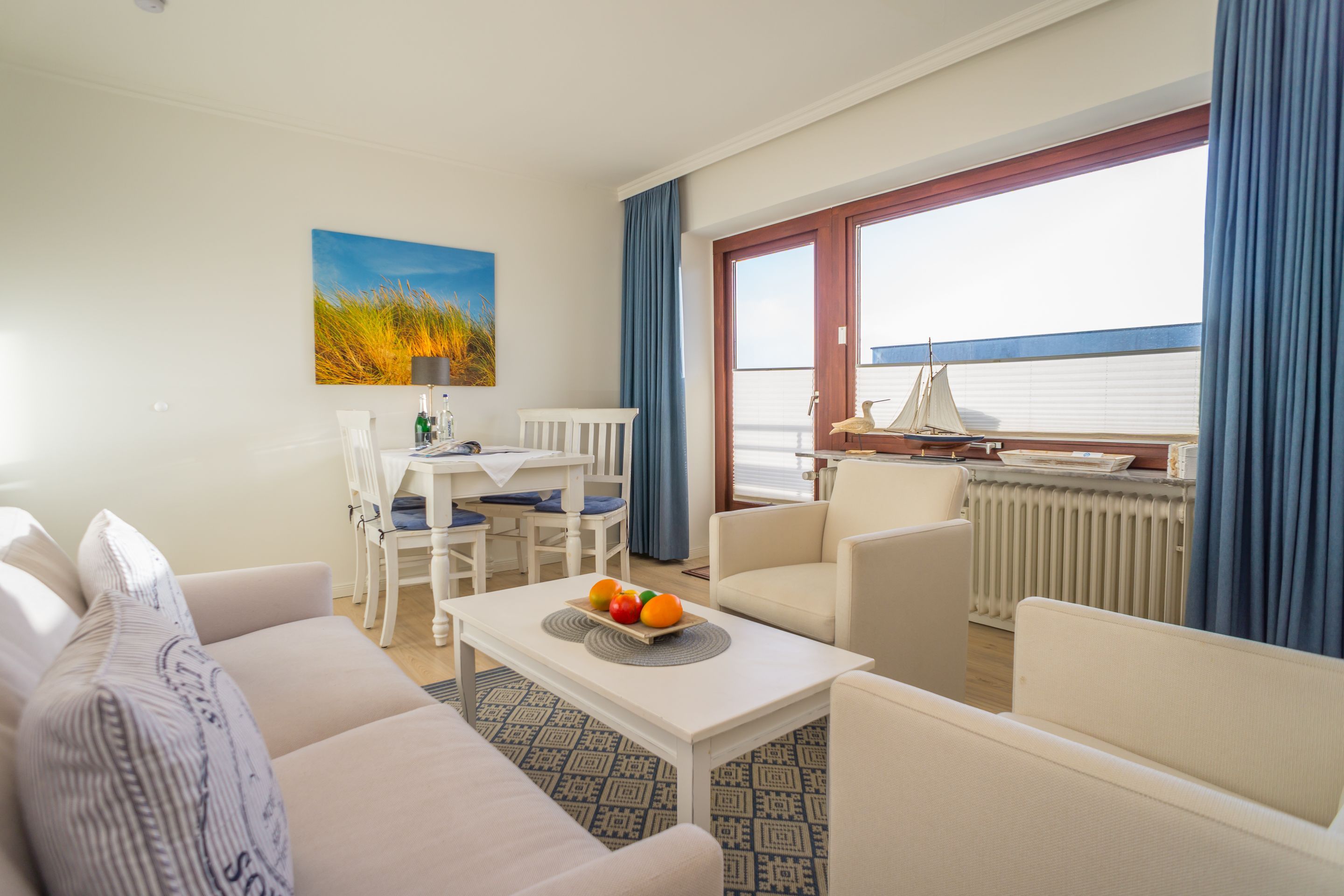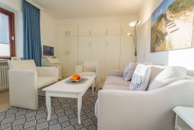 Das gut ausgestattete Wohnzimmer mit Austritt zur Südloggia hat eine bequeme 2-Sitzer-Couch mit Sessel, mit Schrankbetten, einen separaten Essplatz, einen Flatscreen-TV, Radio und Telefon.