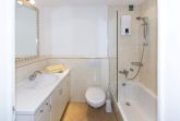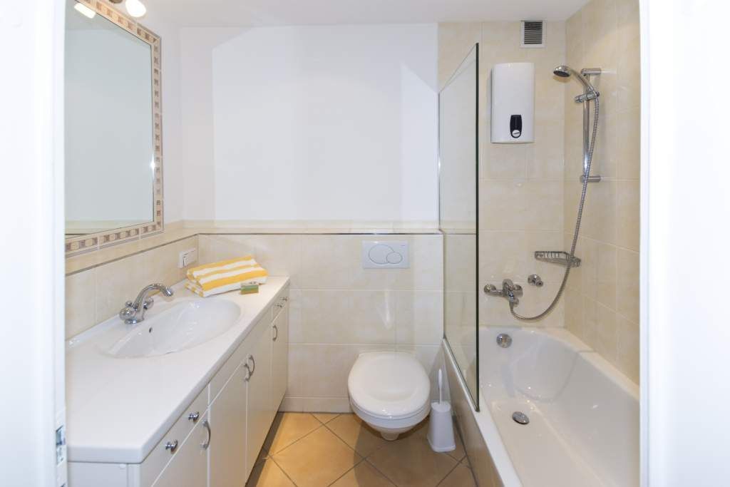Das Badezimmer/WC besteht aus Badewanne mit Duschwand, Waschtisch und einen Handtuchtrockner.