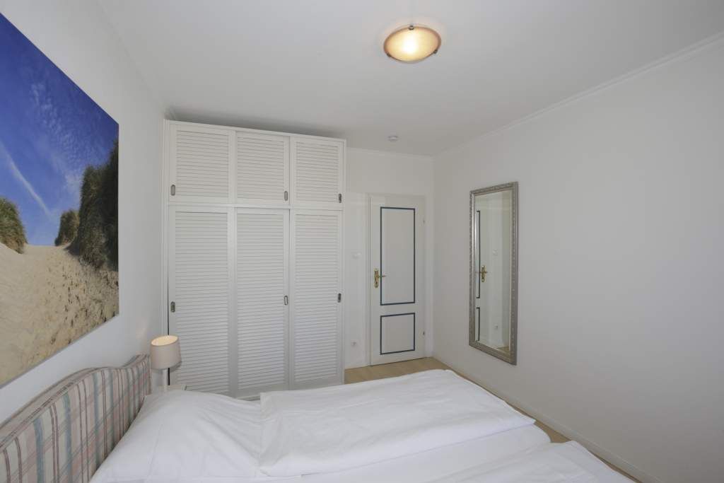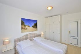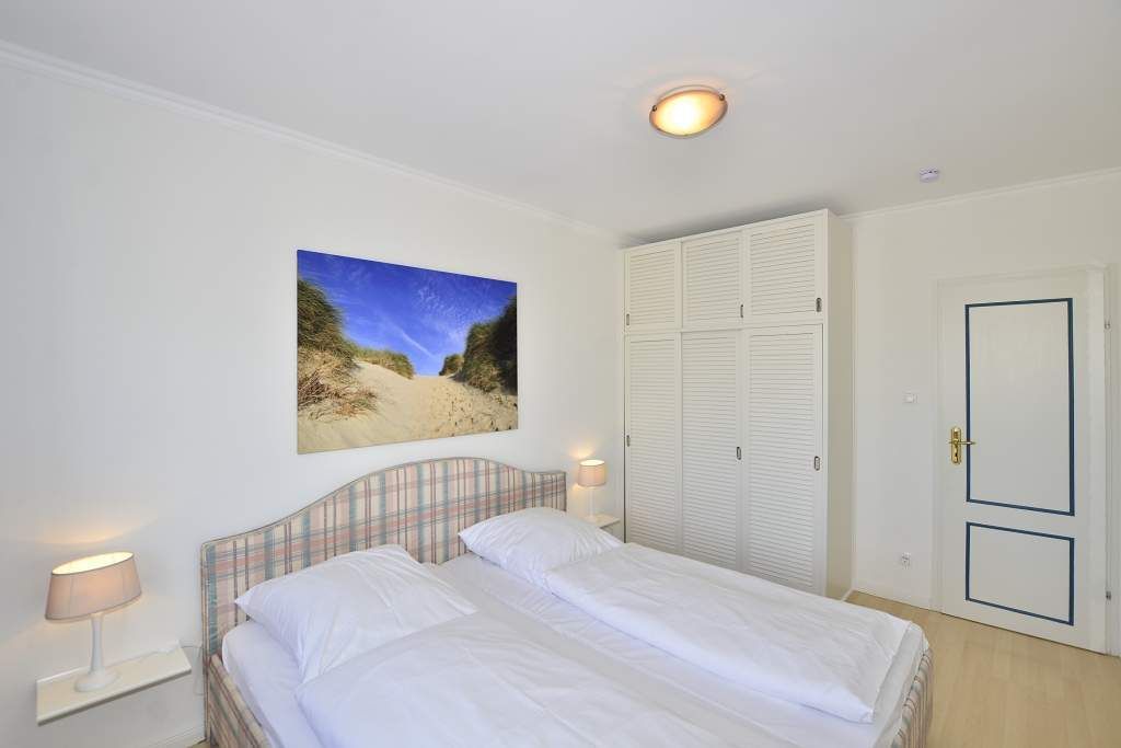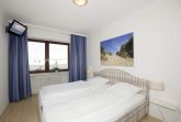 Das in Westlage ausgerichtete Schlafzimmer mit Blick Richtung Nordsee hat ein Doppelbett, einen Fernseher, Nachttische und einen Kleiderschrank.