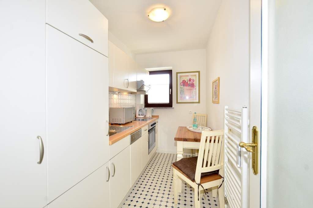 Die helle Küche ist mit Geschirrspüler, Mikrowelle, Backofen, Kühlschrank mit 3-Sterne-Gefriefach, weiterem Essplatz und Fenster ausgestattet.
