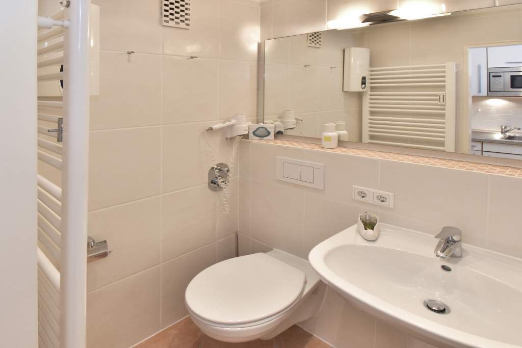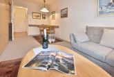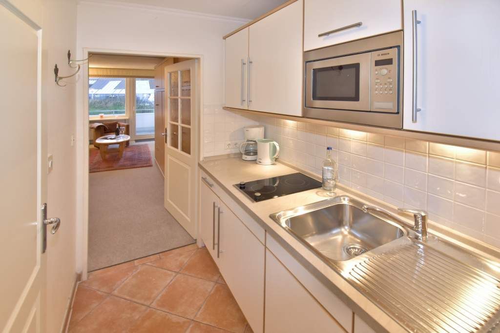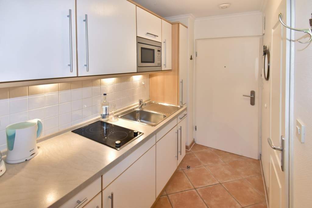Die moderne Küchenzeile hat ein Cerankochfeld, eine Mikrowelle und einen Kühlschrank mit 3*-Gefrierfach. Kaffeemaschine, Wasserkocher und Toaster gehören zur Grundausstattung.