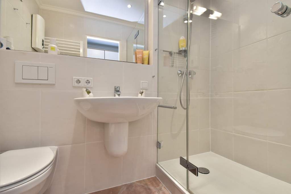 Im neuen Bad befindet sich eine flache Duschanlage, ein WC, ein Waschtisch und ein Handtuchtrockner.