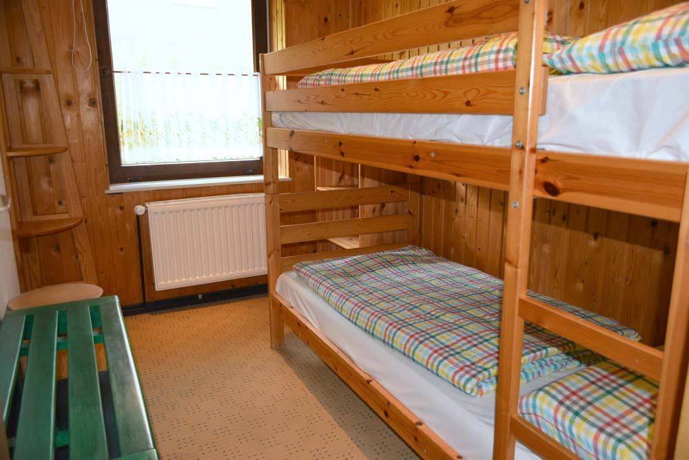 Schlafzimmer 2: Eckregal, Etagenbett, Garderobe, Hocker