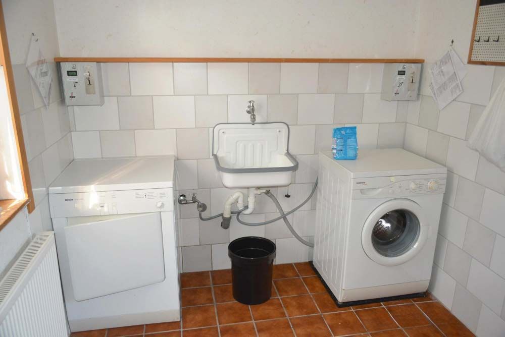 Waschraum:      Bügelbrett, Bügeleisen, Regal, Wäscheständer, Waschmaschine und Trockner im Hauswirtschaftsraum gegen eine Gebühr