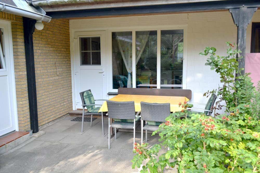 Terrasse:              2 Bänke, 2 Strandkörbe, 4 Stühle, halb überdacht, Liege, Süd- Ostlage, Tisch