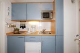 Die ansprechende Küchenzeile hat einen kleinen Geschirrspüler, ein Cerankochfeld, eine Bratmikrowelle und einen Kühlschrank mit 3*-Gefrierfach. Kaffeemaschine, Wasserkocher und Toaster gehören zur Grundausstattung.