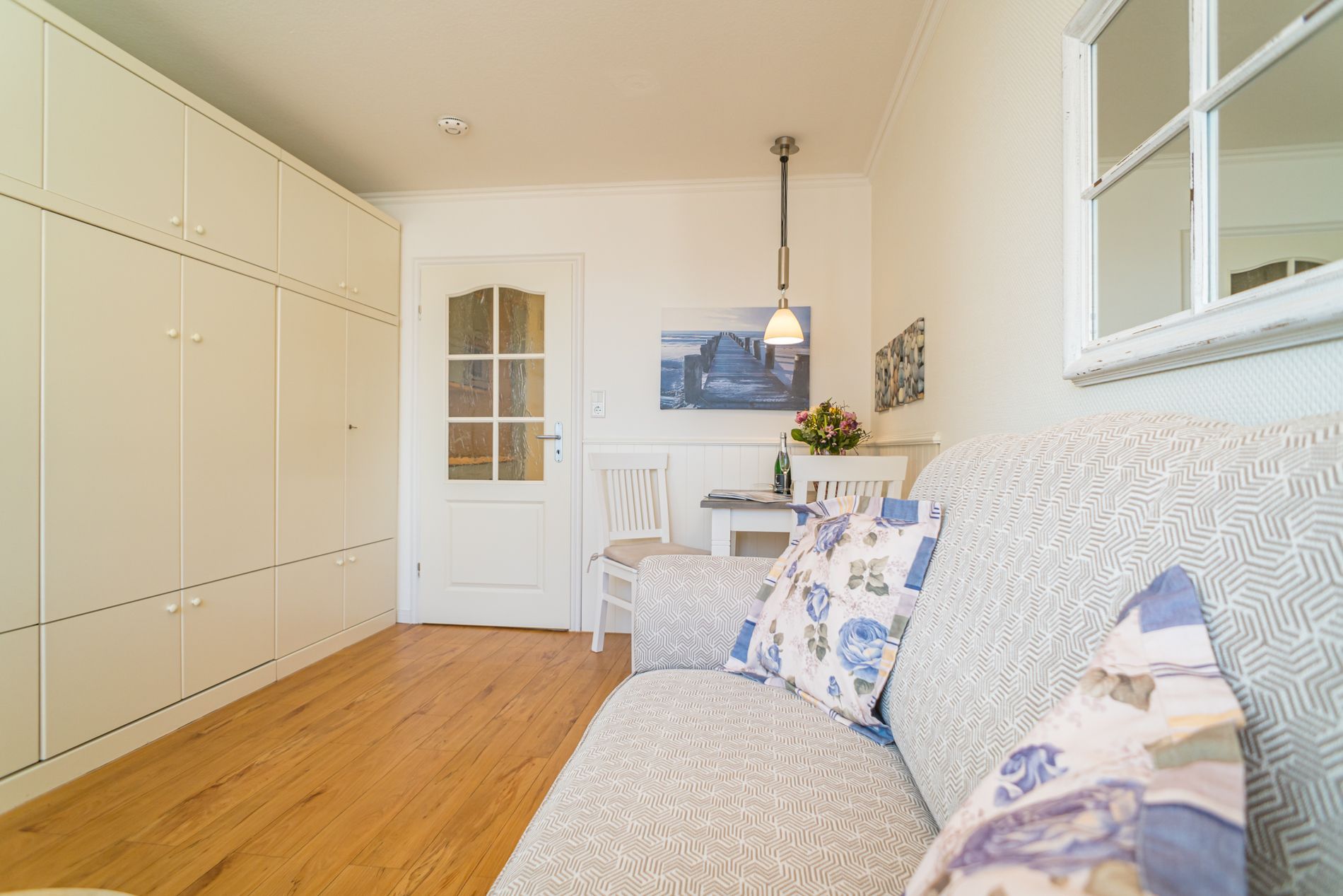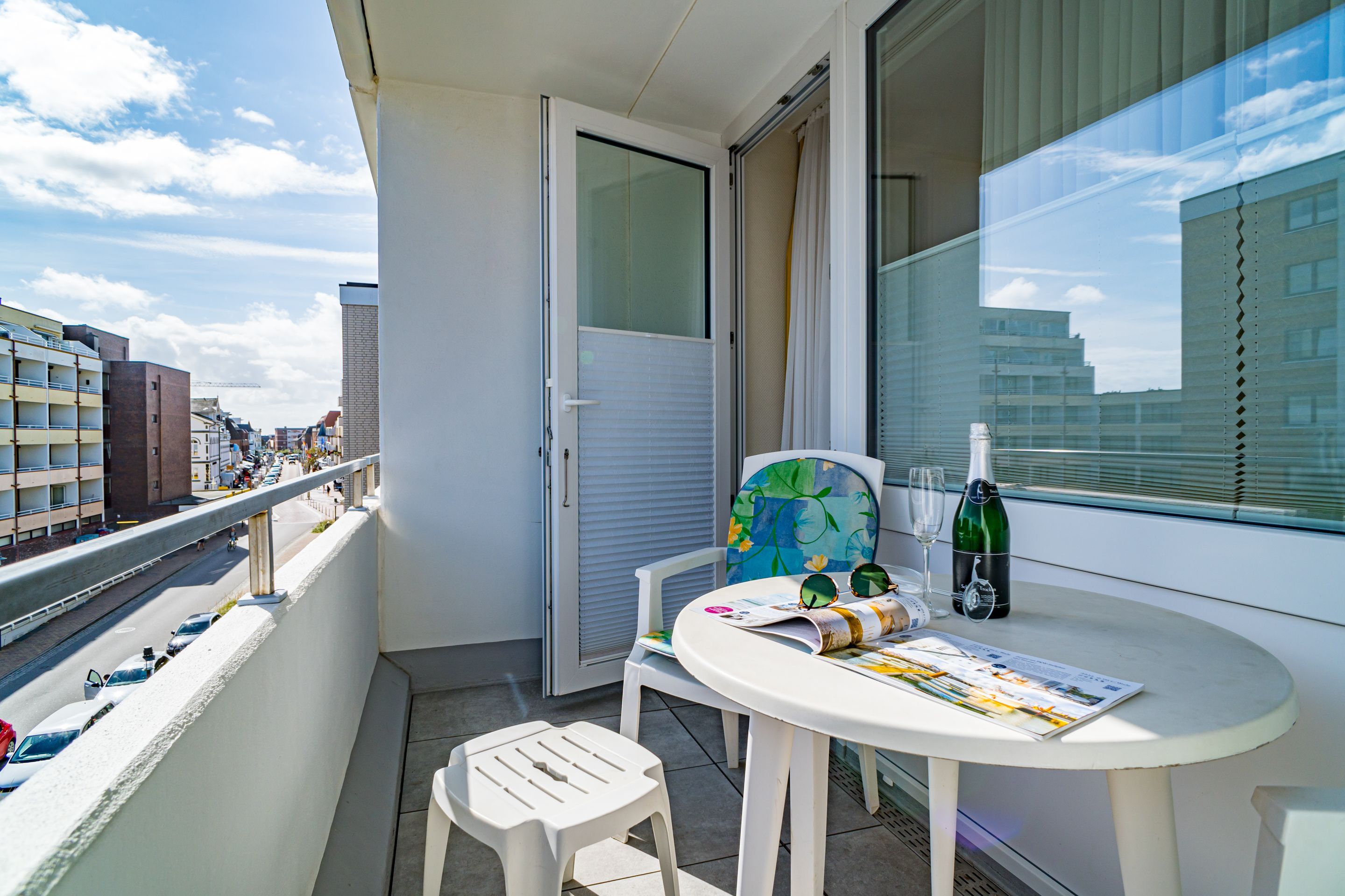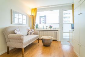 Freundliches 1-Zimmer-Nichtraucher-Appartment mit ansprechender Gesamtausstattung (ca. 23 qm) in der 3. Etage zur Landseite mit Ostloggia (Morgensonne, mit Balkonmöbeln und Auflagen) für max. 2 Personen.
