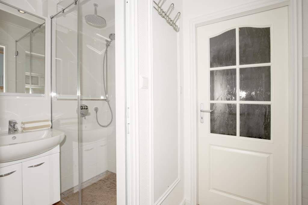 Vom neu gestalteten Vorflur mit Garderobe und Küchenzeile gelangt man in das kombinierte Wohn-/Schlafzimmer (mit Austritt zum Balkon) und in das ebenfalls komplett neu sanierte barrierefreie Duschbad/WC mit einem übergroßem Schiebe-Spiegelschrank mit enorm viel Stauraum und separaten Steckdosen für Rasierer und elektronischen Zahnbürste. Besonders ist die separat zuschaltbare Überkopfbrause zur herkömmlichen Handbrause, für ein angenehmes Wellnessduschen zu nennen. Ein Fön und eine separat zuschaltbare Beleuchtung runden das ansprechende Gesamtambiente des Bades positiv ab.