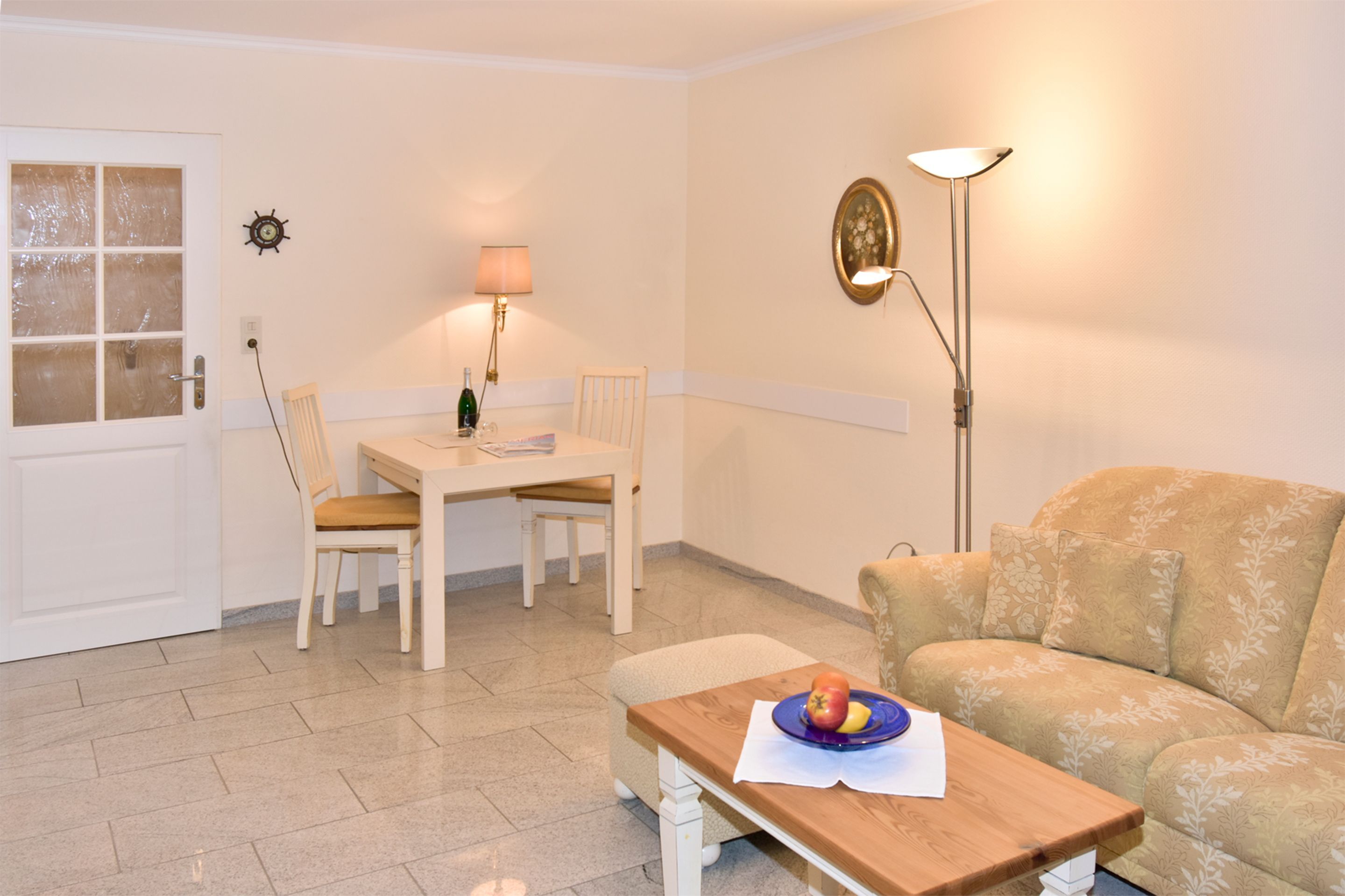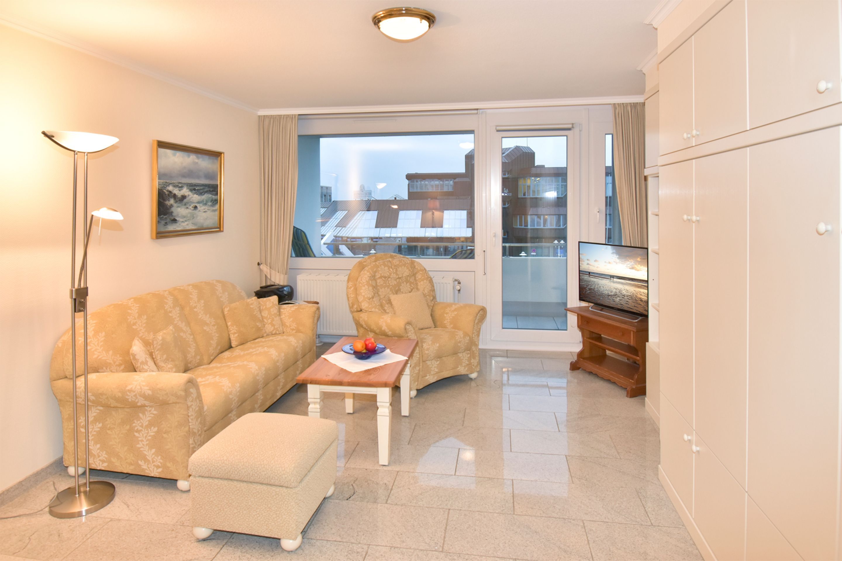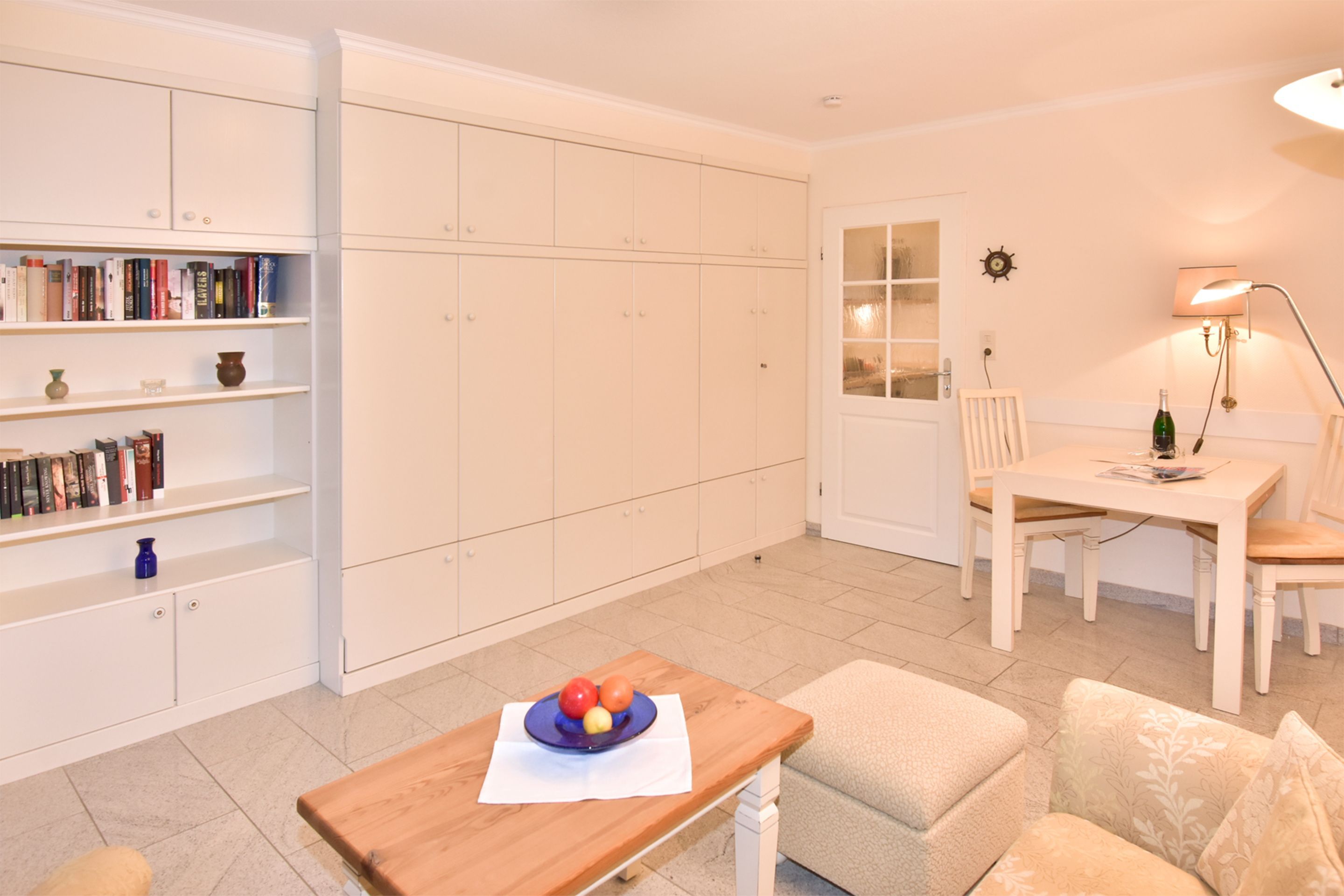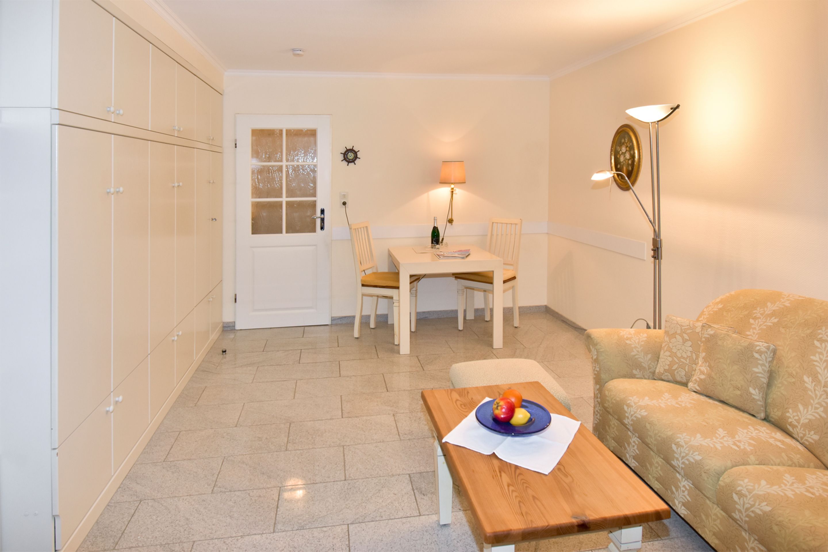Der Wohn-/Schlafraum besteht aus einer gemütlichen Sitzgarnitur (Zweisitzer und Sessel mit Fußhocker), einem Doppelschrankbett (einzeln klappbar), einem Essplatz, Kabel-Flachbild-TV, Radio und kostenlose Internetnutzung per W-Lan.