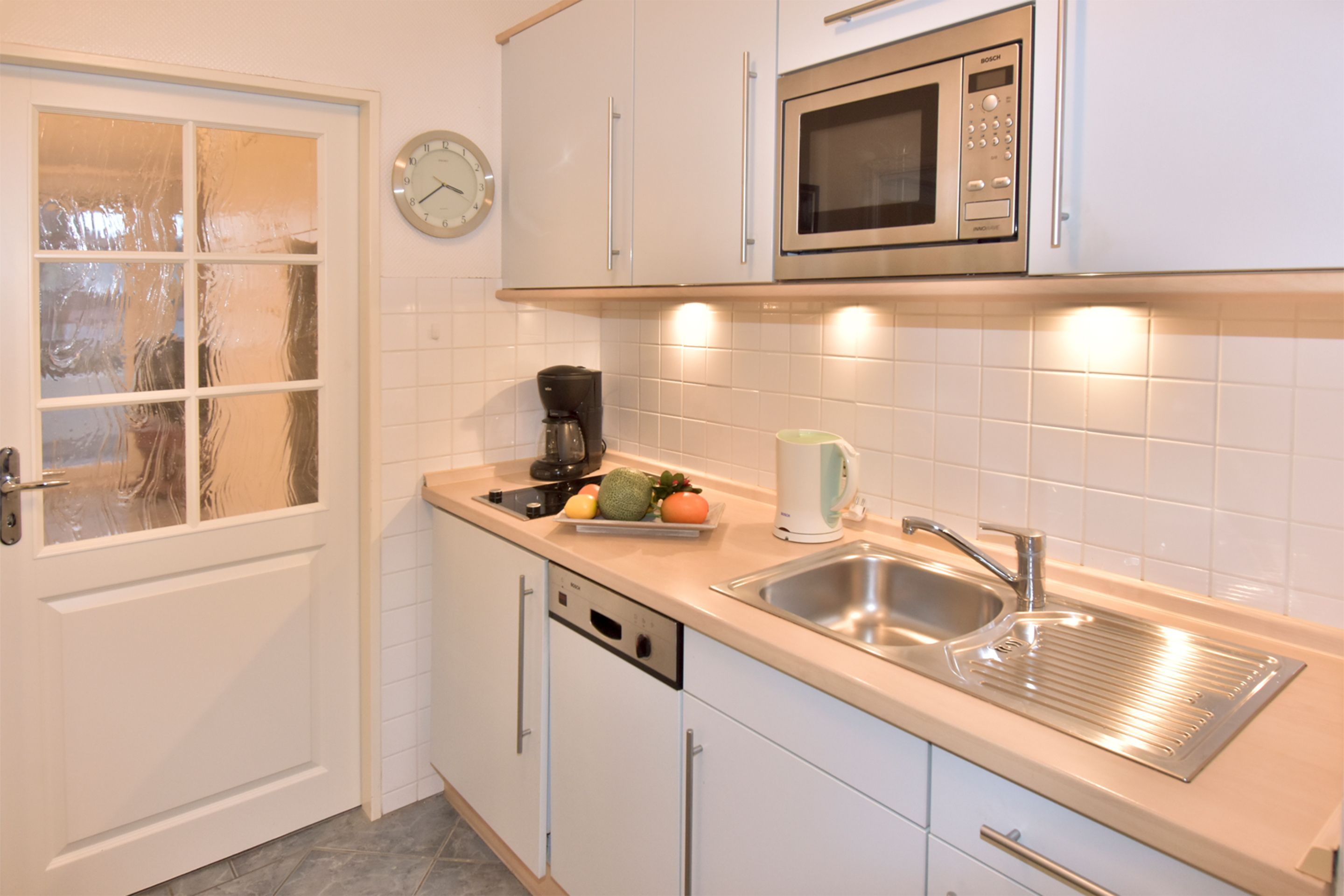 Die Küchenzeile hat einen Geschirrspüler, eine Mikrowelle (Grillfunktion), ein Ceranfeld mit 2 Kochfeldern und einen Kühlschrank mit 3* Gefrierfach. Kaffeemaschine, Wasserkocher und Toaster gehören zur Grundausstattung.
