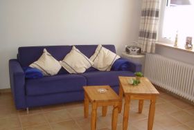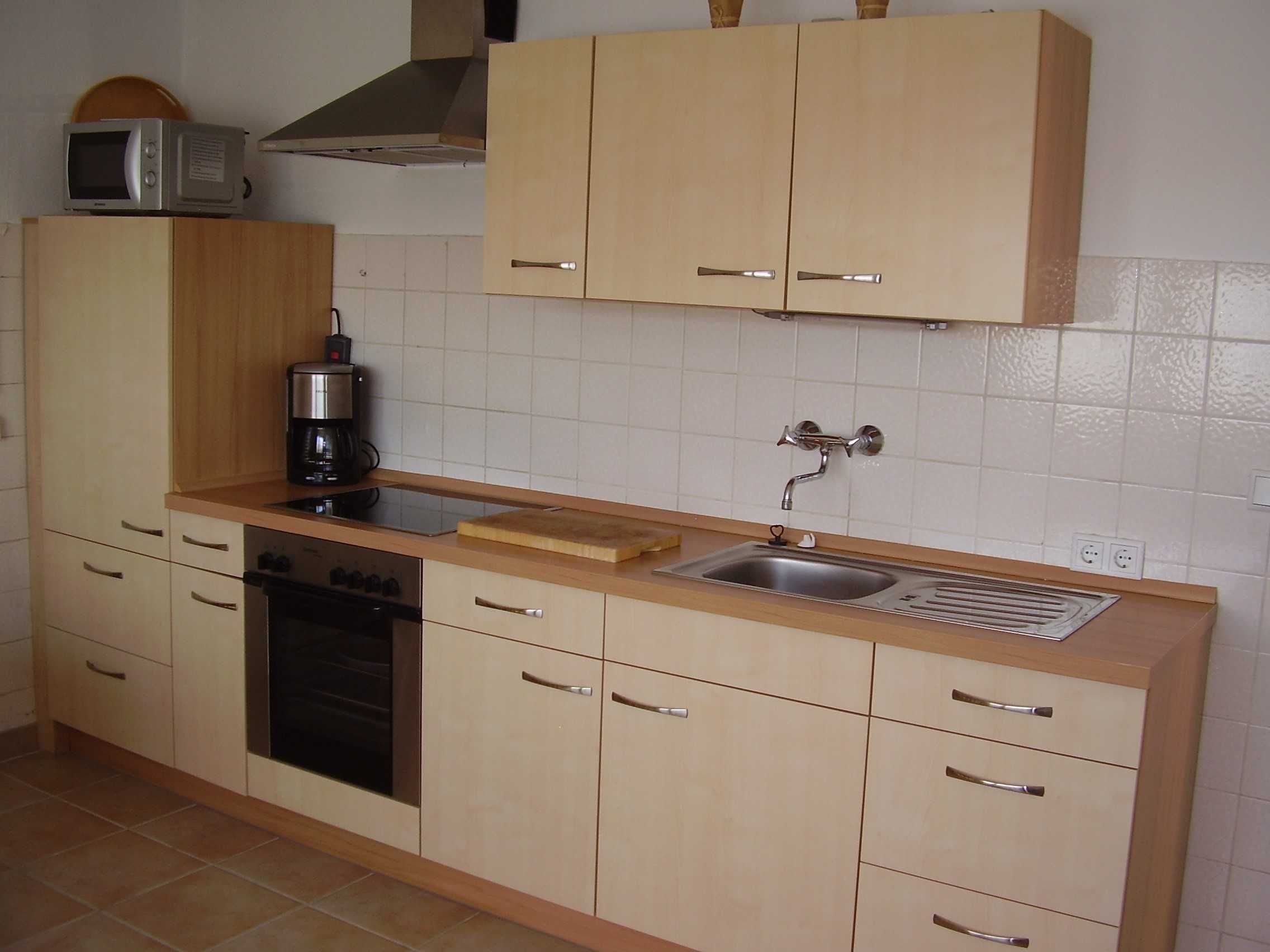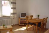 Offener Wohn- und Essbereich mit gemütlicher Sitzgarnitur mit Doppelschlafcouch und Farb-TV, Esstisch mit Bestuhlung und einer Einbauküche mit Kühlschrank, Elektroherd mit Ceranfeld und Backofen, Mikrowelle und allen erforderlichen Elektrogeräten. Eigene Terrasse. Parkplatz.