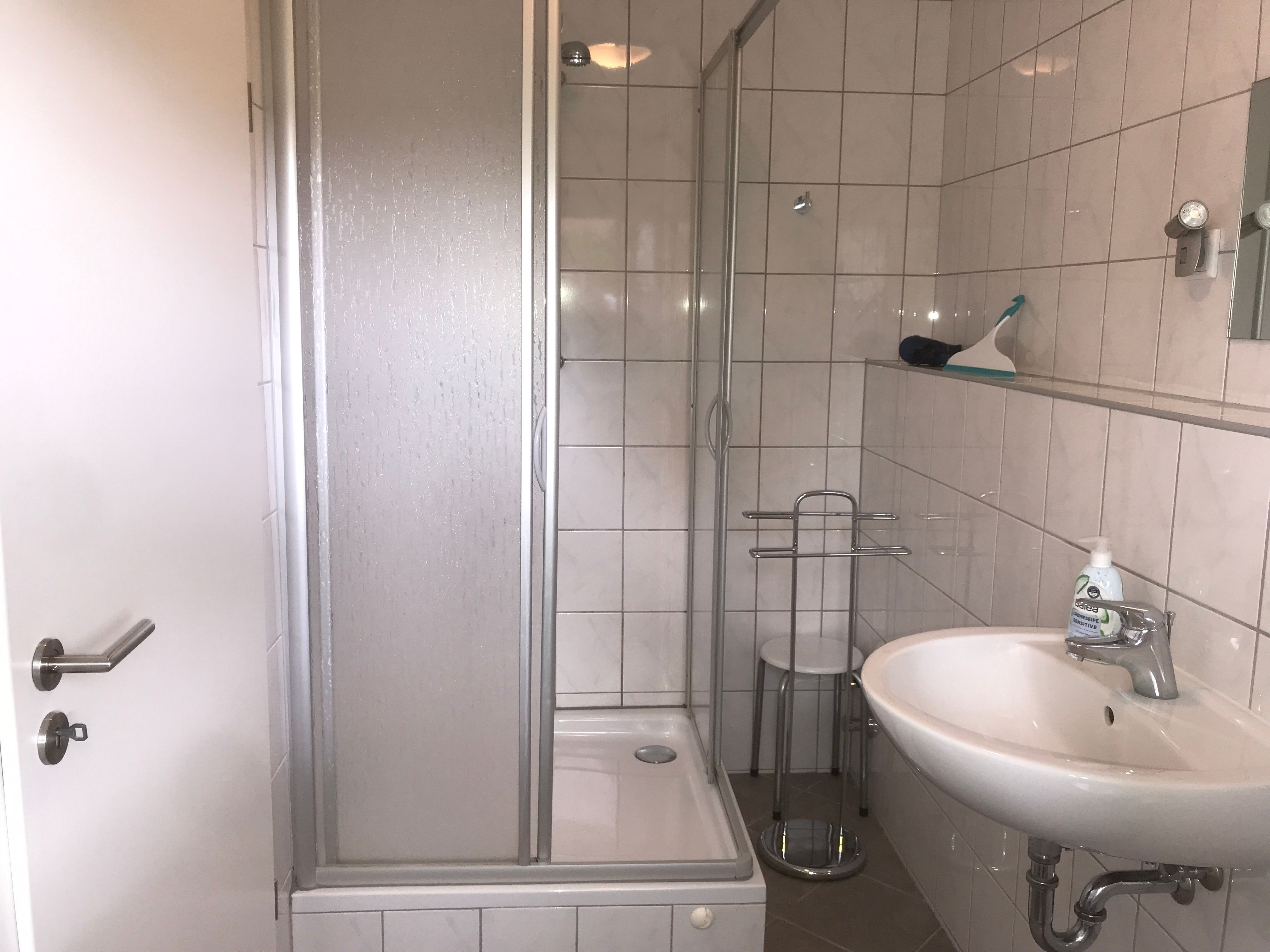 Tageslicht-Badezimmer mit Dusche und WC.