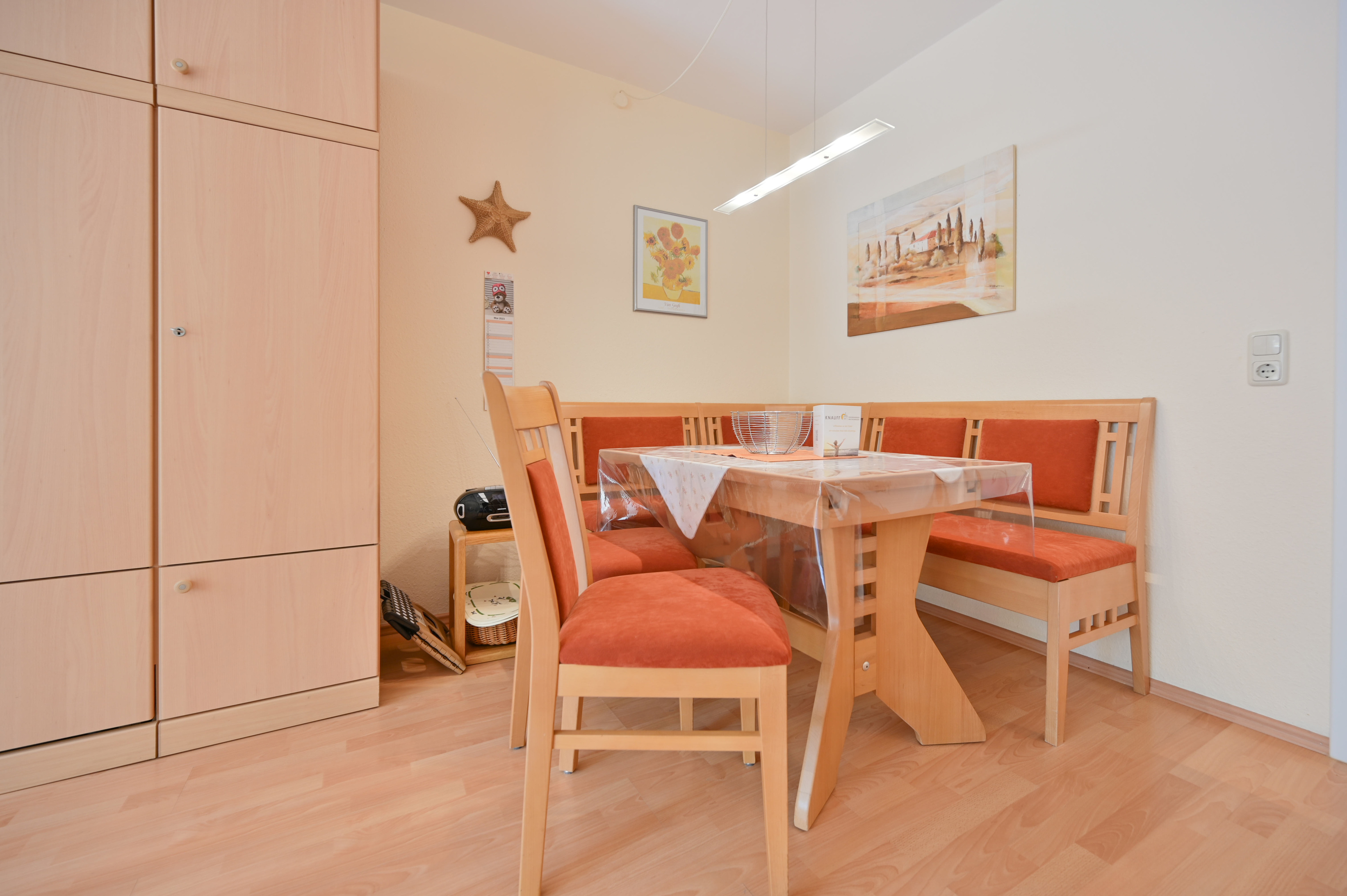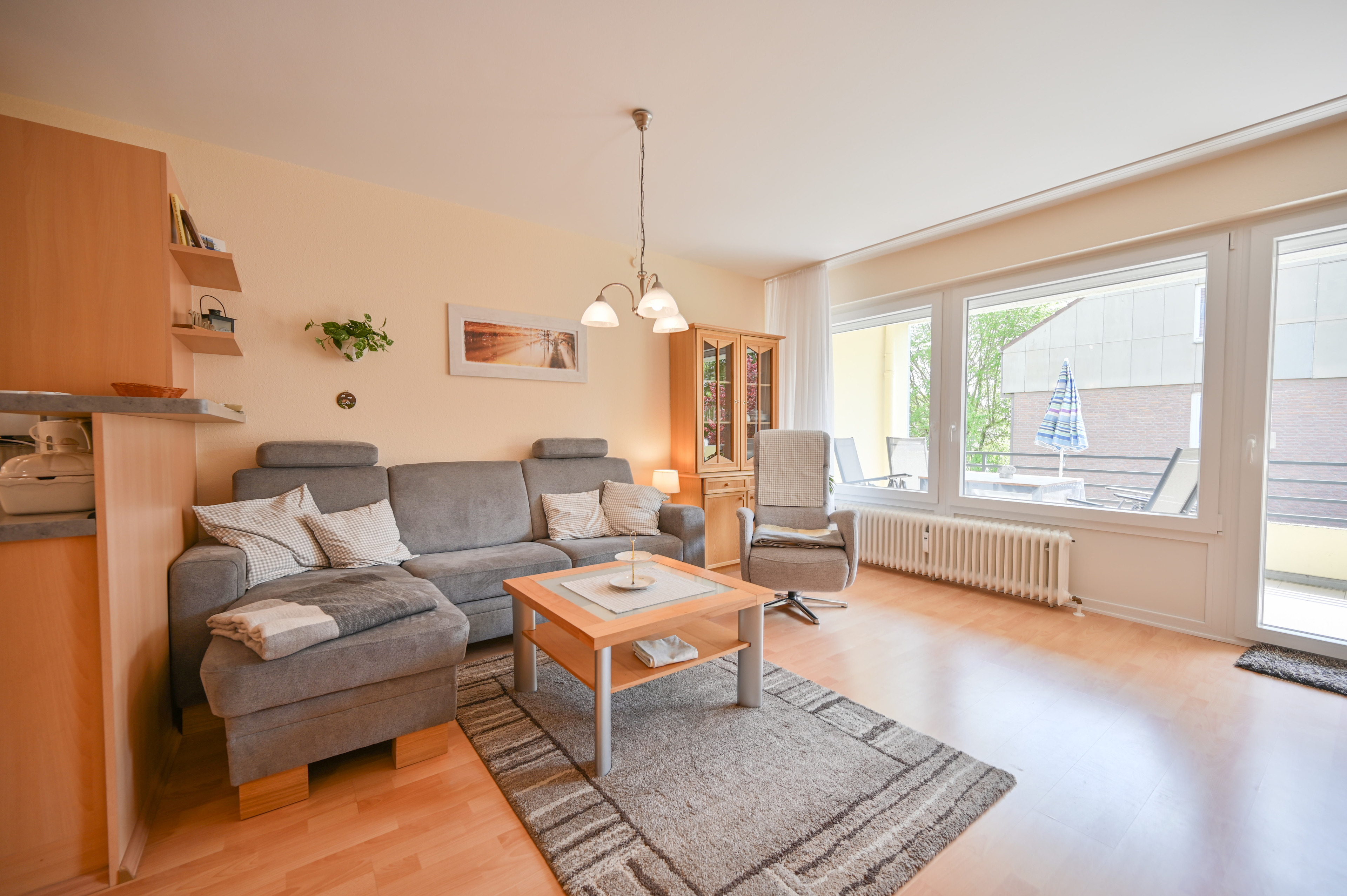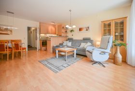 Die Ferienwohnung von Familie Klecha im Ostseebad Kellenhusen verfügt über ein Wohnzimmer mit 3er Couch, 2er Couch, Sessel, Couchtisch, Vitrine, Schrankbett für 2 Personen, Essecke mit Tisch, Eckbank und zwei Stühlen sowie Balkonzugang. Zur Wohnung gehören außerdem eine Einbauküche und ein Schlafzimmer mit zwei Einzelbetten und einem Kleiderschrank.