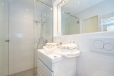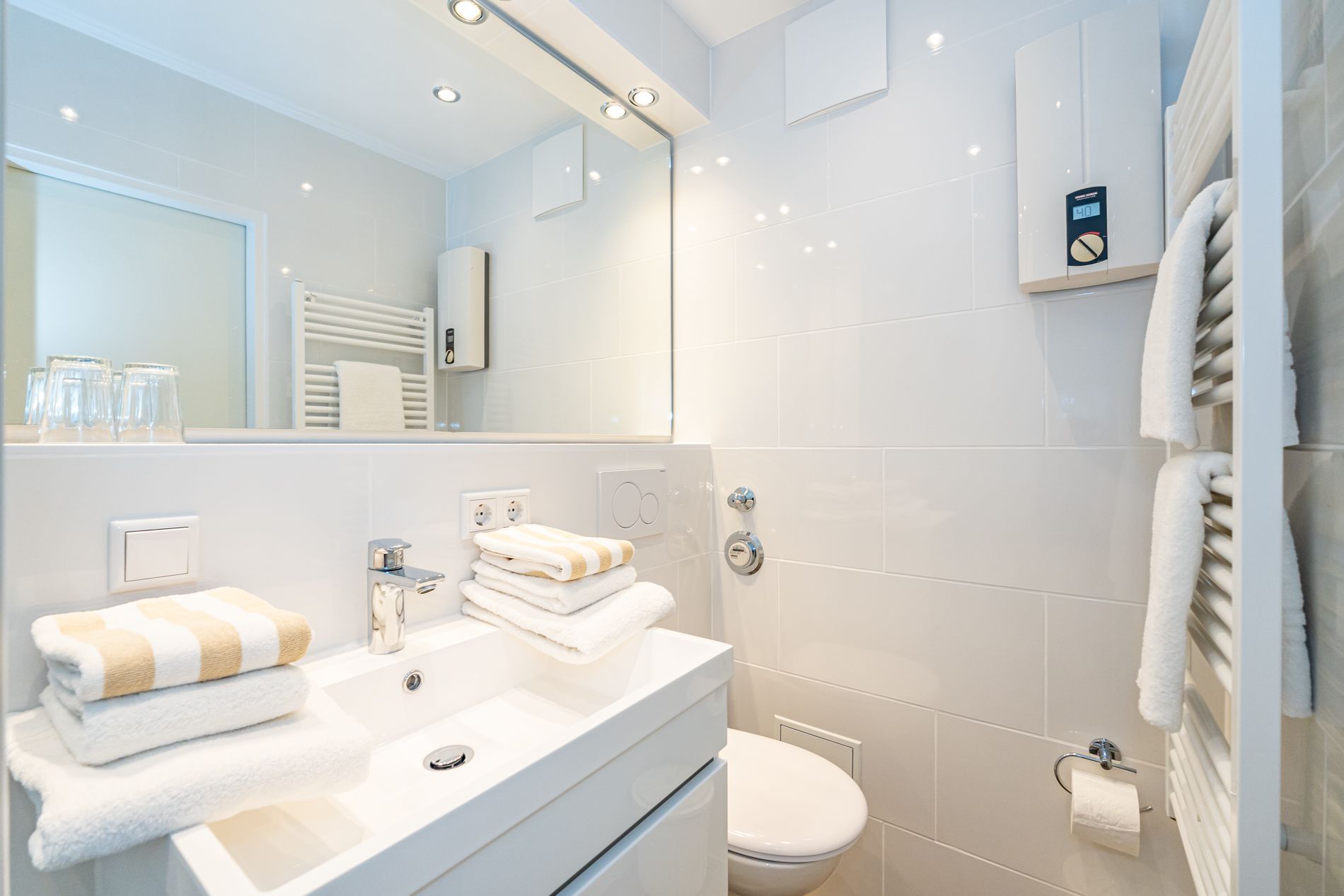 Im Bad befinden sich eine Dusche, ein WC, und ein Waschtisch.