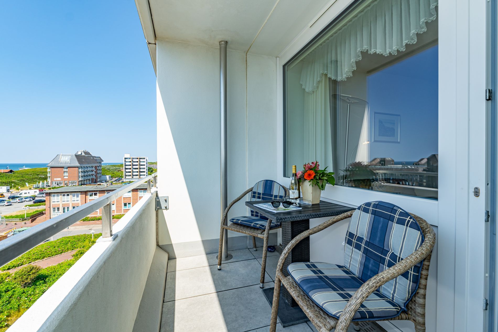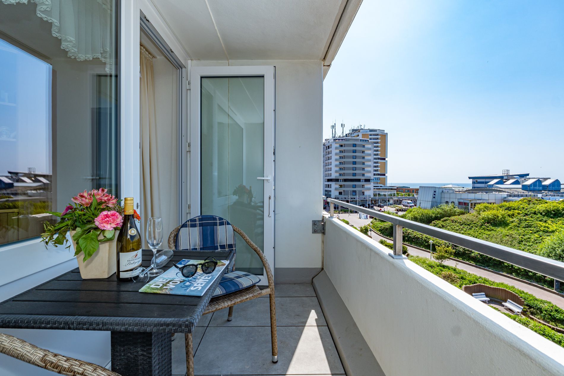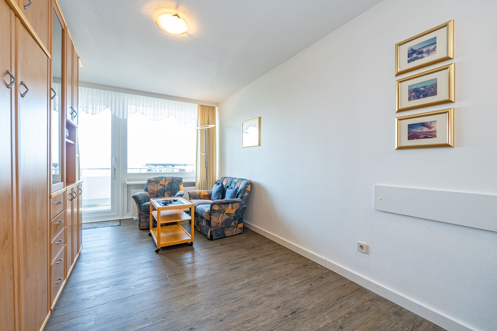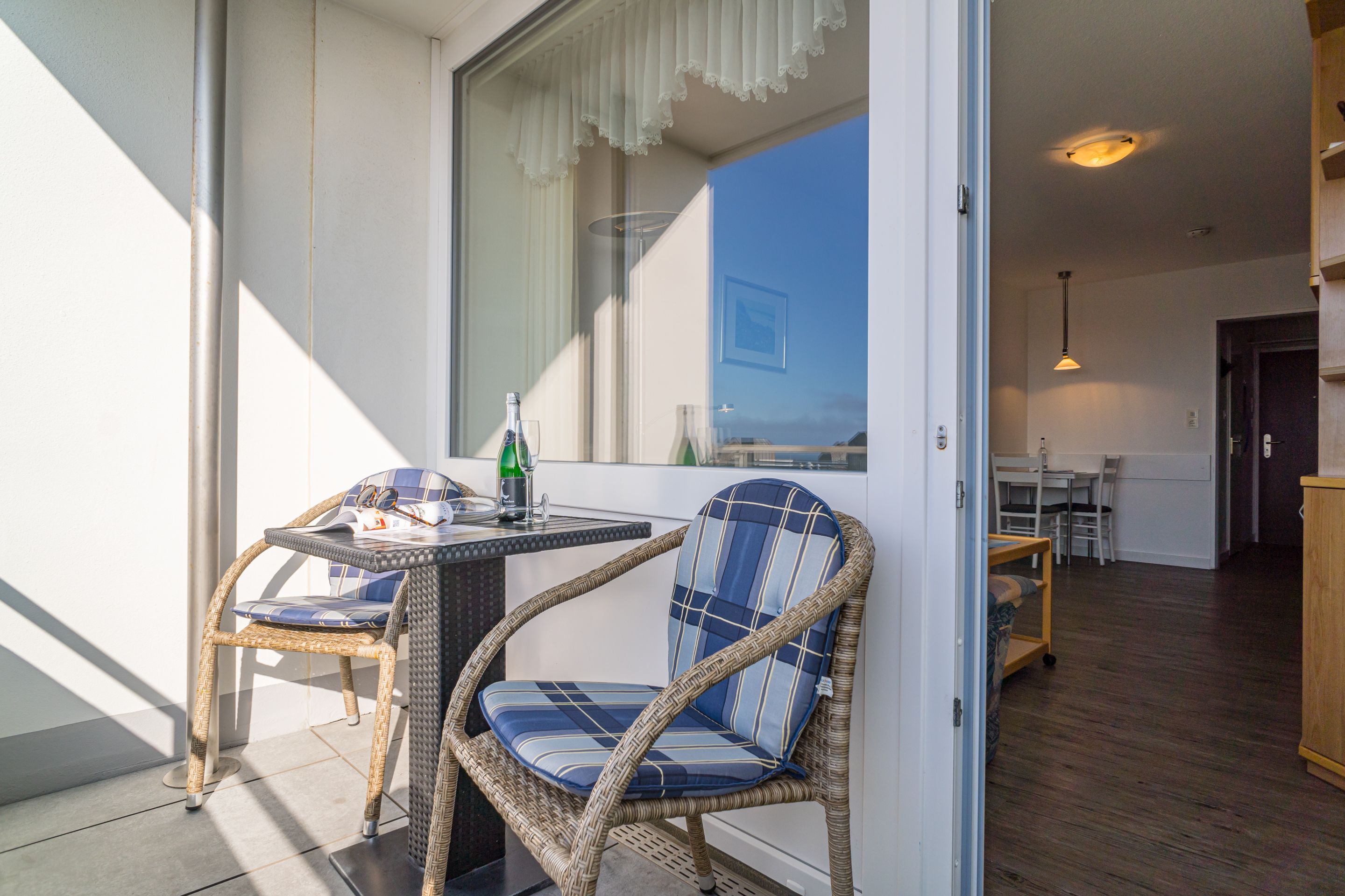 1-Zimmer-Nichtraucher-Ferienwohnung (ca. 25 qm) in der 4. Etage zur Seeseite mit Westloggia und traumhaftem Meerblick (Nachmittagssonne, mit Balkonmöbeln und Auflagen) für max. 2 Personen.