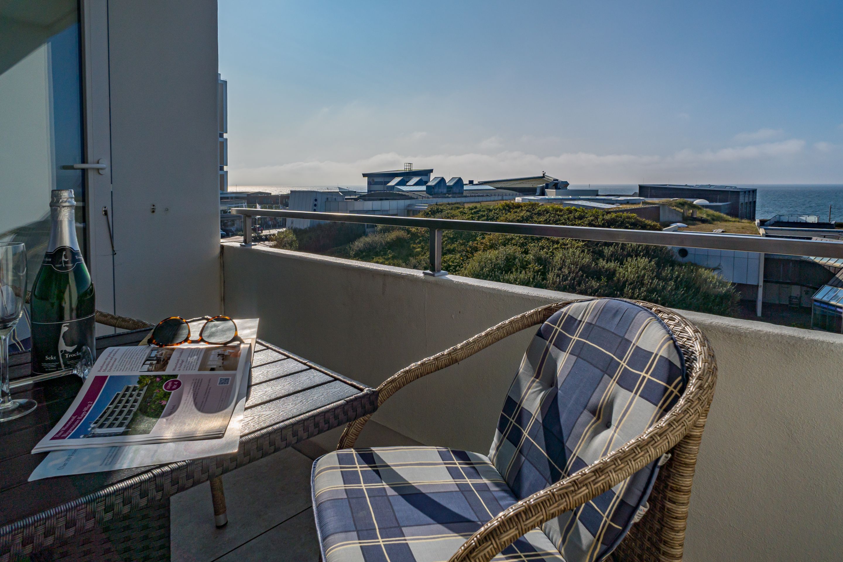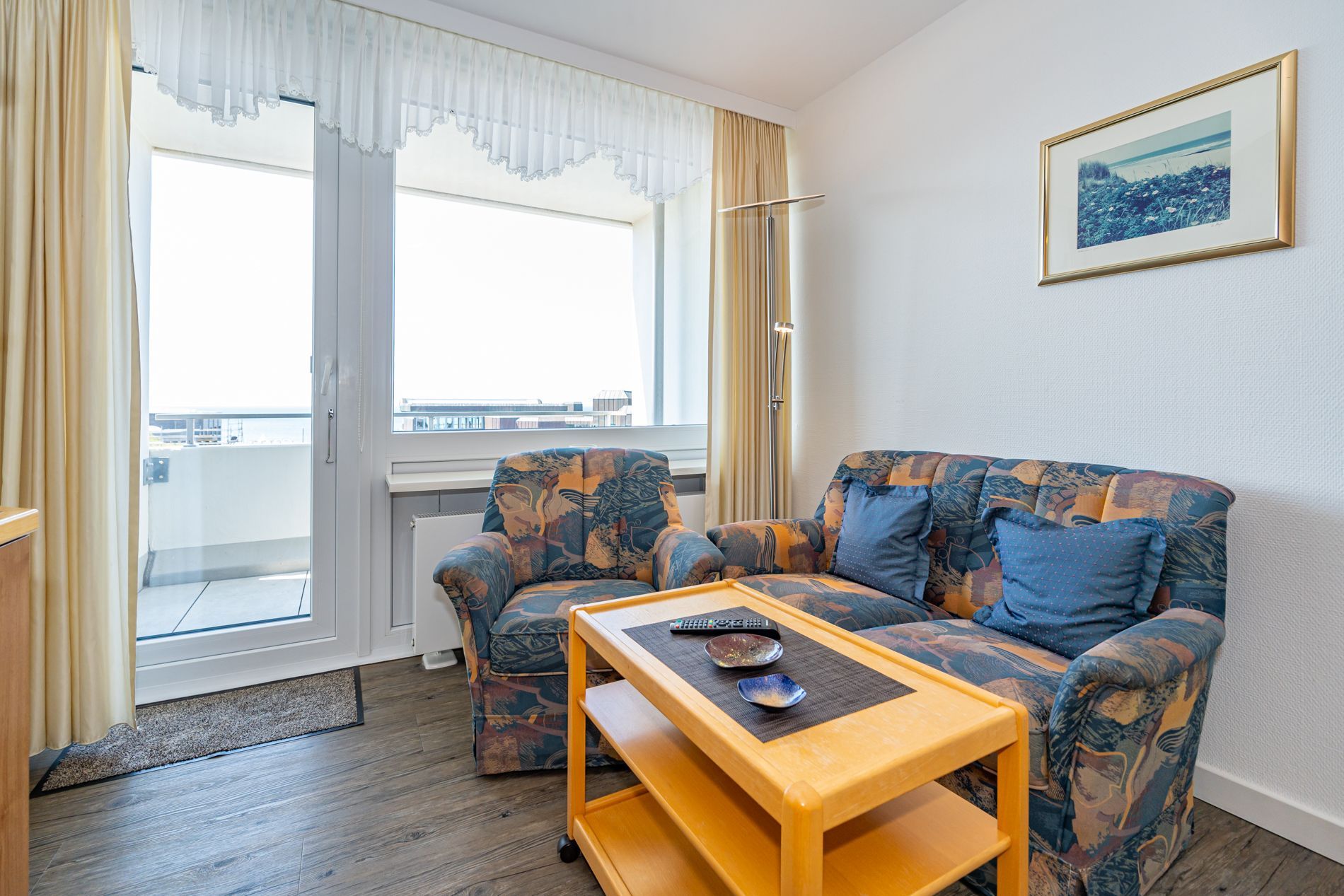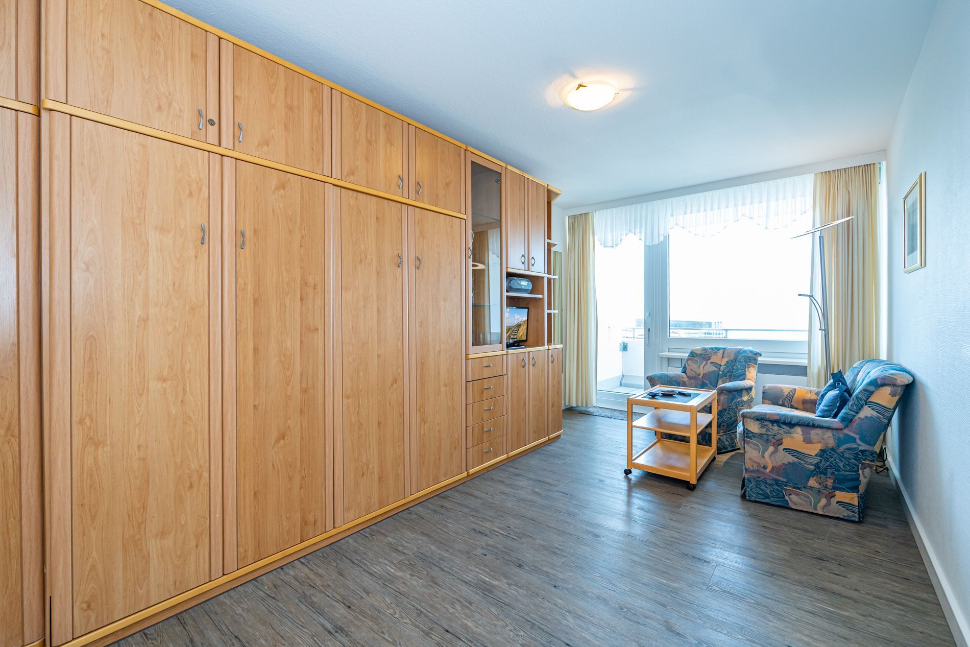 1-Zimmer-Nichtraucher-Ferienwohnung (ca. 25 qm) in der 4. Etage zur Seeseite mit Westloggia und traumhaftem Meerblick (Nachmittagssonne, mit Balkonmöbeln und Auflagen) für max. 2 Personen.