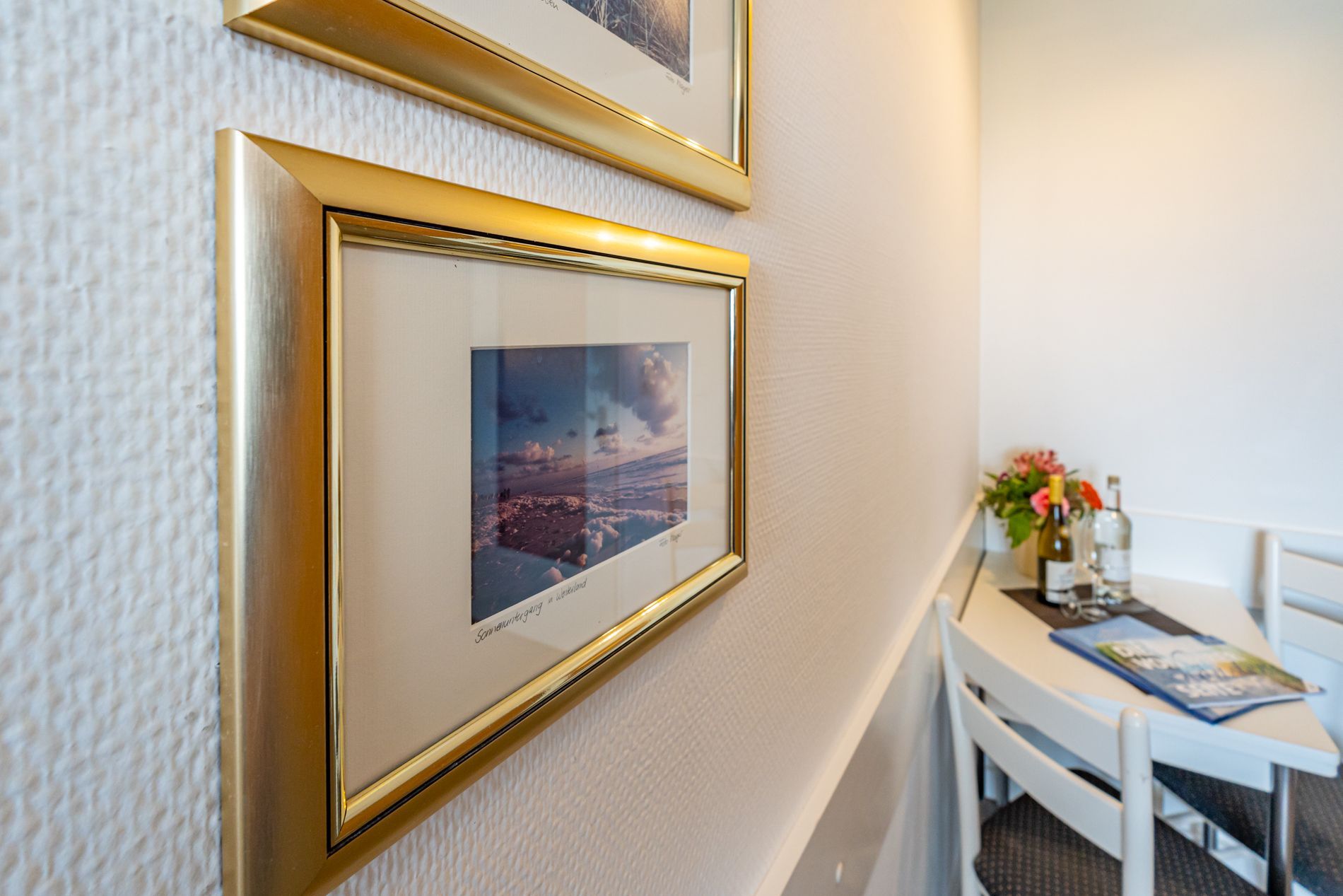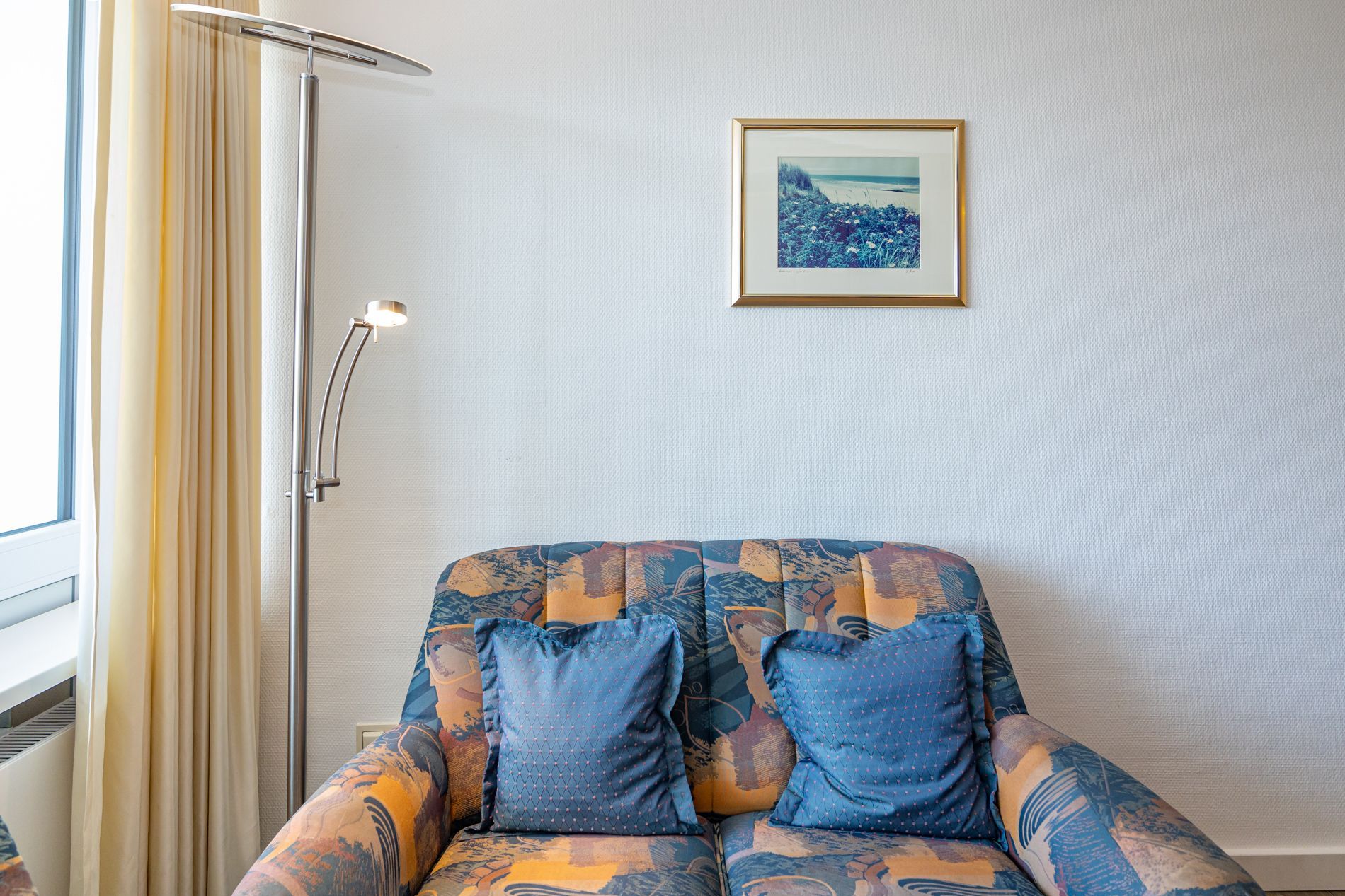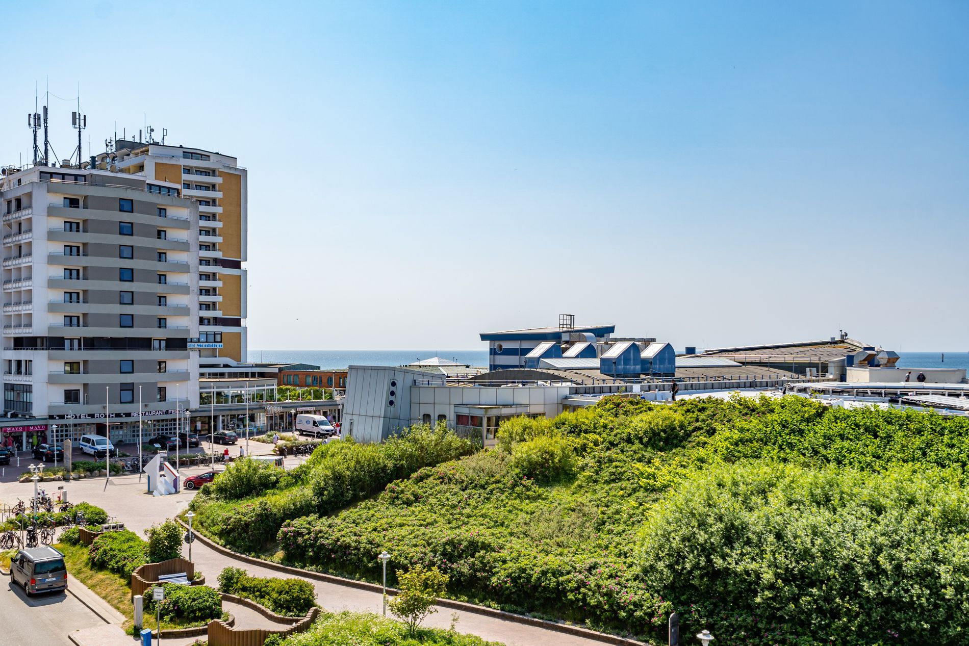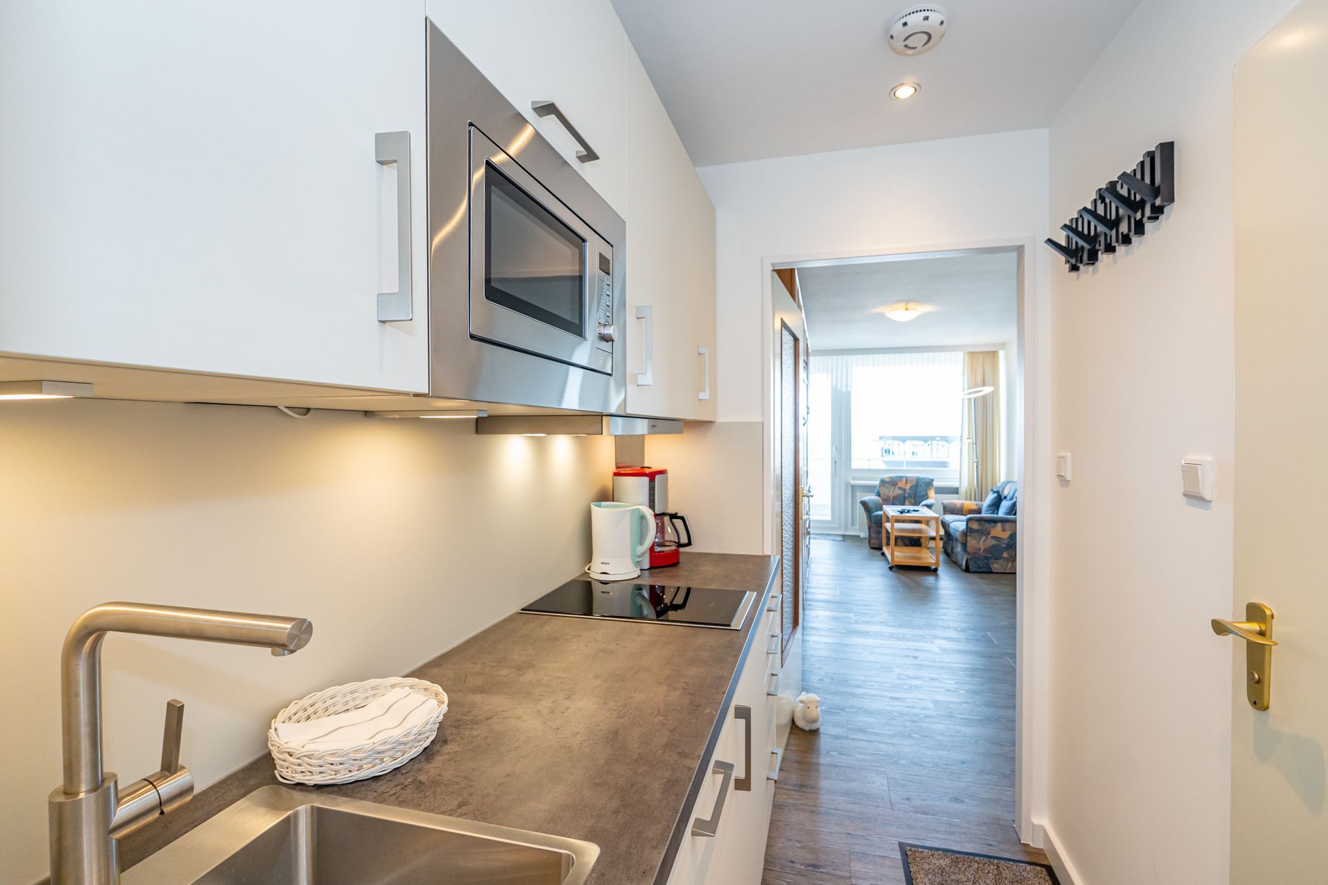 1-Zimmer-Nichtraucher-Ferienwohnung (ca. 25 qm) in der 4. Etage zur Seeseite mit Westloggia und traumhaftem Meerblick (Nachmittagssonne, mit Balkonmöbeln und Auflagen) für max. 2 Personen.