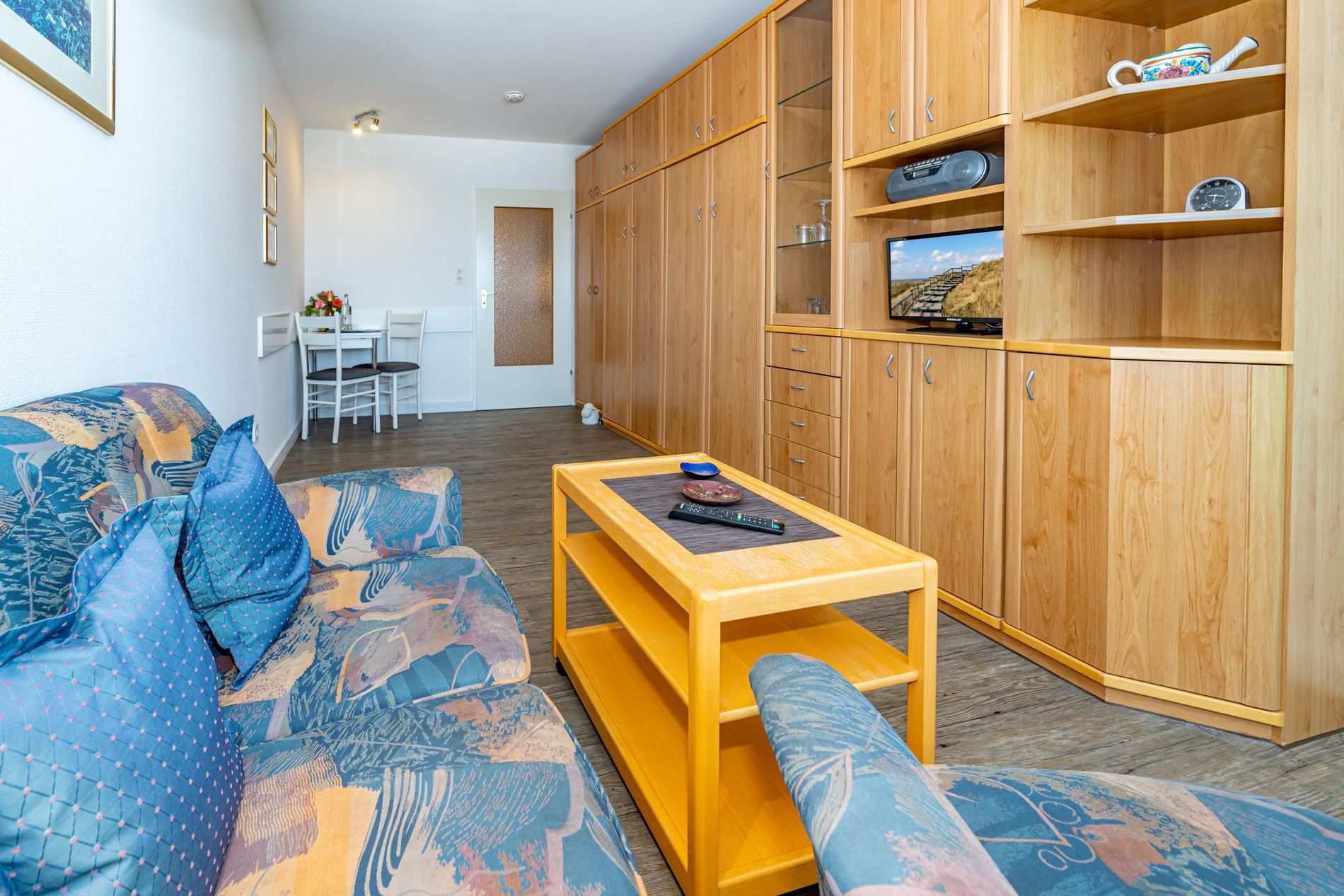 Der Wohn-/Schlafraum besteht aus einer gemütlichen Sitzgarnitur (2-Sitzer-Couch, Sessel), einem Essplatz, Doppelschrankbett, Kabel-Flachbild-TV, Radio.