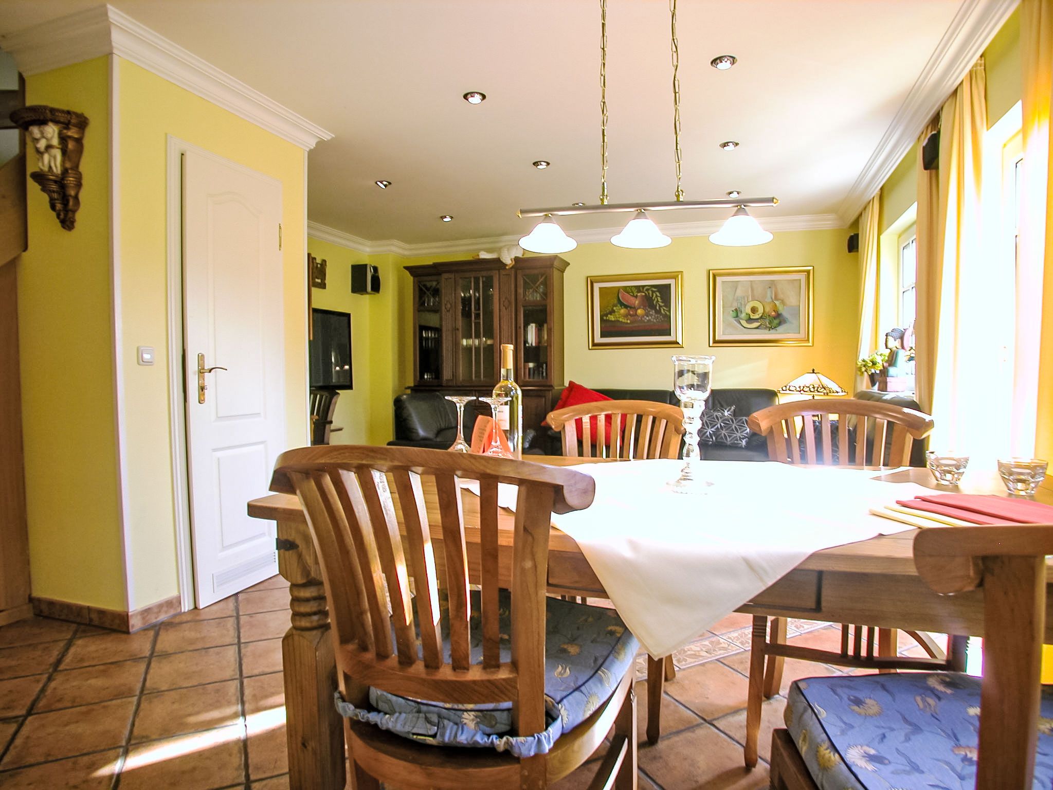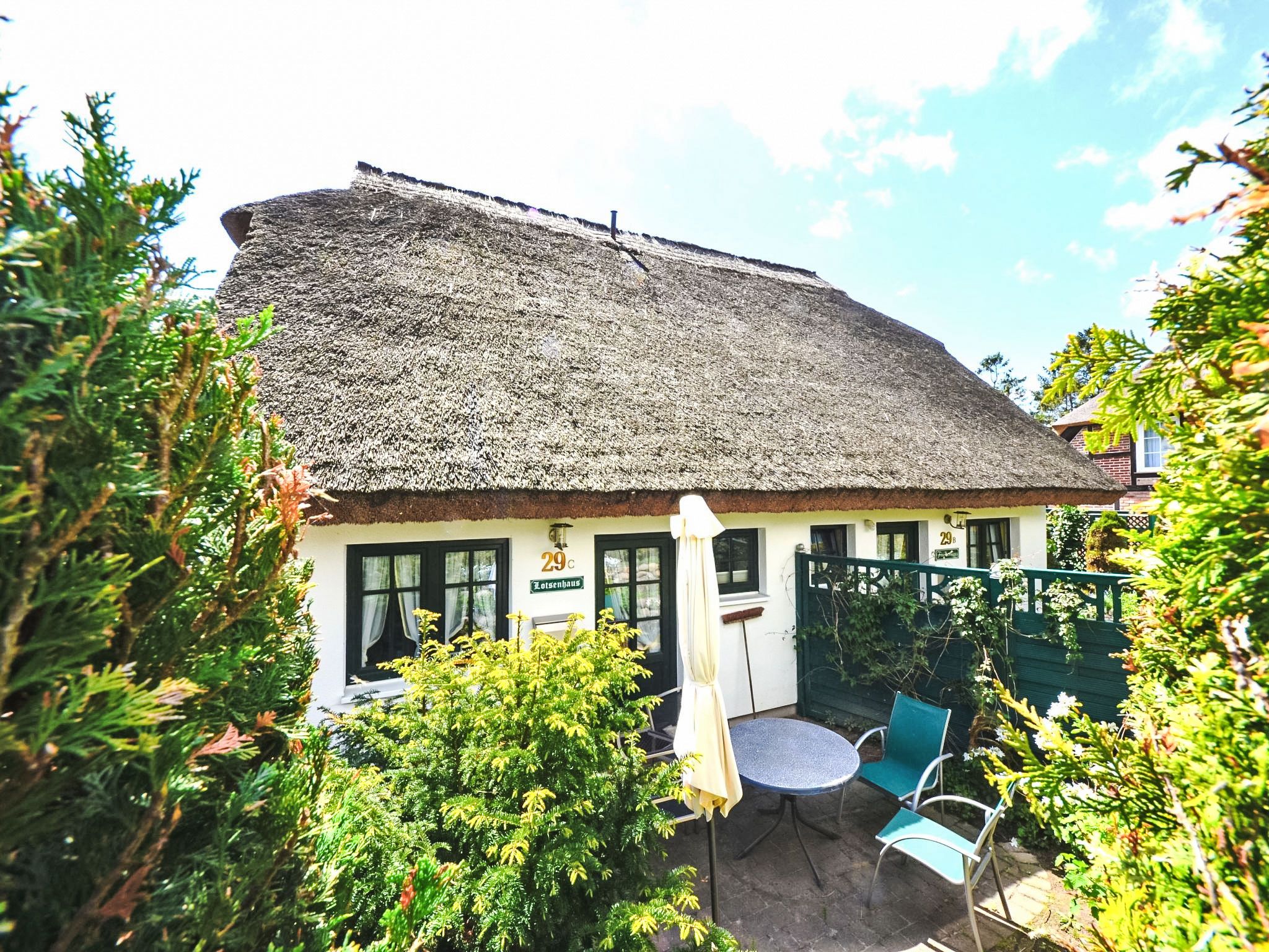 Reihenhaus. Im Ort, 700 m vom Meer, 2 km vom Strand. Im Hause: Zentralheizung. Parkplatz beim Haus. Lebensmittelgeschäft, Restaurant 200 m, Bushaltestelle 600 m, Bahnstation 20 km, Sandstrand 2 km, Freibad 13 km, Hallenbad 13 km, Badebucht 2 km. Golfplatz (18 Loch) 30 km, Reitstall 5 km. Die drei reetgedeckten Reihenhäuser und das dahinter liegende Doppelhaus (DE9098.120.1 und DE9098.120.2) sind hochwertig ausgestattet und die Inneneinrichtung ist bis ins Detail abgestimmt. Jedes Reihenhaus verfügt über einen mindestens 109 cm grossen TV-Bildschirm im Wohn-/Esszimmer.