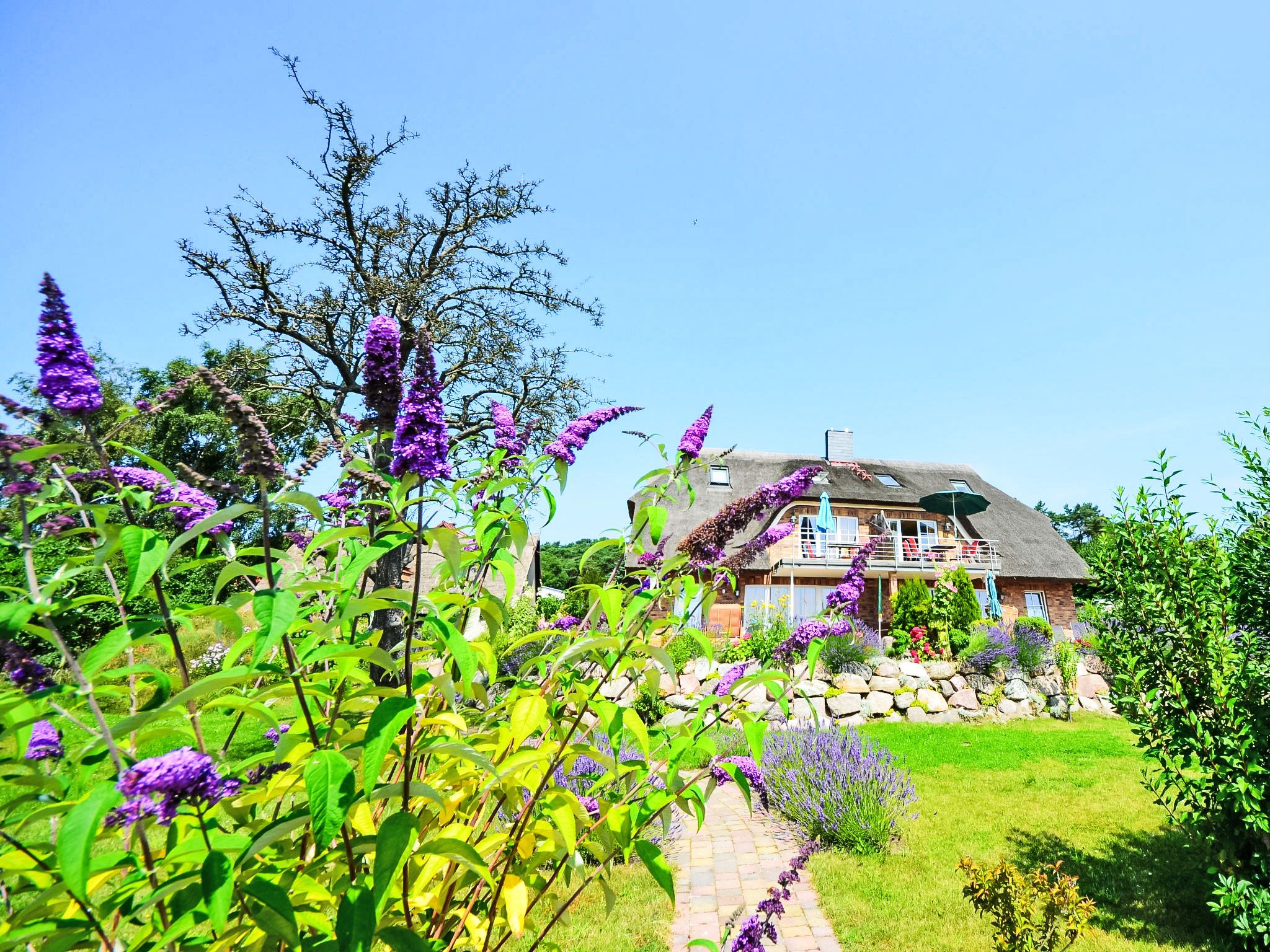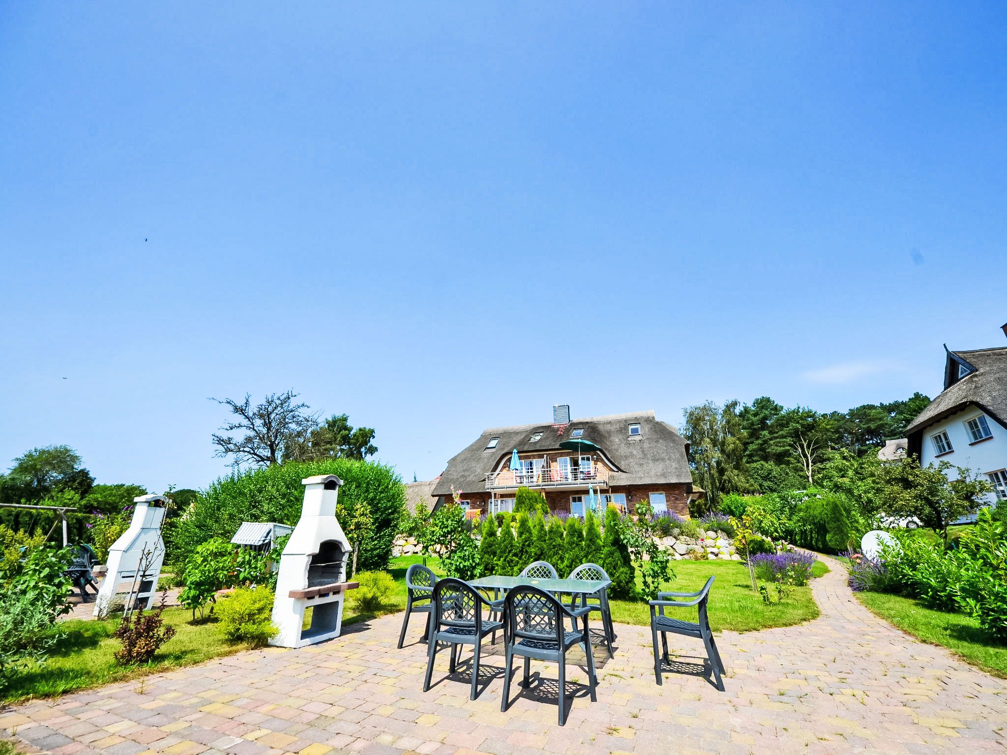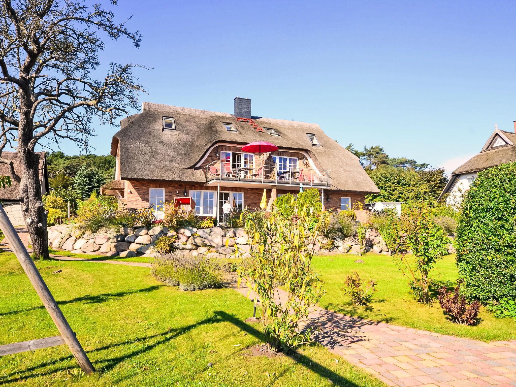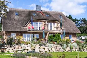 Doppelhaus. Im Ort, 500 m vom Meer, 2 km vom Strand. Zur Mitbenutzung: schöner, gepflegter Garten. Grill, Grillhaus. Im Hause: Zentralheizung. Parkplatz (beschränkte Anzahl) beim Haus. Lebensmittelgeschäft 500 m, Restaurant, Bushaltestelle 300 m, Bahnstation 20 km, Sandstrand 2 km, Freibad 13 km, Hallenbad 13 km, Badebucht 2 km. Golfplatz (18 Loch) 30 km, Reitstall 5 km. Die beiden reetgedeckten Doppelhaushälften mit jeweils zwei Wohnungen liegen in erster Reihe zum Meer und bieten von allen Wohnungen direkten Blick auf die Ostsee, den kleinen Hafen von Gross-Zicker sowie auf die gegenüber der Bucht liegenden Orte Thissow und Klein-Zicker. Die Ferienwohnungen sind hochwertig ausgestattet und die Inneneinrichtung ist bis ins Detail aufeinander abgestimmt.