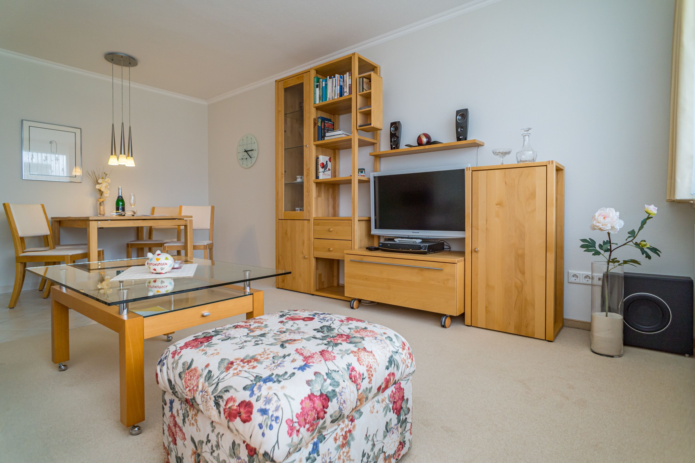 Der helle Wohnbereich verfügt über eine bequeme 3-Sitzer-Schlafcouch (Liegefläche ca. 1,50 x 1,90 m), einen Polsterhocker, Kabel-Flachbild-TV, DVD-Player sowie ein Soundsystem – ideal für gemütliche Abende.