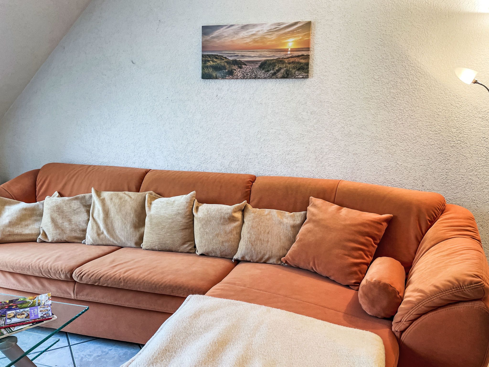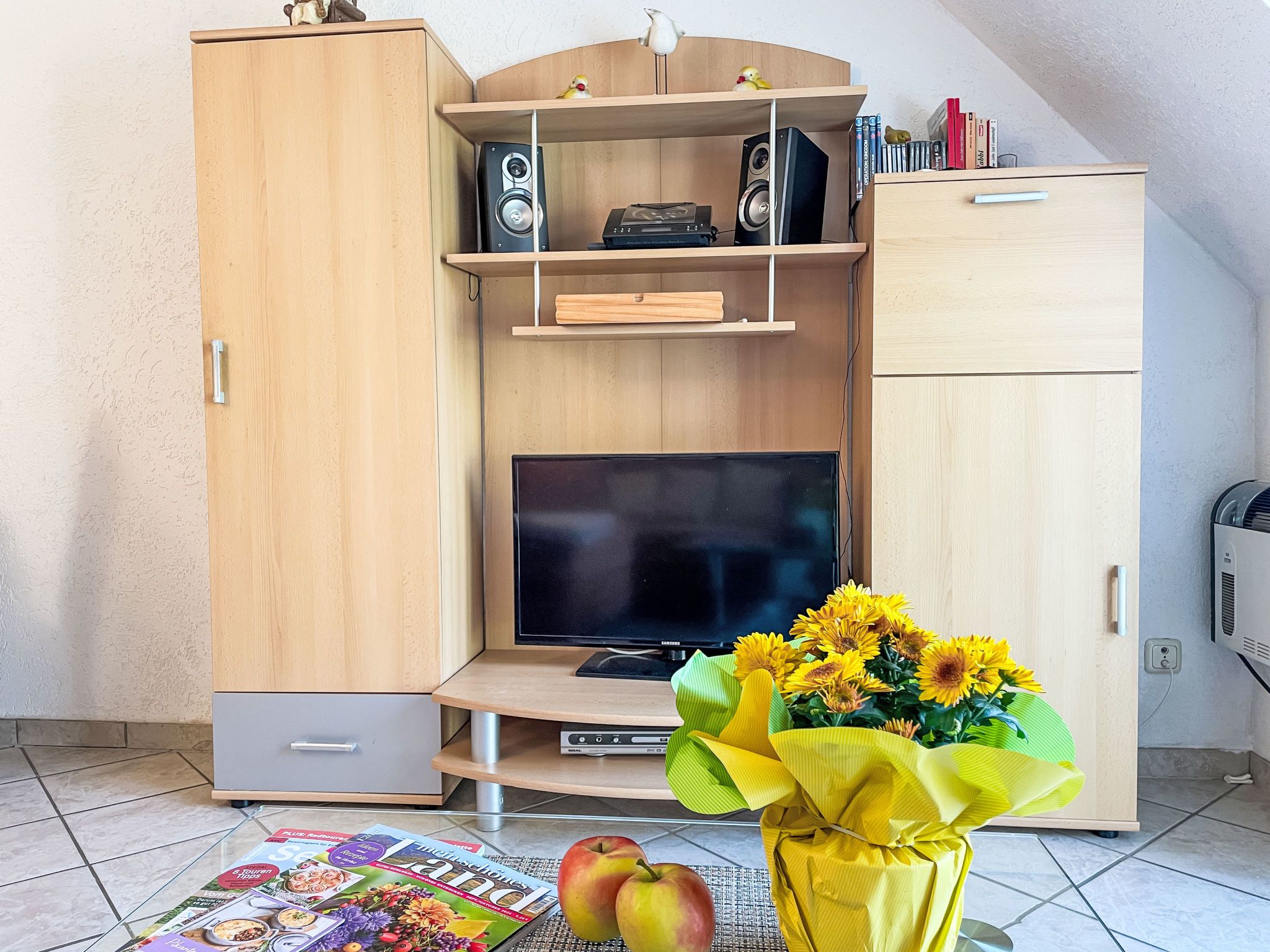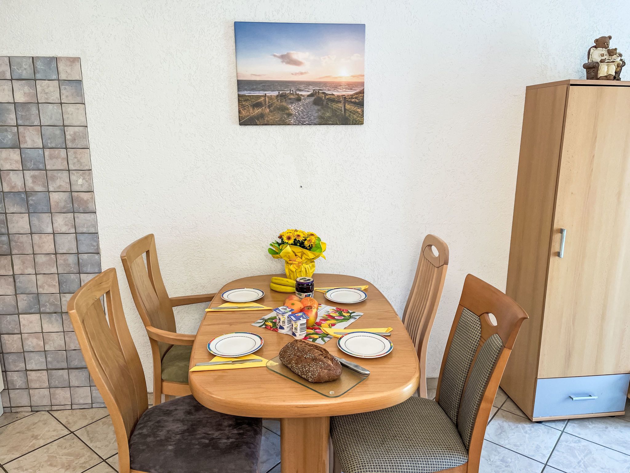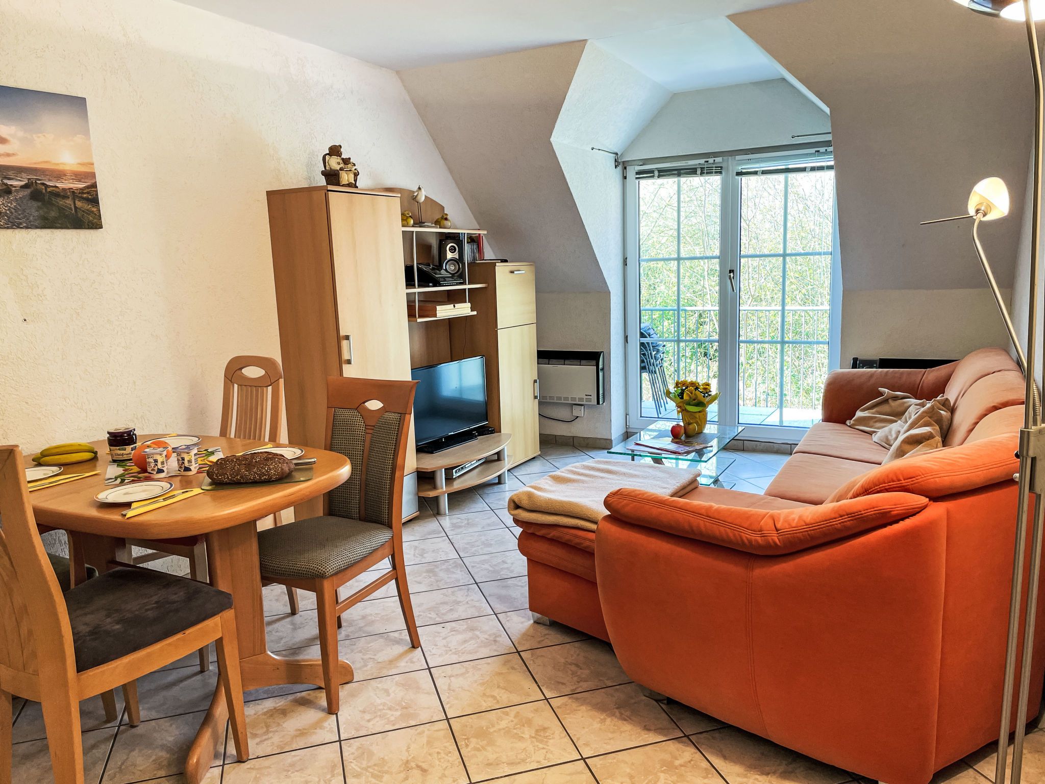 3-Zimmer-Wohnung 46 m2 im 1. Stock. Teilweise abgeschrägt: Wohn-/Esszimmer mit Sat-TV (Flachbildschirm), CD. Ausgang zum Balkon. 1 Zimmer mit 1 Doppelbett (180 cm, Länge 200 cm). 1 Kinderzimmer mit 1 Bett (80 cm, Länge 200 cm), 1 Schlafmöglichkeit (90 cm, Länge 200 cm). Kochnische (Backofen, Geschirrspüler, 4 Glaskeramikplatten, Toaster, Wasserkocher, elektrische Kaffeemaschine). Dusche/WC. E-Heizung. Kleiner Balkon 5 m2, Südlage. Balkonmöbel. Zur Verfügung: Internet (WLAN, gratis). Bitte beachten: Nichtraucher-Unterkunft. Maximal 1 Haustier/Hund erlaubt. Rauchmelder. Die Schlafmöglichkeit im Kinderzimmer ist ein Ausziehbett (Tandembett).