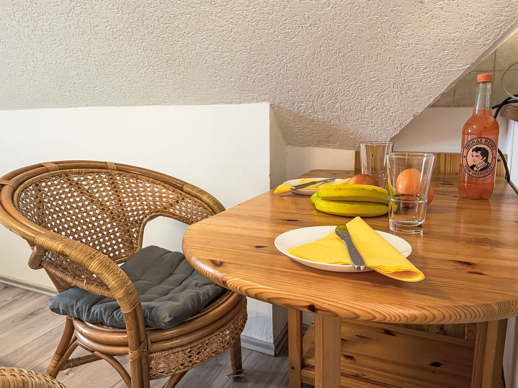 1-Zimmer-Wohnung 24 m2 im 2. Stock. Abgeschrägtes Wohn-/Schlafzimmer mit 1 Doppelbett (180 cm, Länge 200 cm), Sat-TV (Flachbildschirm), DVD. Kochnische (2 Kochplatten, elektrische Kaffeemaschine). Dusche/WC. E-Heizung. Zur Verfügung: Internet (Wireless LAN, gratis). Bitte beachten: Nichtraucher-Unterkunft. Rauchmelder.