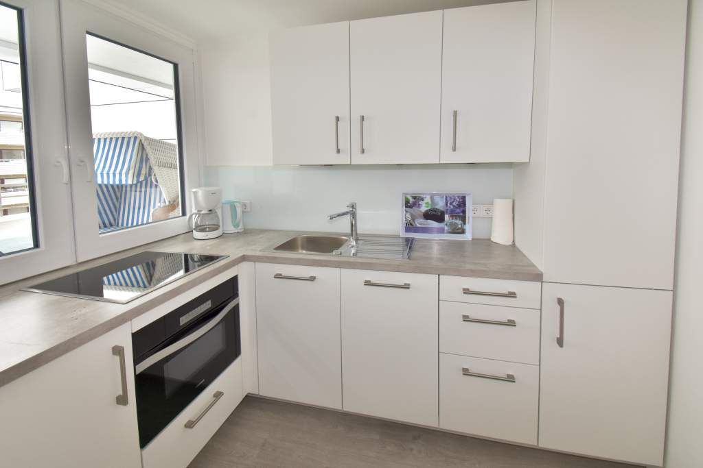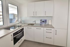 Die separate neue Küche hat einen Geschirrspüler, einen Herd mit 4-Platten-Cerankochfeld und Backofen. Kaffeemaschine, Wasserkocher und Toaster gehören zur Grundausstattung.