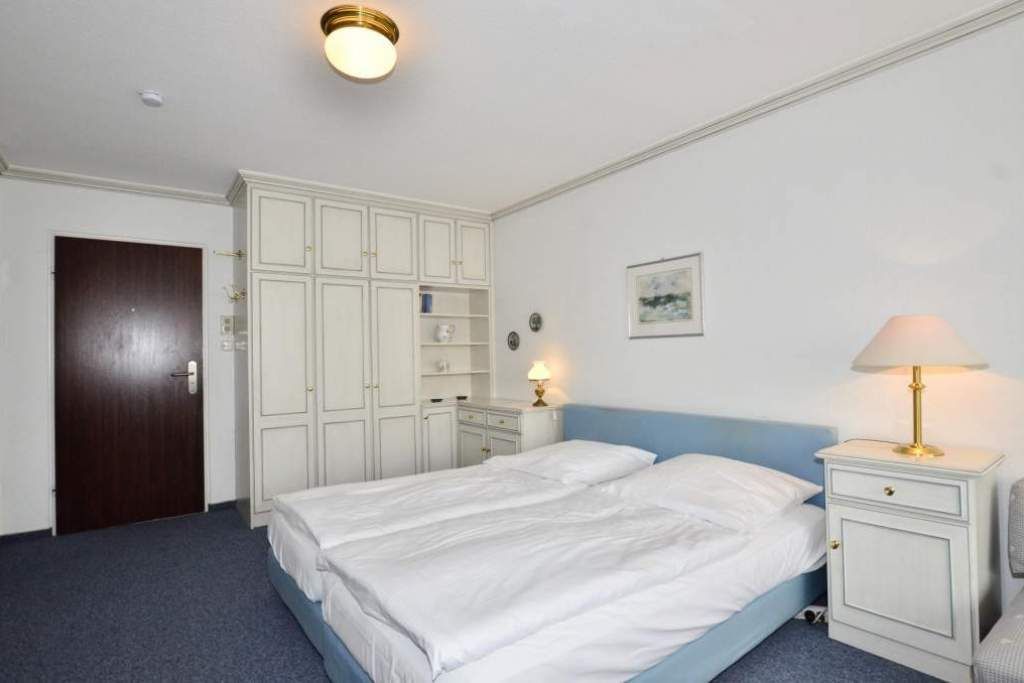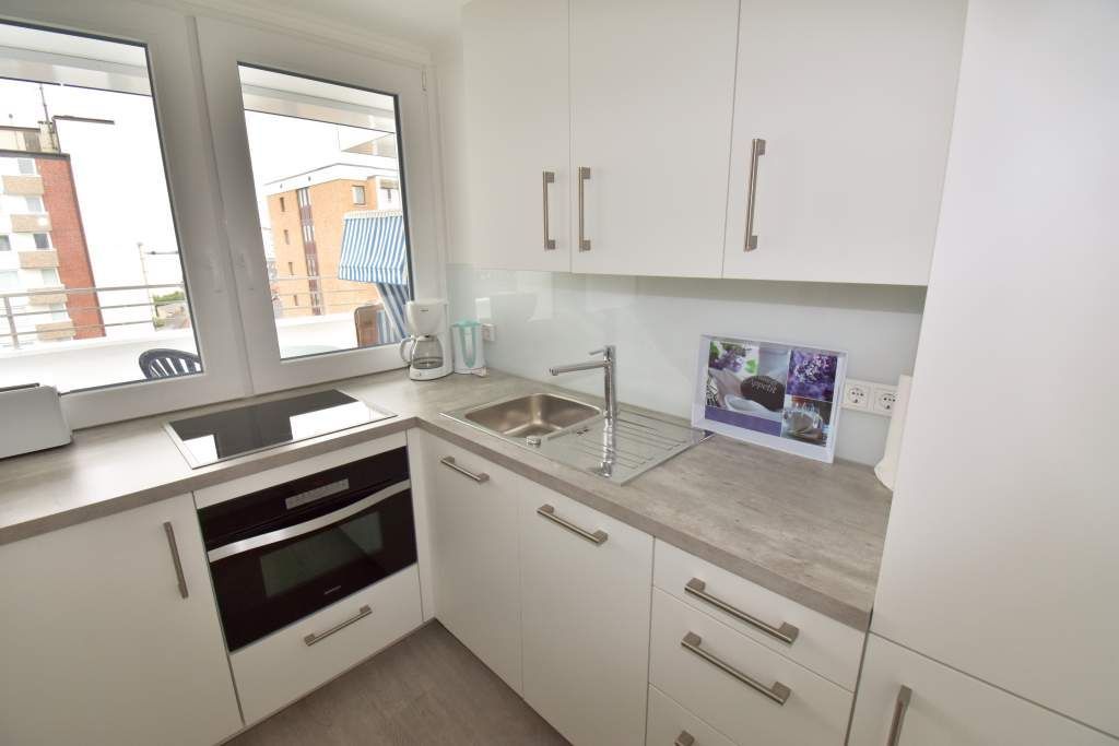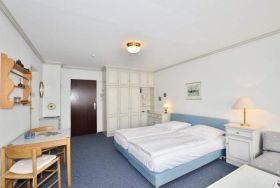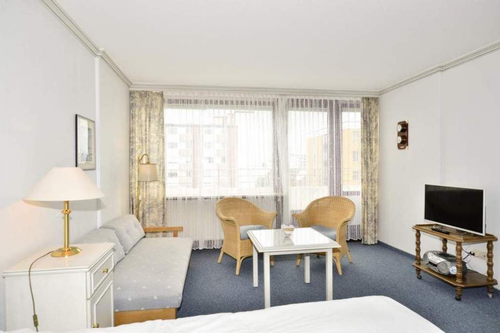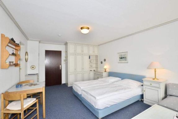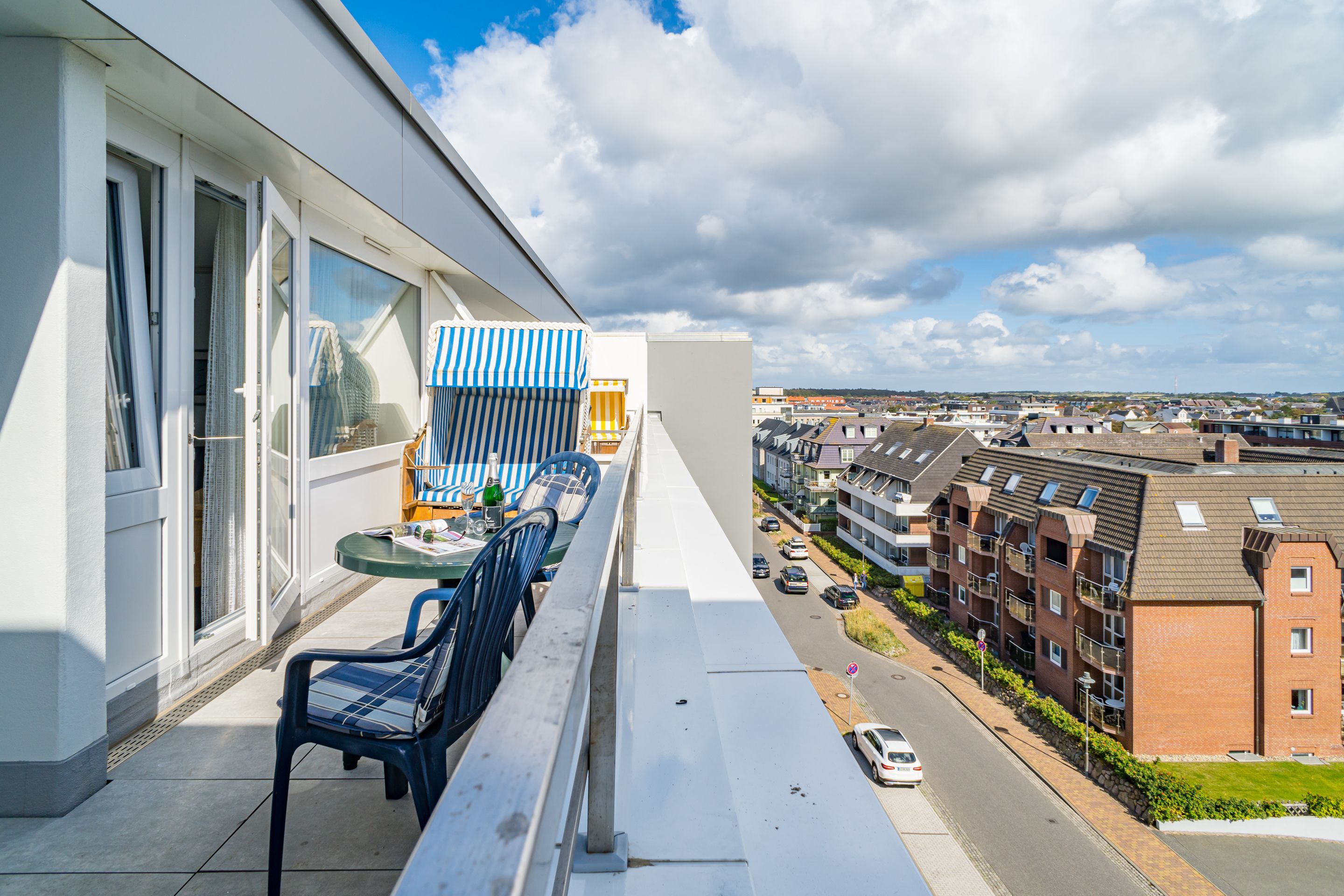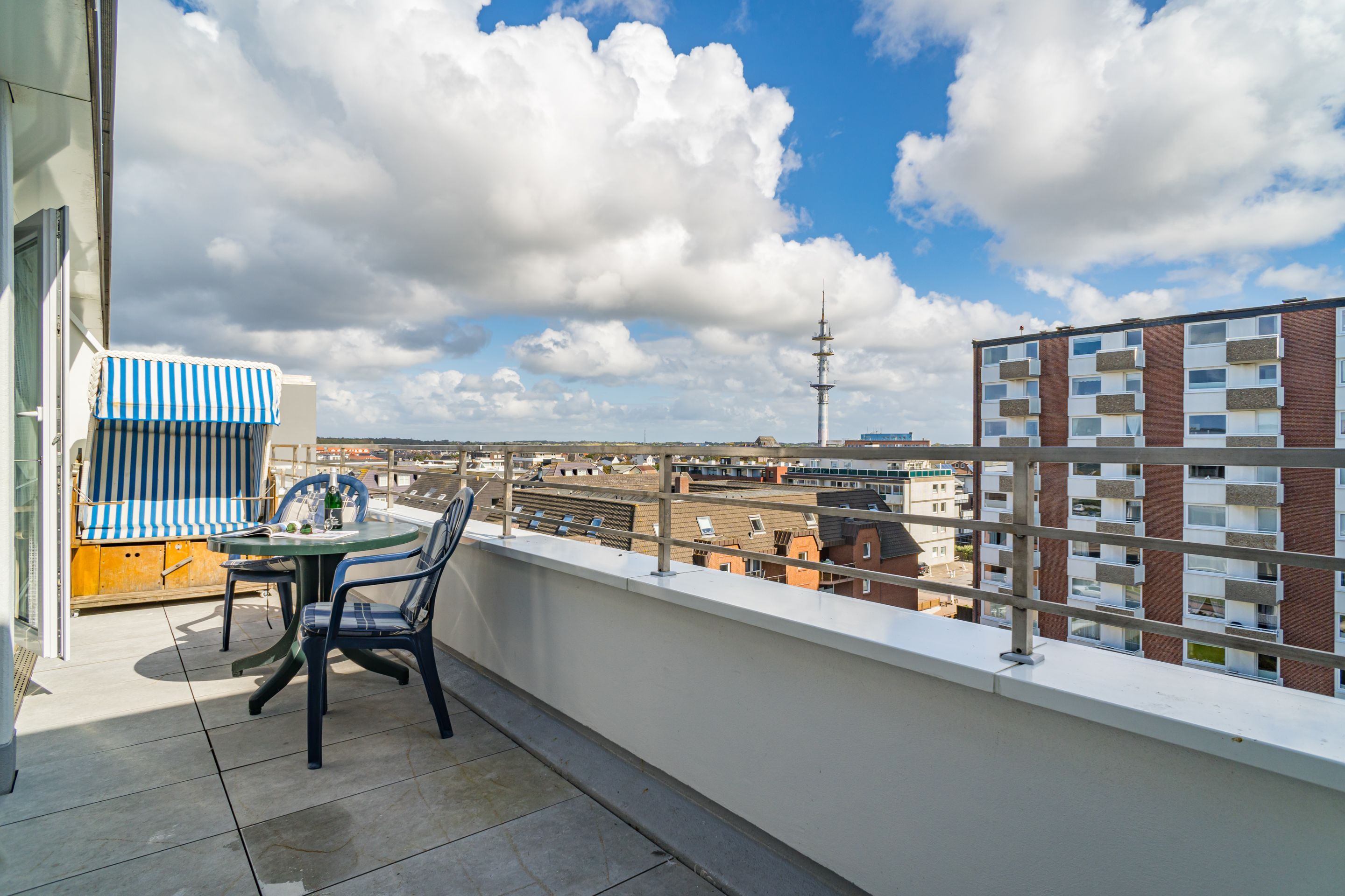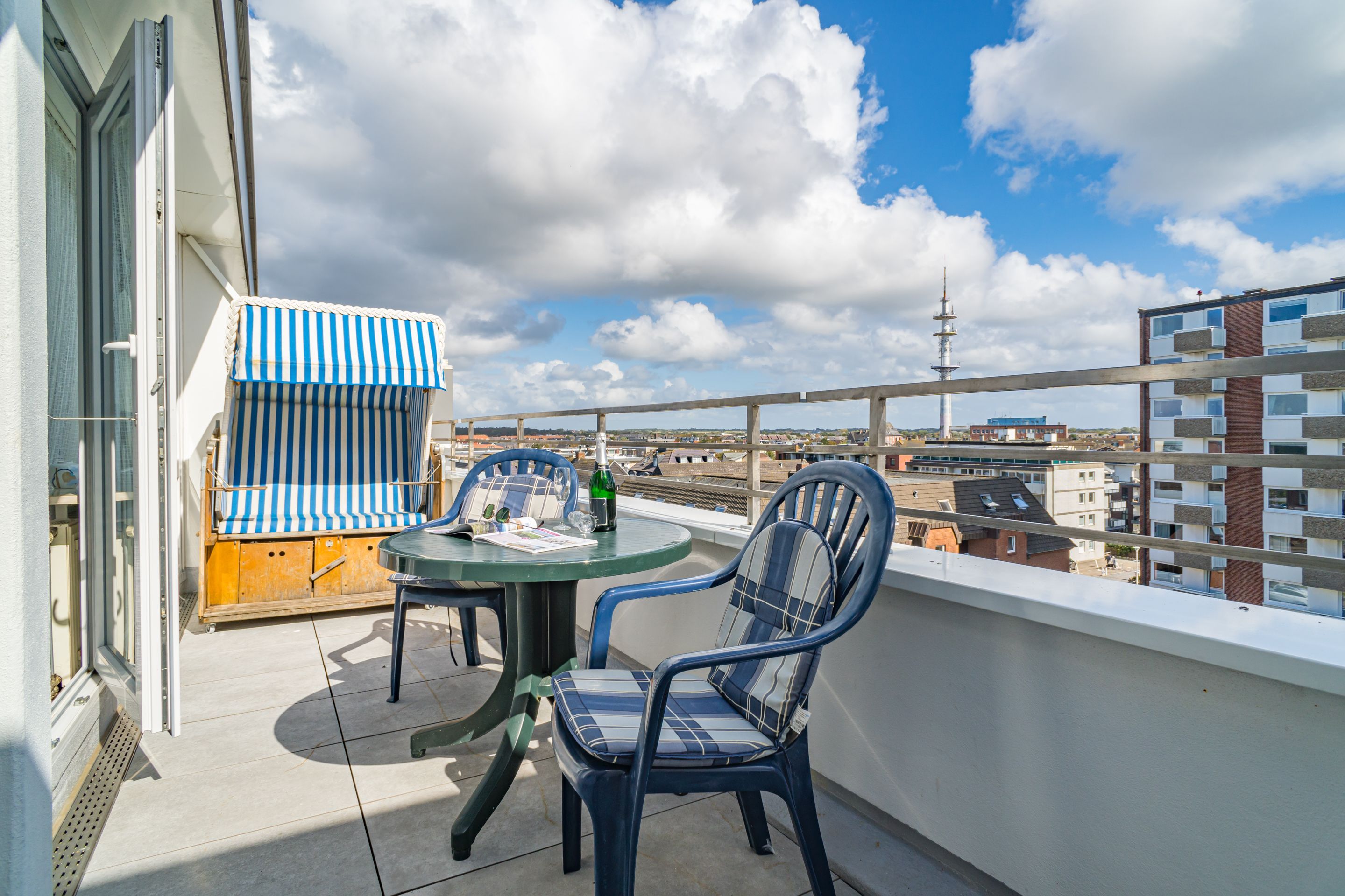 Großzügige 1-Zimmer-Nichtraucher-Ferienwohnung (ca. 43 qm) in der 5. Etage zur Landseite mit Ostdachterrasse (Morgensonne, mit Strandkorb) für max. 2 Personen.