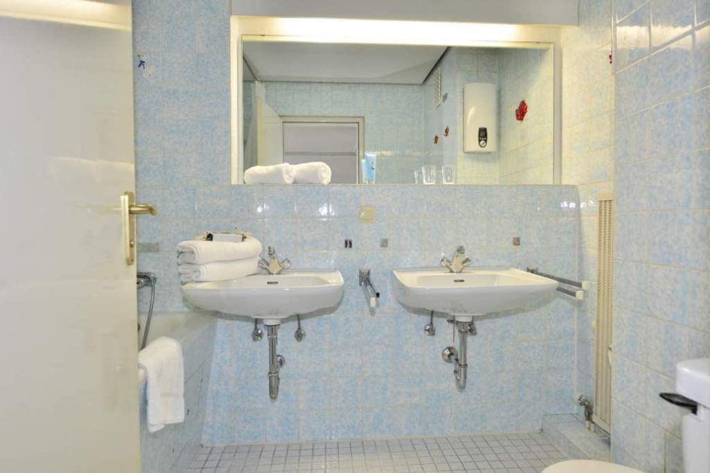 Im Bad befinden sich ein Wannenbad, ein WC und 2 Waschbecken.