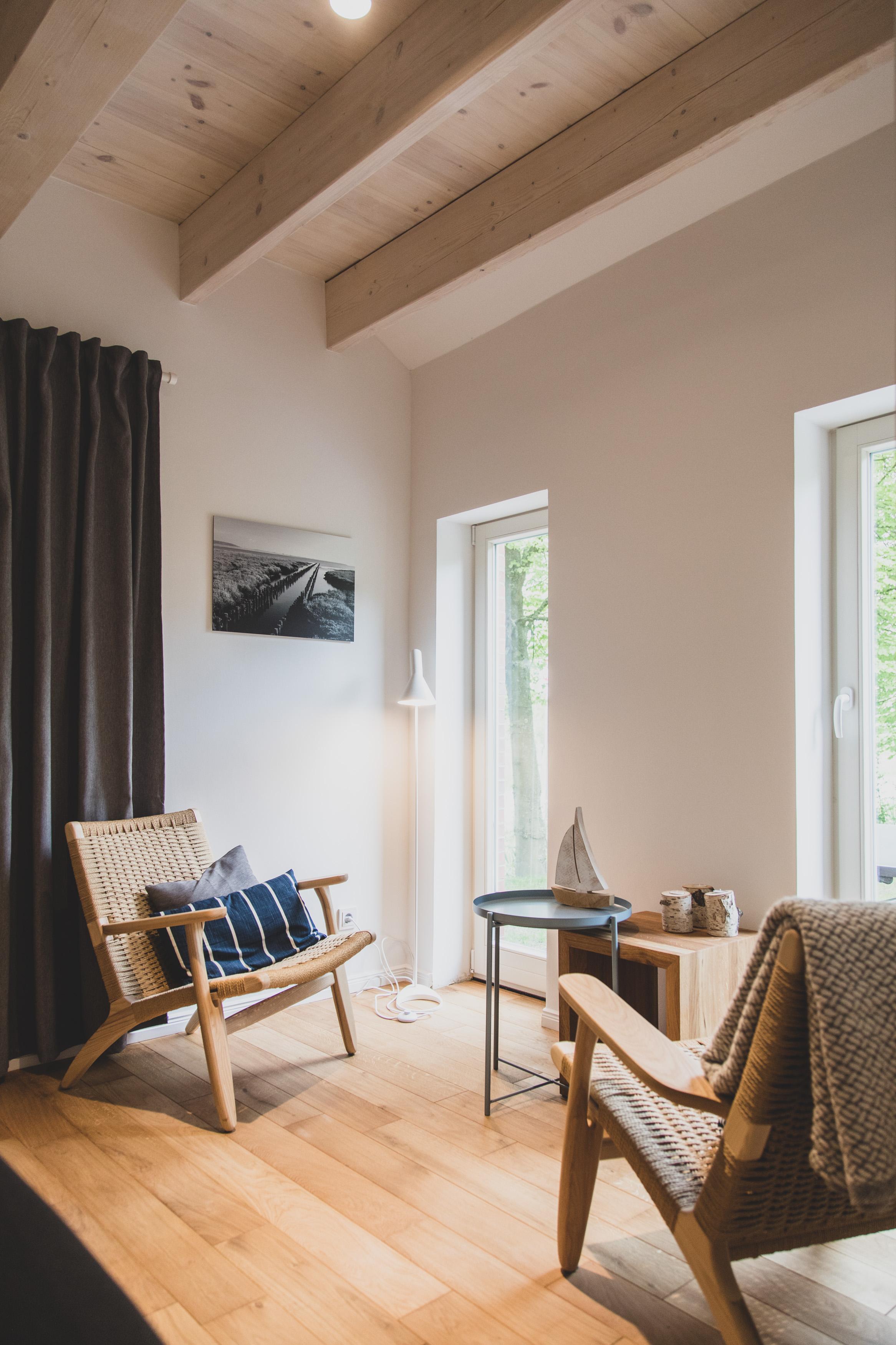 Unsere Wohnungen im Vorderhaus des Ferienhofs verfügen über hohe Decken mit durchgehend erhaltenen alten Deckenbalken. Die historischen Blockrahmenfenster und Fensterläden wurden in Handarbeit neu erstellt und runden den Anblick des denkmalgeschützten Gulfhofs ab. Im ehemaligen Scheunentrakt befinden sich durch bodentiefe Fenster helle und großzügig geschnittene Wohnungen. Alle Ferienwohnungen sind individuell, modern und mit viel Liebe zum Detail eingerichtet und bieten von der Terrasse einen erholsamen Blick auf die Grünflächen mit altem Baumbestand.